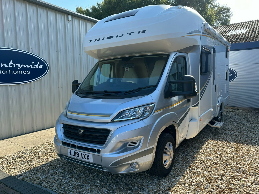 This great family layout from Auto-Trail the Tribute T-726 and a private lights good vehicle. Boasting 6 berths and 6 seats belts with over cab double bed , front dinette which transforms into a double and two fixed rear bunk beds.Side well appointed kitchen with microwave and rear corner bathroom with good size separate shower.A really nice family Motorhome '' We have attempted to make the above description as accurate as possible but please bear in mind that honest mistakes can happen so this description cannot form any part of any future contract. Some items fitted to models on display may be excluded from said contract'' 0 mains & usb sockets, 6 berth, 6 speed manual, 6 travelling seat belts, awning, battery charger, blinds, bunk beds, cab aircon, camera, cruise control, curtains, electric step, flyscreens, fresh water tank, fridge, front dinette, front dinette with travelling seat belts, gas hob, heating, heki roof light, leisure battery, lots of outside storage, lovely original condition, mains hookup, overcab bed, plgv (under 3.5t), rear bunk beds, separate shower, sink, swivel cab seats, waste tank