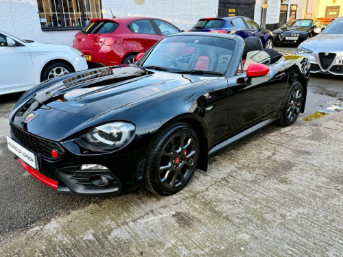 VELOCES ARE PLEASED TO OFFER FOR SALE THIS STUNNING 1-OWNER MANUAL 124 ABARTH. A FULL SPEC EXAMPLE FINISHED IN THE GLOSS BLACK with BLACK & RED LEATHER INTERIOR. A FULL SPEC EXAMPLE WITH OVER £2500 OF FACTORY OPTIONS INCLUDING TOUCH-SCREEN SATELLITE NAVIGATION...VISIBILITY PACK WITH XENON HEADLAMPS, PARKING SENSORS, AUTOLIGHTS & WIPERS + HEADLAMP WASH....BOSE SOUND SYSTEM WITH HEADREST SPEAKERS..THIS ITALIAN STUNNER IS EQUIPPED WITH BILSTEIN SPORT SUSPENSION...SPORTS LIMITED SLIP DIFFERENTIAL AKA ABARTH DAM...6 SPEED GEARBOX ...START ENGINE BUTTON...AUTOMATIC AIR CONDITIONING...SOFT TOP WITH SOUNDPROOF LINER...SPORTS FRONT BUMPER, SIDE SKIRTS AND REAR DIFFUSOR...GREAT SOUNDING RECORD MONZA EXHAUST..DAB RADIO WITH 7 INCH TOUCHSCREEN MEDIA SYSTEM AND 2 USB PORTS... ......17 INCH ABARTH CORSA WHEELS WITH RED BREMBO CALIPERS....RED BUMPER & MIRROR ACCENTS..WINTER PACK WITH HEATED SEATS & MIRRORS..A TRULY OUTSTANDING EXAMPLE WHICH HAS BEEN FULLY SERVICE HISTORY + PRIOR TO SALE WE WILL CARRY OUT A FULL CAMBELT SERVICE.. ASK ABOUT OUR APPLE CARPLAY / ANDROID AUTO & REAR CAMERA UPGRADES..LOW RATE FINANCE AVAILABLE FROM JUST 8.9% APR...NOT TOO BE MISSED.. Navigation System, 12V Power Outlet, 17in Alloy Wheels - Corsa, 2 USB and 1 AUX Ports, 7in Touchscreen with Multimedia Control, A-Pillar and Roll Bar in Forgiato Grey, ABS - Anti-Lock Braking System, Abarth Mechanical Limited Slip Different, Abarth Record Monza Exhaust System, Active Head Restraints, Active Pedestrian Protection, Adjustable Drivers and Passengers Seats, Aerodynamic Abarth Kit, Aha by Harman and Stitcher Internet Radi, Air Conditioning, Airbags - Driver, Airbags - Front Side, Airbags - Passenger, Alcantara Wrapped Instrument Cluster Hoo, Alcantara Wrapped Instrument Panel Bezel, Aluminium Racing Pedals, Bi-Function Halogen Projector Headlights, Black Convertible Roof with Aco