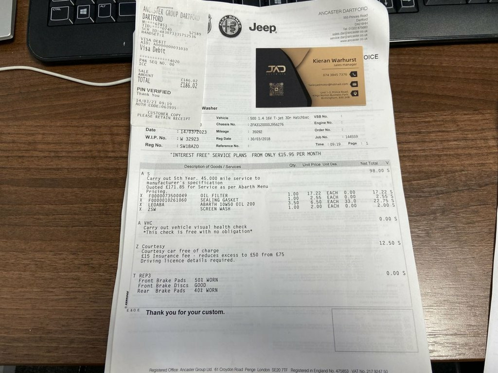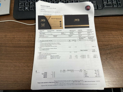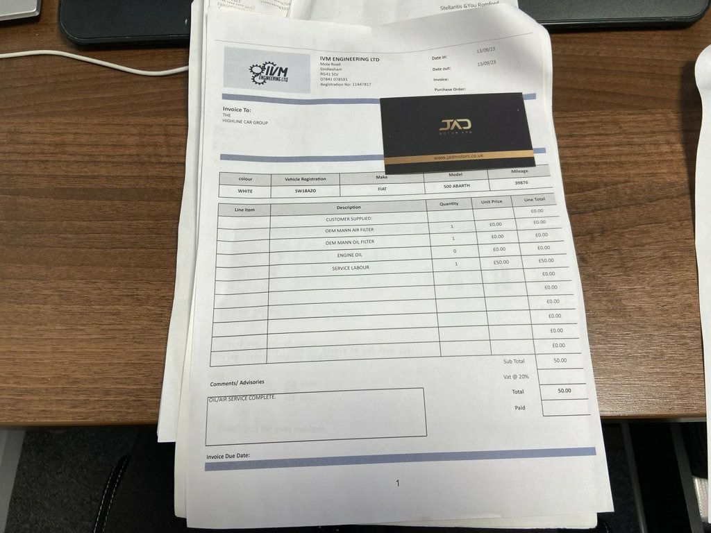 JAD MOTOR would like to proudly present this wonderful 2018 ABARTH 595 1.4L T-JET TURISMO! 2 Keys. 5 Former Keepers. SERVICE: FULL SERVICE HISTORY ( see pics, NOT ALL SERVICES HAVE BEEN STAMPED ) LAST SERVICED AT 51125 MILES & MOT TILL AUG 26 TOO! DESCRIPTION: Exterior: The 2018 Abarth 595 Turismo takes the iconic Fiat 500 shape and transforms it into a performance hatchback with attitude. Its compact dimensions are enhanced by bold Abarth styling, with a more aggressive front bumper, pronounced side skirts, and a rear diffuser that leaves no doubt about its sporting character. The Turismo model features striking 17-inch alloy wheels and the distinctive Abarth badging, making it instantly recognisable. Twin exhaust outlets at the rear provide a purposeful finish, while the subtle roof spoiler enhances both aerodynamics, giving the 595 Turismo a look that is playful, stylish, and performance-driven. Interior: Step inside, and the Abarth 595 Turismo delivers a cabin designed to blend sportiness with Italian flair. The premium leather sports seats offer excellent support while ensuring comfort on longer drives, and they are complemented by contrast stitching that emphasises the car's performance DNA. Aluminium pedals, a flat-bottom leather steering wheel, and Abarth-branded detailing throughout the interior reinforce the racing spirit, while soft-touch materials and chrome accents add a premium feel. The compact dimensions create a driver-focused cockpit, where every co 12V Power Point, 17in Alloy Wheels - Turismo, 5in Touchscreen Radio with Bluetooth - U, ABS - Anti-Lock Braking System, Airbags - Driver, Airbags - Drivers Knee, Airbags - Front Side, Airbags - Passenger, Airbags - Window, Automatic Climate Control, BMC High Performance Air Filter, Back Door 595 Turismo Logo, Black Brake Calipers, Body Colour Front and Rear Bumper Insert, Central Locking - Remote, Closed Glove Box - Net Storage, Dark Tinted Rear Quarter Windows, EBD - Electronic Brakeforce Distribution, Electric Satin Chrome External Mirrors, Electric Windows - Front, Electrically Assisted Power Steering - D, Electronic Stability Control-ASR-Hill Ho, Fix and Go Puncture Repair Kit, Front Fog