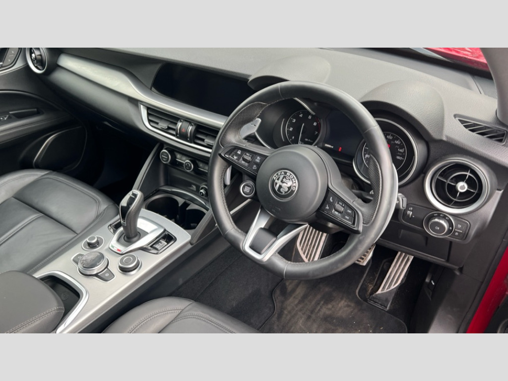 Alfa Romeo STELVIO 2.0 Turbo 200 Sprint 5dr Auto 7 - inch colour TFT instrument cluster, 8.8" screen colour display, Alfa Connect 3D Nav 8.8" Infotainment system (radio, 3D Nav, MP3, aux-in, bluetooth), Alfa connect box, Alfa connected services, Alfa Romeo DNA driving mode selector, Apple car play/Android Auto, Forward collision warning, Front and rear parking sensors, PAS, Rear view camera, Remote tailgate release with key fob button, Rotary pad, Stop/start system, TMC Pro, Trip computer, West European Map, 2 USB Power socket for rear seat, DAB digital audio broadcast, USB and Aux in armrest, 35W Bi-xenon headlamp with AFS function, Alfa romeo assistance sticker, Aluminium tunnel cover, dashboard insert and door handle surround, Automatic headlights with dusk sensor, Automatic rain sensing wipers, Body colour bumpers, Dark glossy front grille V insert, Stelvio Q4 badge, Mirror Caps, Exhaust tips and skid plate, Dark tinted rear windows, Daytime running lights, Electrically adjustable and folding door mirrors, Headlight washers, LED brake lights, LED rear lights, Rear side wing doors, Rear wash/wipe, Sprint badge front wing, Third brake light, Transportation protection cover, Twin chrome exhaust tailpipes, 12V outlet on dashboard, 230V/50hz auxiliary power outlet in trunk, 3 rear seats, Aluminium kick plate, Aluminium metal sport pedals and footrest, Aluminium scuff plates, Aluminium shift paddles on steering column, Black painted interior bezels, Dual zone auto temp control with humidity sensor, English handbook, Front head restraints, Front/rear floor mats, Leather upholstery, Rear climate control vent, Single front passenger seat, Sport leather steering wheel with multifunctional controls and engine start button, Sports leather gear knob, Third rear headrest, Cold weather pack - Stelvio, Electrically adjustable seats pack, 3x3 point rear seatbelts, ABS, Autonomous emergency braking, Electronic parking brake, Electronic stability control, Hill descent control, Integrated brake system, Manual child lock in rear doors, Manual passenger airbag deactivation function, SOS - Emergency Call Button, Traction control, Tyre pressure monitoring system, Alarm system with bonnet and intrusion protection, Immobiliser, Remote central locking, Thatcham vehicle theft alarm with hood protection and intrusion sensor, Monotone wheel centre caps, Summer tyres
