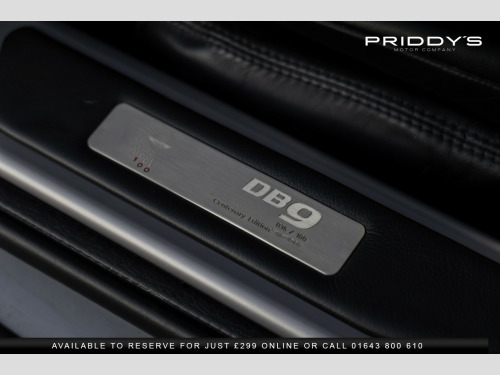 ** This vehicle has recently passed our meticulous pre-purchase inspection and has now arrived on site, where it has undergone a second detailed assessment and extended test drive. The photographs capture the car exactly as it arrived — already presenting beautifully, as only the finest examples ever make it into our selection. It is now undergoing final preparation behind the scenes and will require only light finishing touches before being ready for handover. Given its superb condition and desirability, we recommend reserving early to secure it ahead of other discerning buyers **, , , , , , Autotrader does not currently recognise that this vehicle is the Centenary Edition, which is why its valuation does not reflect the higher specification and rarity of this model. , , Aston Martin doesnt often pause to celebrate itself — which is what makes the DB9 Centenary Edition so special. Built to honour a hundred years of the marque, only one hundred cars across all models were produced, with just thirty-five coupes in existence worldwide. This one is Number 36, a hand-finished, meticulously crafted Centenary DB9, and it arrives with a fully documented Aston Martin main-dealer history from new and only 41,896 miles. For the collector, the enthusiast, or simply someone who wants a DB9 of genuine significance… this is the car. , The Centenary Edition was far more than a badge. Each car received a hand-applied, graduated two-tone finish — a process that added eighteen hours to the build alone — paired with sterling-silver Aston Martin wings set beneath clear enamel. Opening the door reveals numbered silver sill plaques confirming its place in the tiny production run, a detail that instantly separates it from any standard DB9. , Inside, the atmosphere is unmistakably special. Deep-soft Obsidian Black leather — previously exclusive to the One-77 — wraps the seats, dash and doors, finished with crisp silver stitching and beautifully embroidered wings in the headrests. The cream Alcantara headliner lifts the cabin, and the Bang & Olufsen system with its signature rising tweeters is proudly part of the Centenary specification. Heated and memory-adjustable seats for both driver and passenger, reverse camera, cruise control and the classic Aston switchgear complete a cockpit that still feels contemporary, refined and deeply crafted. , Mechanically it is exactly as a DB9 should be. The 6.0-litre naturally aspirated V12 remains one of the great Aston engines — smooth, cultured and effortlessly muscular. Paired with the T-Tronic transmission, it delivers that quintessential DB9 flow: long-legged, powerful and utterly elegant on the road. This example has been maintained exclusively by Aston Martin from new, right through to its most recent visit with us at Priddys, where it received an oil service, inspection and fresh wipers. , A rare chance to own one of the most significant DB9s ever produced — an Aston Martin built to celebrate the brands first century, crafted with details no other DB9 carries, and preserved with main-dealer care from day one. , , *Why Buy from Priddys Motor Company*, , *Carefully Selected Vehicles*
