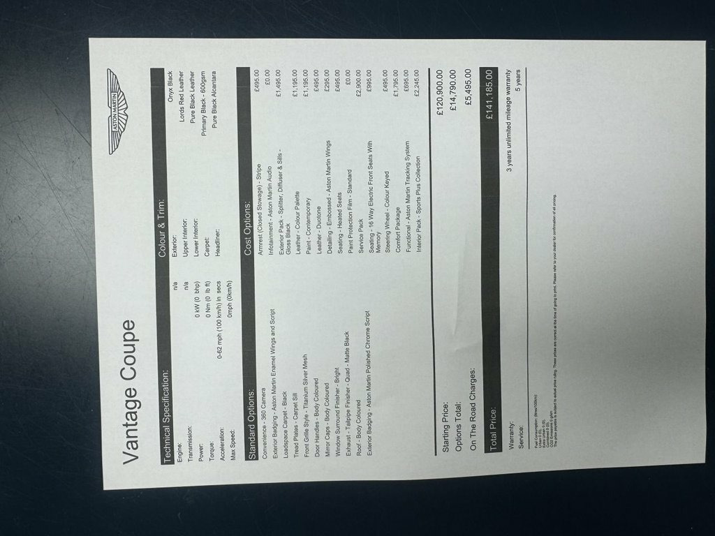 This 2019 Aston Martin Vantage V8 was over £140k new!!! presents a rare opportunity, having been cherished by only two owners since new. Powered by a potent 4.0L petrol engine, this Euro 6 compliant model delivers exhilarating performance. Its sophisticated technology includes front and rear parking sensors, complemented by a 360 degree camera system for effortless manoeuvring. The Vantage also features LED high and low beam headlamps for superior visibility, and the Tech Pack adds BLIS blind spot assistance and keyless entry for added convenience and security. Inside, you will find memory seats, ensuring your perfect driving position is always readily available. The Aston Martin Vantage V8 truly stands out with its remarkable acceleration, achieving 0-60mph in a mere 3.6 seconds. This impressive figure highlights its superior performance capabilities compared to other vehicles in its class. This combination of striking design, advanced technology, and exceptional power makes this Vantage a truly desirable sports car. 20in Alloy Wheels - Vantage - Y Spoke - , ABS - Anti Lock Braking System, ADS - Adaptive Damping System, Airbag - Dual-Stage Driver, Airbag - Dual-Stage Front Passenger, Alarm and Immobiliser, Auto Parking, Automatic Temperature Control with Dual , Base Floor Mats, Blind Spot Monitoring, Bonnet Vents - None, Boot Carpet - Obsidian Black, Brake Calipers - Dark Anodised, Cabin Carpet - Primary, Carpet Sill, Centre Console Open Stowage, Comfort Pack, Decklid Insert - Exterior Body Colour, Door Mirror Caps - Exterior Body Coloure, Door Mirrors - Heated and Electrically R, DSC - Dynamic Stability Control, DTV - Dynamic Torque Vectoring, EBA - Emergency Brake Assist, EBD - Electronic Brakeforce Di