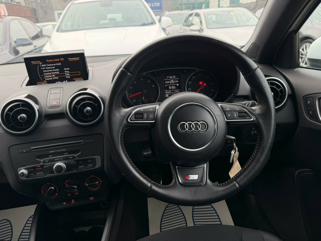 THREE MONTHS WARRANTY, 12 MONTHS MOT, BLUETOOTH, ko v power socket - centre console, 17in alloy wheels - 10-spoke design high gloss, abs - anti-lock braking system, ami - audi music interface, asr - anti slip regulation, aux-in socket, adaptive brake lights, air conditioning, air vent sleeves - high gloss black, airbags - driver, airbags - front passenger, airbags - front side system, airbags - head system, alarm - thatcham category 1, aluminium trim for control switches, ambient lighting, anti theft locking wheel bolts, audi drive select, bluetooth audio streaming, cloth headlining in black, concert radio - mp3-cd player, cup holders - x2 in centre console, dab digital radio, dashboard - black, display screen - 6.5in high gloss black, display screen monochrome - 3.5in dashboard binnacle, door handles - aluminium look trim, door handles - illuminated, door mirrors - body coloured with integrated indicators, door mirrors - electrically adjustable and heated, door sill trims - aluminium with s line logo, door or boot open warning, drivers information system - dis, ebd - electronic brakeforce distribution, edl - electronic differential lock, esp - electronic stability programme, efficiency program in the drivers information system - dis, electric windows - front and rear, first aid kit, floor mats, front fog lights, front passenger airbag deactivation switch, front reading lights, front sports seats, gear knob - leather sports with aluminium trim, glovebox - illuminated, handbrake grip - black leather, head restraints - rear, headlights - automatic adjustment, headlights - bi-xenon plus, headlights - dynamic range control, headlights washers, heat insulating glass - windscreen and side windows, heated rear windscreen, heated windscreen washer jets, isofix child seat preparation for rear seats with top tether, illuminated footwell lighting, illuminated front door armrests, illuminated vanity mirrors, immobiliser, led daytime running lights, led interior light package, led rear lights, luggage compartment - led light, manually adjustable lumbar support in front seats, mobile telephone preparation - bluetooth interface, non-smoking package, outside temperature display, platinum grey rear bumper diffuser insert, polished tailpipes, pollen filter, power steering, reflected lighting for centre console, remote central locking with 2 fold away keys, s line badges on wings, s line body styling, s line roof spoiler, sd card reader x2, satellite navigation system - preparation, seat belt reminder for all seats, seats - front height adjustment, seats - front with embossed s line logo, secondary collision brake assist, speakers x6 - front and rear, split-folding rear seats, steering wheel - 3-spoke leather - multi-function - sports, steering wheel - height and reach adjustable, steering wheel - multi-function, suspension - s line, tool kit and car jack, tow away protection and interior monitoring, traction control, tyre pressure monitoring system, tyre repair kit, usb connection, voice control - telephone, warning triangle, washer fluid level indicator