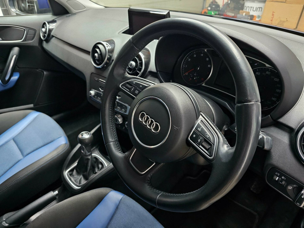 Kingston Cars and Vans present this nice clean Audi A1 1.4 TFSI CoD Sport Euro 5 (s/s) 5dr in one of the best colour combo and Huge Spec of options ,Genuine Mileage and Excellent 1.4l petrol engine, Full Service History , Last Service done 350 miles ago , MOT until September/2026, Very stylish A1 1.4 l with wonderful colour , Fantastic Engine and Nice and Smooth 6 Speed Manual Gearbox. Finished in stunning Scuba Blue Metallic with Half Blue Sports Leather Seats and Aluminium dashboard trim, Sport spec includes: Unmarked 17'' 10 arm Design Bi Colour Alloy wheels with Four Nearly New Tires, Multifunction leather steering wheel, Cruise Control, Navigation Audi Infotainment & Music Interface, Bluetooth connectivity, Sports front seats with height adjustment, Audi MMI System, DAB digital Radio, Day running Lights , Stability and traction control ,Audi anti theft alarm and immobilizer ,Electric windows, Electronic Air Condition ,Electrically /Adjustable/ Heated door mirrors, Remote central locking ,Tool kit, Spare Wheel, All documents and User handbooks, Set of 2 remote keys etc. Covered just 58k genuine miles with full Service History ,The vehicle is Completely Original and Unmodified, Excellent exterior condition, very nice and clean non smoking interior, Powerful and economical 1.4l petrol engine with 125 Bhp, Vehicle can return 67 MPG on a long run and drives superbly, HPI Checked and clear with certificate ,Road tax is £35 per year and can be purchase online,3 months parts and labor Warranty by Autoguard Warranty included in the price, P/X welcome,Viewing by appointment so please call or mail us, for more stock please visit our website-www.kingstoncarsandvans.co.uk v power socket - centre console, abs - anti-lock braking system, ami - audi music interface, asr - anti slip regulation, aux-in socket, adaptive brake lights, air conditioning, air vent sleeves - high gloss black, airbags - driver, airbags - front passenger, airbags - front side system, airbags - head system, alarm - thatcham category 1, aluminium trim for control switches, anti theft locking wheel bolts, audi drive select, bluetooth audio streaming, concert radio - mp3-cd player, cup holders - x2 in centre console, dab digital radio, dashboard - black, daytime running lights, display screen - 6.5in high gloss black, display screen monochrome - 3.5in dashboard binnacle, door handles - aluminium look trim, door mirrors - body coloured with integrated indicators, door mirrors - electrically adjustable and heated, door sill trims with aluminium inlay, door or boot open warning, drivers information system - dis, ebd - electronic brakeforce distribution, edl - electronic differential lock, esp - electronic stability programme, efficiency program in the drivers information system - dis, electric windows - front and rear, first aid kit, floor mats, front fog lights, front passenger airbag deactivation switch, front sports seats, gear knob - leather sports with aluminium trim, glovebox - illuminated, halogen headlights, handbrake grip - black leather, head restraints - rear, headlining - titanium grey cloth, heat insulating glass - windscreen and side windows, heated rear windscreen, heated windscreen washer jets, isofix child seat preparation for rear seats with top tether, immobiliser, manually adjustable lumbar support in front seats, mobile telephone preparation - bluetooth interface, non-smoking package, outside temperature display, polished tailpipes, pollen filter, power steering, remote central locking with 2 fold away keys, sd card reader x2, satellite navigation system - preparation, seat belt reminder for all seats, seats - front height adjustment, secondary collision brake assist, speakers x6 - front and rear, split-folding rear seats, sport suspension, steering wheel - 3-spoke leather - multi-function - sports, steering wheel - height and reach adjustable, steering wheel - multi-function, tool kit and car jack, tow away protection and interior monitoring, traction control, tyre pressure monitoring system, tyre repair kit, usb connection, voice control - telephone, warning triangle, washer fluid level indicator, audi sound system, satellite navigation system - sd card based, audi hill hold assist, 17in alloy wheels - 5-arm design bi-colour, light and rain sensor package, electronic climate control, tornado cloth - laser blue, rear floor mats