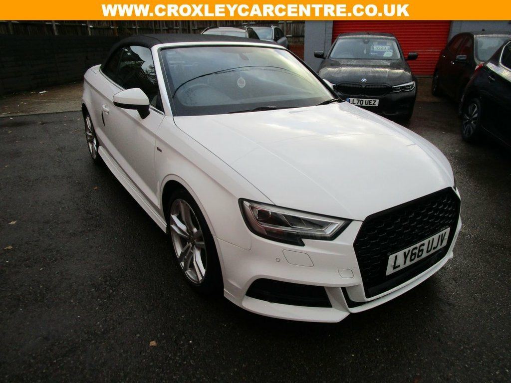 Croxley Car Centre are pleased to offer this great example of the Audi A3 S-Line Convertible. A 2016 (66 registration) 1.4ltr Petrol Automatic 2 door in White covered only 51300 miles and supplied with a excellent service history, (6 stamps in total) main dealer/independent with a cambelt change having been carried out at 24993 miles. Coming with great features including heated front seats. Tailored finance packages available, part exchange welcome and we do not charge any admin fee's. Glacier White, Seats - Heated Front, 18in Alloy Wheels - 5-Parallel Spoke Des, 2 x USB Charging Ports and 1 x AUX-IN, Acoustic Hood - Fully Automatic, Active Bonnet, Active Roll-Over Protection System, Adaptive Brake Lights, Air Vents - Aluminium Look, Airbags, Aluminium Interior Elements, Aluminium Window Trims, Anti Theft Locking Wheel Bolts, Anti-Theft Alarm, Audi Connect Infotainment Services - 3 M, Audi Drive Select, Audi Smartphone Interface, Black Hood, Bluetooth Interface, Body Coloured Door Mirrors, CD Drive, Chrome-Plated Exhaust Tailpipe Trim, Cloth Headlining in Black, Colour Drivers Information System - DIS, Cruise Control, Cupholders, DAB Digital Radio, Door Mirrors - Electrica