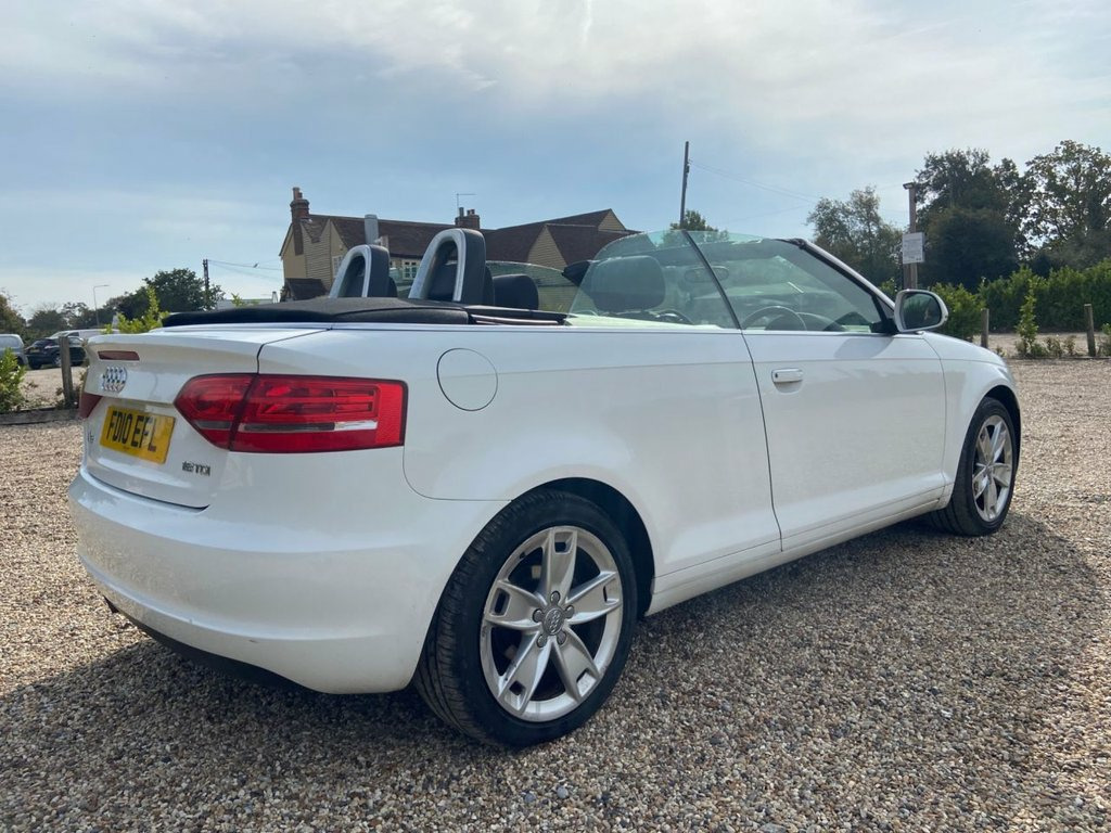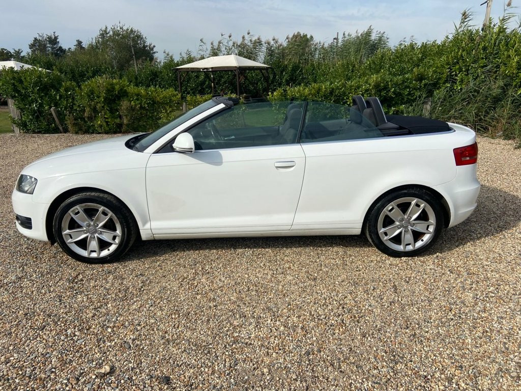 Introducing our Audi A3 Cabriolet finished in a Ice white this example has covered just 85,000 miles and comes with great service history 2 keys logbook and owners manual present. Just been serviced and mot with no advisories. Great driving car engine sounds as it should goes through the gears with ease. Bodywork in good condition and interior clean with no rips or bad odours. Roof works as it should. Spec includes AC, front and rear heated screens. Warranty included. All our cars undergo an extensive PDI check and a 50 mile road test to assure they perform as expected. Call now to arrange your viewing! Cloth- Dynamic- Black & Silver, Comfort Pack Cabriolet, Audi Exclusive Controls Pack, Aluminium gear knob, First aid kit, Audi Exclusive- Steering Wheel, Black styling Pack, 17in 10Spoke V Design Alloy Wheels- High, 17in 5 arm kinetic design Alloy Wheels, 17in 5Spoke Star design Alloy Wheels, 3Spoke Leather Sports Steering Wheel, Aluminium door handle strips, Aluminium roll bars, Aluminium shoulder line Trim, Black headlining, Concert single CD player with MP3 facili, Deletion of model & engine designati, Medial Aluminium inlay, Non smoking Pack, Silver headlining