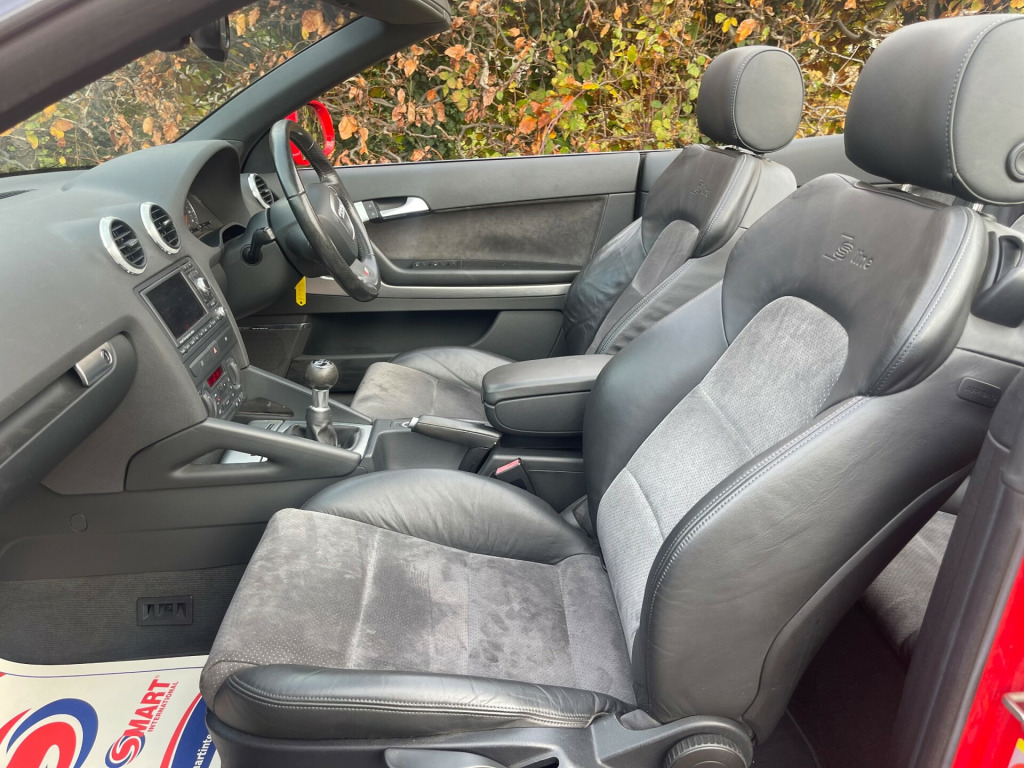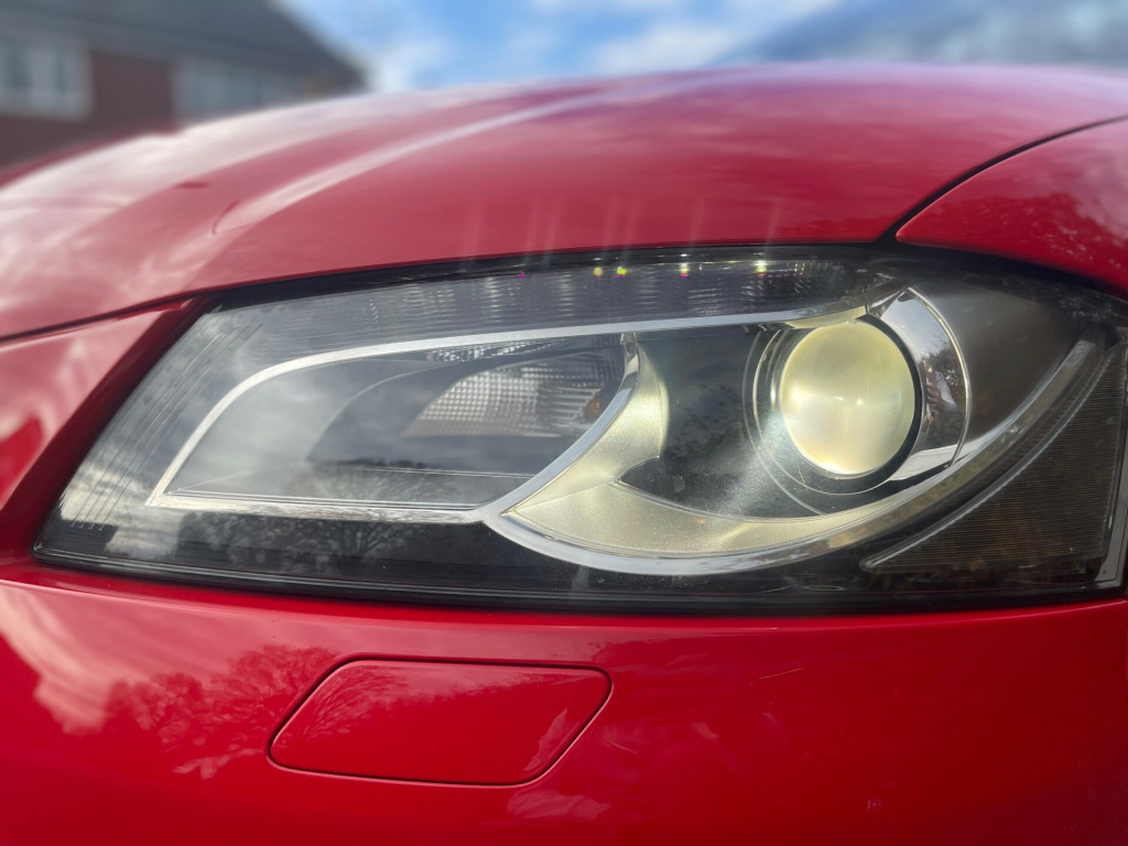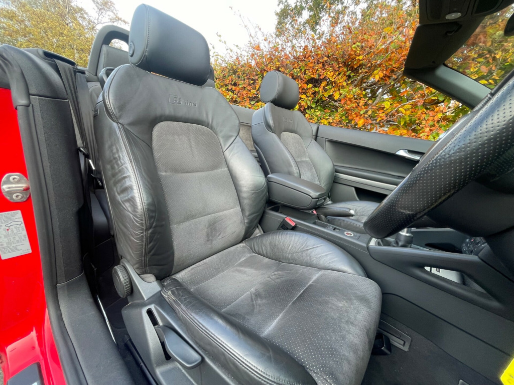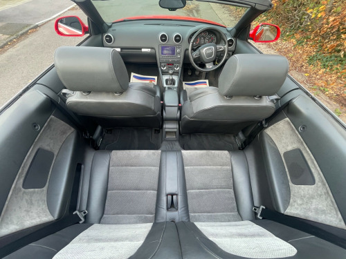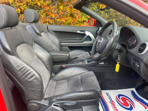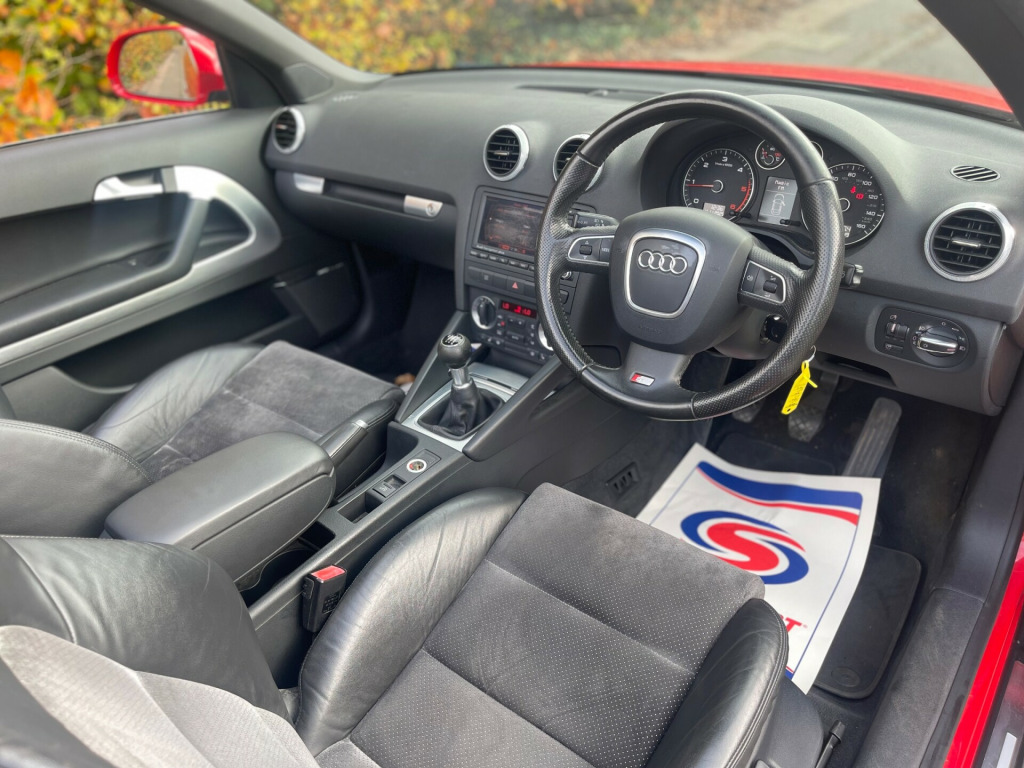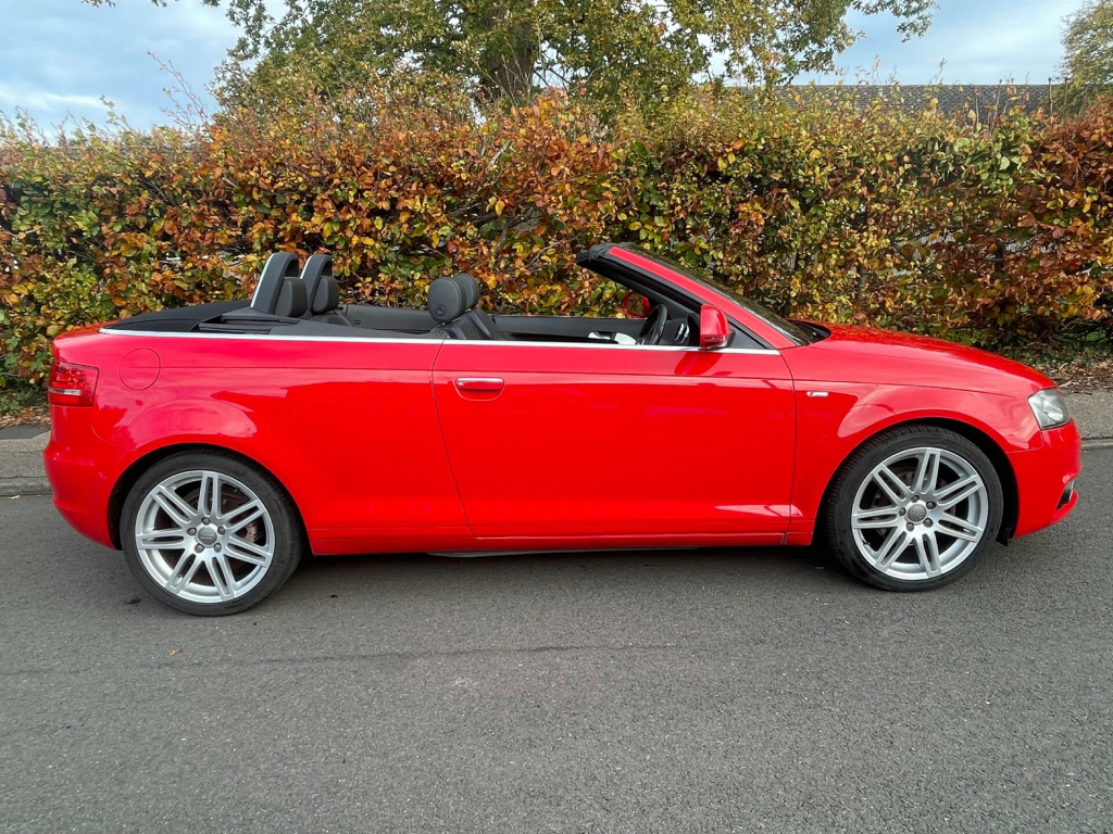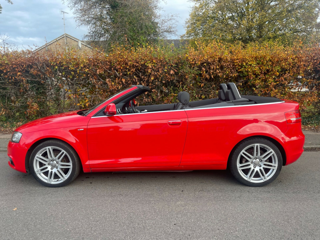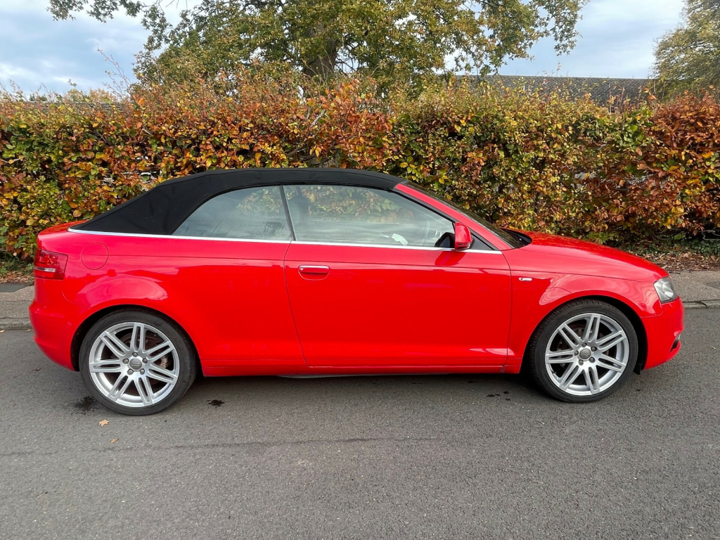 Audi A3 Cabriolet 2.0 TDI S line finished in Misano Red. Only 48,500 miles by two owners ( the first was Audi ) Massive specification with many factory options including Adaptive xenon lights , LED running day lights , Leather alcantara heated seats , Colour satellite navigation , Rear parking Sensors , Bose speakers , Auto lights and wipers , Power folding mirrors , Unmarked alloy wheels , Remote central locking , Power hood , 2x remote keys. This car is in excellent condition throughout and drives superb , I welcome any independent inspection and a 3 month warranty is included. uetooth, bose, excellent condition, heated steering wheel, leather alcantara, led lights, low mileage, parking sensors, power folding mirrors, satellite navigation, xenon lights