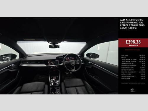 1.0 TFSI 30 S line Sportback S Tronic finished in desirable S line specification, featuring 18in alloy wheels, LED headlights with dynamic rear indicators, privacy glass, and S line styling. The interior includes Audi Virtual Cockpit, MMI Navigation Plus with touchscreen, Apple CarPlay and Android Auto, Bluetooth, DAB radio, and dual-zone climate control. Equipped with cruise control, rear parking sensors, lane departure warning, Audi Pre-Sense front, and Audi Drive Select. A well-equipped example offering sporty styling, modern technology, and excellent efficiency. 12v Socket and Storage Compartment in Fr, 18in Alloy Wheels - 5-Arm Dynamic Design, 2 USB-C Ports with Charge and Data Funct, 6 Passive Loudspeakers, Airbags - Driver and Front Passenger wit, Aluminium Interior Elements, Aluminium Window Trims, Anti Theft Locking Wheel Bolts, Anti-Theft Alarm, Audi Connect Emergency Call and Service, Audi Connect Navigation and Infotainment, Audi Drive Select, Audi Pre-Sense Front with Pedestrian and, Audi Smartphone Interface, Audi Virtual Cockpit, Auto Dimming and Frameless Rear View Mir, Automatic Start-Stop System with Recuper, Bluetooth Interface, Body Coloured Door Mirrors, Cloth Headlining in Black, Collision Avoidance Assistant, Cruise Control, DAB D