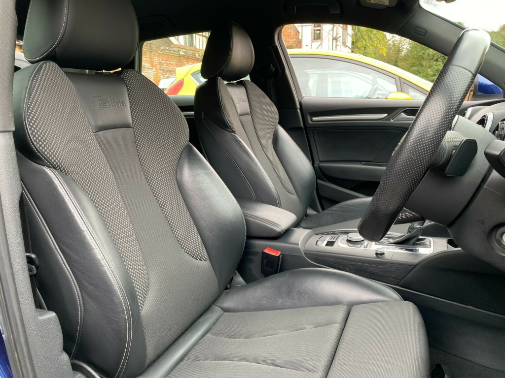 WJF Cars are pleased to have up for sale this lovely 2 owner from new Audi A3 S-Line 1.4 TFSI S Tronic in scuba blue metallic. This has been a well looked after example and will come with a fresh service & MOT.With the combination of the nippy 1.4 TFSI engine and the precise German engineered S Tronic gearbox this car drives fantastically and smooth.HPI CLEAR - ULEZ COMPLIANT - 2 KEYS - £20 ROAD TAX - FRESH SERVICE & MOTIf you would like to come and view this lovely Audi A3, Please call Tony or Chris on 07967 590989 or 01462 457766. v power socket - centre console, 12v power socket - rear, ami - audi music interface, dab digital radio, display screen colour - 5.8in, mmi radio, mobile telephone preparation - bluetooth interface, preparation for sd card-based navigation system, sdhc card reader x2, speakers x8, usb connection, 18in alloy wheels - 5-parallel spoke design partly polished, anti theft locking wheel bolts, chrome-plated exhaust tailpipe trim, door mirrors - body coloured with integrated led indicators, door mirrors - electrically adjustable and heated, electric windows - front and rear, exhaust tailpipe - twin, fog lights - high gloss black surrounds, heated rear windscreen, heated windscreen washer jets, led rear indicators, model and engine technology badges at rear, radiator grille - high gloss black, s line badges on front wings, s line body styling, s line design front and rear bumpers side grilles and dffusers in platinum grey, s line design front bumper-rear diffuser-side sills and roof spoiler, space saver spare wheel, window surrounds - aluminium, abs - anti-lock braking system, asr - anti slip regulation, active bonnet, adaptive brake lights, airbags - driver, airbags - drivers knee, airbags - front passenger, airbags - front side, airbags - head level side for front and rear, alarm - thatcham category 1, ebd - electronic brakeforce distribution, esp - electronic stability programme, electromechanical parking brake, first aid kit, front passenger airbag deactivation switch, hydraulic brake assist, isofix child seat mounting for front passenger and rear outer seats, multi collision brake assist, remote central locking with 2 fold away keys, seat belt reminder for all seats, secondary collision brake assist, warning triangle, air vent sleeves - aluminium look, aluminium interior elements, car jack, cloth headlining in black, coat hooks - b pillar - both sides, cup holders - rear x2, cup holders - x2 in centre console, door sill trims with s line logo, dual-zone electronic climate control, front centre armrest, front sports seats, front and rear floor mats, gear knob - perforated leather, height adjustable boot floor, illuminated vanity mirrors, inlays - matt brushed aluminium, interior lighting, luggage compartment - lashing points x4, luggage compartment - side net, rear parcel shelf removable, seats - convenience entry - enhanced front folding function, seats - front height adjustment, seats - split folding rear - 60-40, smoking package, steering wheel - 3-spoke leather-flat bottomed-shift paddles, steering wheel - height and reach adjustable, steering wheel - multi-function, storage compartment under rear seat, storage compartments in the door side trims-centre console-under front passenger seat, storage net in front passenger footwell and front seat backrests, storage and luggage package, sun visors - with covered vanity mirrors, tool kit, audi drive select, colour drivers information system - dis, edl - electronic differential lock, electromechanical power steering, rest recommendation system, sport suspension, tyre pressure monitoring system, voice control - navigation, washer fluid level indicator, daytime running lights, front fog lights, headlights - automatic dynamic range control, headlights - bi-xenon plus, headlights washers, led daytime running lights, led rear lights