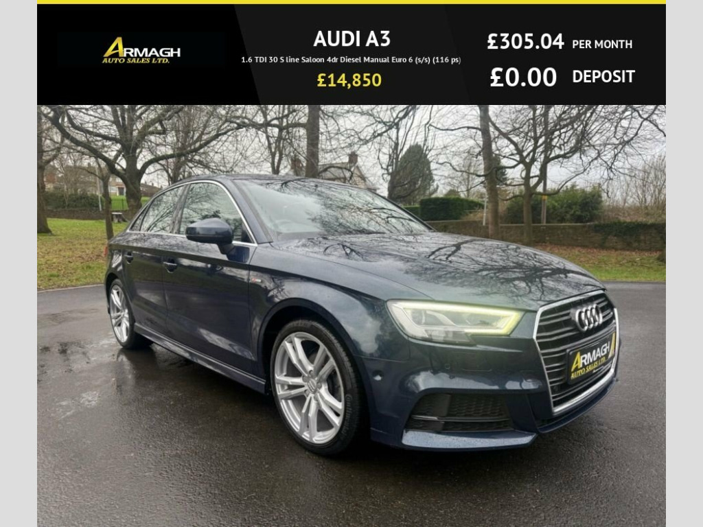 AUDI A3 1.6 TDI 30 S LINE SALOON 115BHP 4DR ??2018??56,394MILES??£14,850 ????IN STUNNING COSMOS BLUE PAINT ????REGISTERED 11/12/2018 ????MOT EXPIRES 01/01/2027 ????FULL SERVICE HISTORY ????AUDI CONNECT ????AUDI DRIVE SELECT ????LED INTERIOR LIGHT PACK ????PARK ASSIST ????AUDI SMARTPHONE INTERFACE ????7" COLOUR MMI SCREEN ????S LINE BODY STYLING ????XENON HEADLIGHTS ….AND MUCH MORE ? EXTENDED WARRANTY OPTIONS AVAILABLE ? FINANCE AVAILABLE ?? CLICK AND DELIVER AVAILABLE ON REQUEST ???? ALL CREDIT/DEBIT CARDS ACCEPTED ???? ALL TRADE INS WELCOME ??OFFICE:02837528557 ????SHANE:07470186374 OR CALL IN AND SEE US???? 57 LISANALLY LANE ARMAGH BT617HF ????ALL FINANCE PACKAGES CAN BE ADJUSTED TO SUIT YOUR BUDGET???? ???????? ???????? https://www.armaghautosalesltd.co.uk/finance-application/7566328/apply?deposit=0&reference=01ac3a45-ee8c-42a8-a380-d36e18a277d0&term=60&mileage=0&facility_type=HP&credit_rating=excellent 18in Alloy Wheels - 5-Parallel Spoke Des, 2 x USB Charging Ports and 1 x AUX-IN, 6-Airbag System with Knee Airbag for Dri, Aluminium Interior Elements, Aluminium Window Trims, Anti Theft Locking Wheel Bolts, Anti-Theft Alarm, Audi Connect, Audi Connect Infotainment Services - 3 M, Audi Drive Select, Audi Smartphone Interface, Audi Sound System, Auto-Dimming Rear-View Mirror with Light, Bluetooth Interface, Body Coloured Door Mirrors, CD Drive, Chrome-Plated Exhaust Tailpipe Trim, Cloth Headlining in Black, Colour Drivers Information System - DIS, Cruise Control, DAB Digital Radio, Door Mirrors - Electrically Adjustable a, Dual-Zone Electronic Climate Control, ESC - Electronic Stabilisation C