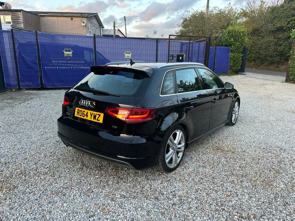 HERE AT MID-KENT VAN CENTRE WE ARE DELIGHTED TO OFFER THIS 2014 (64) AUDI A3 2.0 TDI S line Sportback 5dr Diesel Manual Euro 6 (s/s) (184 ps) WITH AROUND 110,000 MILES FROM NEW. ****** GREAT SPECIFICATION INCLUDING: Technology Package with Mobile telephone preparation - High with Audi Connect, Fine Nappa leather, Bang & Olufsen sound system, Comfort package, Advanced key, Adaptive headlights with Xenon Plus headlights, Reversing camera, Heated front seats, Parking system plus, front and rear with selective display, Interior Light Pack. ****** ALL VEHICLES ARE SUPPLIED BY US. WE TAKE HUGE PRIDE IN OUR VEHICLES AND FOCUS ON ENSURING OUR CUSTOMERS RECEIVE THE VERY BEST SERVICE. ****** PLEASE NOTE THIS VEHICLE IS SOLD AS PART-EX TO CLEAR, NO WARRANTIES ARE IMPLIED OR GIVEN, NO FINANCE IS AVAILABLE ON THIS VEHICLE. ****** PLEASE CALL A MEMBER OF OUR SALES TEAM NOW FOR MORE INFORMATION. Mythos Black, Reversible Luggage Compartment Mat, Audi Hill Hold Assist, Interior Light Package, Electrically Adjustable 4-Way Lumbar Sup, Audi Parking System Plus with Park Assis, Aluminium Roof Rails, Heated Front Seats, Extended Interior Elements Mono Pur, Headlights - Adaptive with Xenon Plus, Advanced Key, Comfort Package, Bang and Olufsen Sound System, Rear-View Camera, Fine Nappa Leather - Black, Technology Package with Mobile Telephone, Door Mirrors - Heated-Electrically Adjus, 12V Power Socket - Centre Console, 12V Power Socket - Rear, 18in Alloy Wheels - 5-Parallel Spoke Des, ABS - Anti-Lock Braking System, AMI - Audi Music Interface, ASR - Anti Slip Regulation, Active Bonnet, Adap