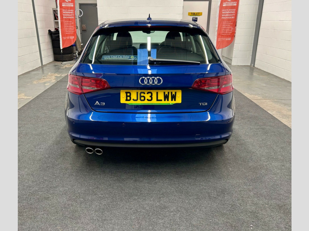 Viewings by appointment . + . Nationwide delivery available . + . See our walk around video. This 2013 Audi A3 TDI Sport presents an exceptional opportunity with its remarkably low mileage of just 74,226 miles for its age, coupled with only two previous owners. This well maintained example features a powerful yet efficient 2.0 litre diesel engine and is presented in the desirable Sport trim. Inside, you will find comfortable leather seats in black, and the convenience of a Bluetooth interface for mobile telephone preparation, allowing for hands free calls. For added ease, it includes Rear parking sensors, SatNAv and so much more.The driving experience is further enhanced by the dual zone electronic climate control, ensuring comfort for all occupants. This Audi A3 TDI Sport offers a brisk acceleration of 0-62mph in just 8.7 seconds, demonstrating its performance capabilities. Furthermore, the generous boot space provides ample room for luggage or shopping, making it a practical choice for everyday use and longer journeys. These features collectively highlight how this particular A3 stands out from other similar vehicles on the market.All of our strict PDI processes have been completed, signed off along with certificates and its also received a fresh service by us so it's ready to go . + . Please view our website to see what we offer as a dealership along with details of our processes to ensure peace of mind motoring for all of our customers . + ., v power socket - centre console, 17in alloy wheels - 5-arm design, abs - anti-lock braking system, ami - audi music interface, asr - anti slip regulation, active bonnet, adaptive brake lights, air vent sleeves - aluminium look, airbags - driver, airbags - drivers knee, airbags - front passenger, airbags - front side, airbags - head level side for front and rear, alarm - thatcham category 1, aluminium interior elements, anti theft locking wheel bolts, audi drive select, car jack, child locks - manual, chrome-plated exhaust tailpipe trim, cloth headlining, coat hooks - b pillar - both sides, colour drivers information system - dis, daytime running lights, display screen colour - 5.8in, door mirrors - body coloured with integrated led indicators, door mirrors - electrically adjustable and heated, door sill trims, dual-zone electronic climate control, ebd - electronic brakeforce distribution, edl - electronic differential lock, esp - electronic stability programme, electric windows - front and rear, electromechanical parking brake, electromechanical power steering, exhaust tailpipe - chrome plated, exhaust tailpipe - twin, first aid kit, fog lights - chrome surrounds, front centre armrest, front fog lights, front passenger airbag deactivation switch, front sports seats, front and rear floor mats, halogen headlights, heated rear windscreen, heated windscreen washer jets, height adjustable boot floor, hydraulic brake assist, isofix child seat mounting for front passenger and rear outer seats, inlays - aluminium mistral, interior lighting, luggage compartment - lashing points x4, mmi radio, mobile telephone preparation - bluetooth interface, multi collision brake assist, preparation for sd card-based navigation system, rear parcel shelf removable, remote central locking with 2 fold away keys, rest recommendation system, roof spoiler - painted in body colour with aerodynamic inserts in high-gloss black at the side, sd card reader, seat belt reminder for all seats, seats - convenience entry - enhanced front folding function, seats - front height adjustment, seats - split folding rear - 60-40, secondary collision brake assist, smoking package, space saver spare wheel, speakers x8, spoiler - body coloured, spoiler - roof, sport suspension, steering wheel - 3-spoke leather - multi-function - sports, steering wheel - height and reach adjustable, steering wheel - multi-function, storage compartments in the door side trims-centre console-under front passenger seat, sun visors - with covered vanity mirrors, tool kit, voice control - navigation, warning triangle, washer fluid level indicator, window surrounds - aluminium, audi parking system rear with acoustic indicators, audi sound system, satellite navigation system - sd card based, audi hill hold assist, speed limit display, milano leather - sports seats - black