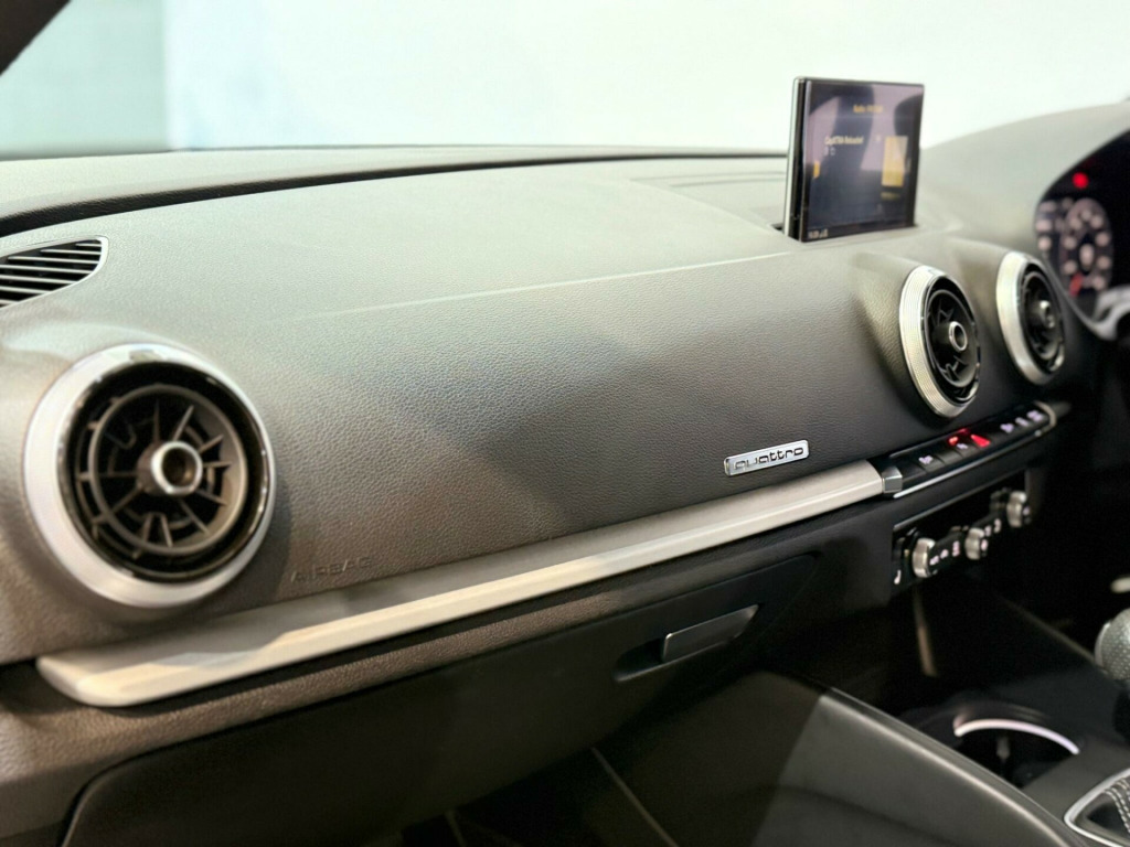 This 2017 Audi A3 TFSI S line offers a compelling blend of performance and advanced technology. As a Euro 6 compliant vehicle, it features a powerful 2.0 litre petrol engine paired with Audi's renowned four wheel drive system, ensuring confident handling in various conditions. The S line trim enhances its sporty appeal, while notable features include privacy glass for added comfort and style. Inside, you'll find the Technology Package, which includes Bluetooth connectivity, and the advanced version adds wireless phone charging. Further elevating the experience is the Bang and Olufsen sound system, delivering a premium audio experience, and the Matrix LED exterior lighting pack, which includes striking LED headlights.This Audi A3 TFSI S line stands out with its impressive performance figures, achieving 0 to 62 miles per hour in just 6.2 seconds, demonstrating its dynamic capabilities. Its fuel economy is also a significant advantage, returning up to 49 miles per gallon, which is excellent for a vehicle of this calibre. Furthermore, its low CO2 emissions highlight its efficiency and environmental consideration compared to similar vehicles. These combined attributes make this A3 a well rounded and desirable option for those seeking a premium driving experience with strong performance and economy. di phone box with wireless charging, bang and olufsen sound system, rear parking sensors, technology package - advanced, matrix led exterior lighting pack, pre-sense basic, headlights washers, 18in alloy wheels - 10-spoke design matt titanium look with diamond cut finish, door mirrors - heated-electrically adjustable-folding, privacy glass, technology package, 18in alloy wheels - 5-parallel spoke design with diamond cut finish, 2 x usb charging ports and 1 x aux-in, 6-airbag system with knee airbag for driver, 8 passive speakers, aluminium interior elements, anti theft locking wheel bolts, anti-theft alarm, audi connect infotainment services - 3 month trial, audi drive select, audi smartphone interface, bluetooth interface, body coloured door mirrors, cd drive, child locks - manual, chrome-plated exhaust tailpipe trim, cloth headlining in black, colour drivers information system - dis, cruise control, dab digital radio, door mirrors - electrically adjustable and heated with integrated led side indicators, dual-zone electronic climate control, esc - electronic stabilisation control inc abs - asr and edl, electric windows - front and rear, electromechanical parking brake, electromechanical power steering, first aid kit, front centre armrest, front and rear floor mats, isofix child seat mounting and top tether, illuminated door sill trims with s logo, immobiliser, inlays - matt brushed aluminium, led headlights with led rear lights and dynamic rear indicators, led interior light package, light and rain sensor, luggage compartment - lashing points x4, mmi navigation - sd card based, mmi radio plus with 7in electrically retractable colour mmi screen, manual front seat adjustment, non-smoking package, pedals in stainless steel, remote central locking with 2 fold away keys, s line badges on front wings, s line design body styling, seat belt monitoring, seat belt reminder for all seats, seats - split folding rear - 60-40, space saver spare wheel, sport side air inlet grille and diffuser insert, sport suspension, steering wheel - 3-spoke leather-multifunction-flat bottomed-shift paddles, storage compartments in the door side trims-centre console-under drivers seat, storage package, tool kit and car jack, tyre pressure monitoring system, warning triangle, window surrounds - aluminium