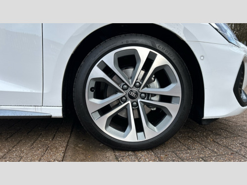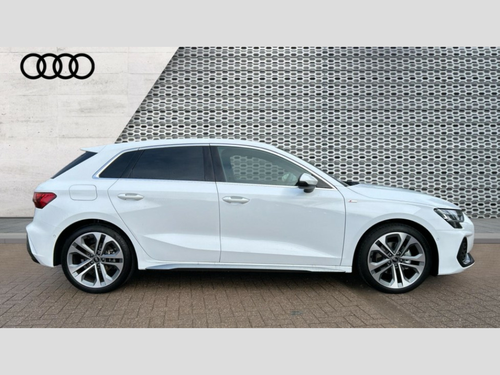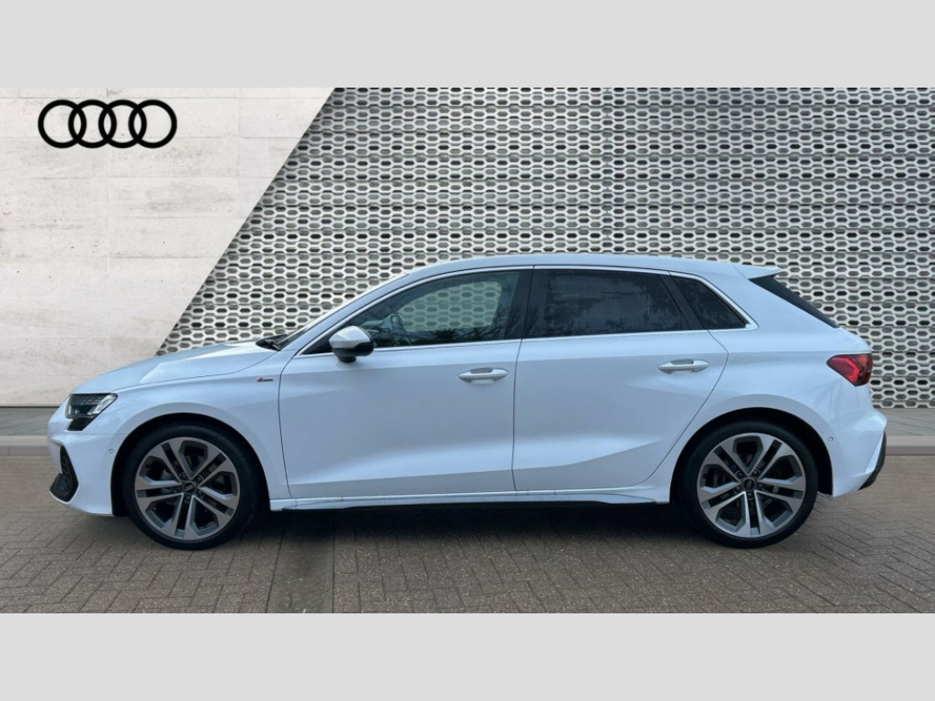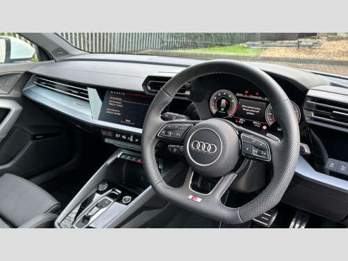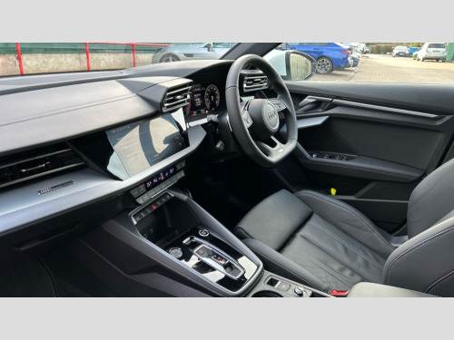 Audi A3 1.5 TFSI 150 S Line 5dr S Tronic Adaptive cruise control (ACC), Adjustable speed limiter, Audi drive select (Auto, Comfort, Dynamic, Efficiency and Individual), Audi virtual cockpit plus - 12.3" full HD resolution dynamic digital instrument cluster, Automatic start/stop system with recuperation, Bluetooth interface, Camera based traffic sign recognition, Collision avoidance assistant, Driver attention and fatigue detection, e-Call (emergency call), Electromechanical power speed sensitive steering, Emergency assist, Intersection assist, Lane departure warning system, MMI Navigation Plus with high resolution 10.1" colour touch screen display, Park Assist with parking system Plus, Reversing camera, Service indicator, Smartphone interface with app store includes wireless Apple carplay, Android auto and Amazon alexa integration, Trip computer, Voice control system with natural language interaction, Sports suspension, Audi Phonebox light with wireless charging, Audi sound system - 10 loudspeakers including centre loudspeaker and subwoofer, DAB Digital radio, USB ports with charging function in the rear, Acoustic glass windscreen, All weather light, Aluminium window trim, Auto dimming frameless rear view mirror, Automatic dynamic range control, Body colour exterior mirrors, Dipped beam, main beam, position light and turning light, Electrically adjustable/heated/folding/auto dimming door mirrors with integrated LED indications + kerb view function for passenger side, Exterior model badging, Front and rear side air inlets in grained matt black with dark liquid chrome frame, Front electric windows, Front radiator grill in high gloss dark chrome, Heat insulating glass windscreen, Illuminated door sills with aluminium inserts at the front with S logo, Intersection light, Invisible tailpipe, LED 3rd brake light, LED brake lights, LED daytime running x3, LED headlights with LED rear lights and dynamic rear indicators, LED rear number plate lights, LED reverse light, LED tail lights, Light and rain sensors, Manoeuvring light, Motorway light, Privacy glass - dark tinted rear window, rear door and side windows, Rear diffuser and grill in grained matt black with inlay in dark liquid chrome, Rear electric windows, Rear side wing doors, Rear wiper, S line bumpers, S roof spoiler, Side S line emblems on front wings, Side sill trim in dark liquid chrome, Static cornering light, 12V socket and storage compartment in front centre console, 3 seat bench in 2nd row, 3 spoke flat bottomed leather multifunction sport steering wheel with gear shift paddles, 3-zone deluxe automatic air conditioning, 4 way electrically adjustable lumbar support for driver and front passenger, 40/20/40 split folding rear seat bench, Black cloth headlining, Black front and rear floor mats, Front and rear centre armrest in artificial leather with contrasting stitching on armrests and instrument panel, Front and rear headrests, Heated front seats, Height and reach adjustable steering wheel, i-Size child seat mounting on the front passenger side and outer rear seats, i-Size and top tether on the outer rear seats, Manual boot compartment lid, Manually adjustable front seats, Rear centre armrest with cupholder, S badging on the steering wheel, Seat side bolsters, Single front passenger seat, Stainless steel pedals and front footrest in black, Twin leather upholstery with front sports seats S embossed logo, Aluminium interior elements pack - A3, Multi-coloured LED interior lighting package with Multi-coloured contour lighting of instrument panel - A3, 3x3 point rear seat belts, Driver and front passenger airbag with passenger airbag deactivation, Electronic Stabilisation Control (ESC) including ABS, ASR and EDL, First aid kit with warning triangle and 2 safety vests, Front side airbags with head airbags and interaction airbag, Hill hold assist, Pre-sense front with pedestrian and cyclist detection, Seatbelt monitoring, Tyre pressure loss indicator, Anti theft alarm, Anti-theft wheel bolts, Electronically operated child locks, Immobiliser, Black dashboard, Inlay in dark aluminium spectrum