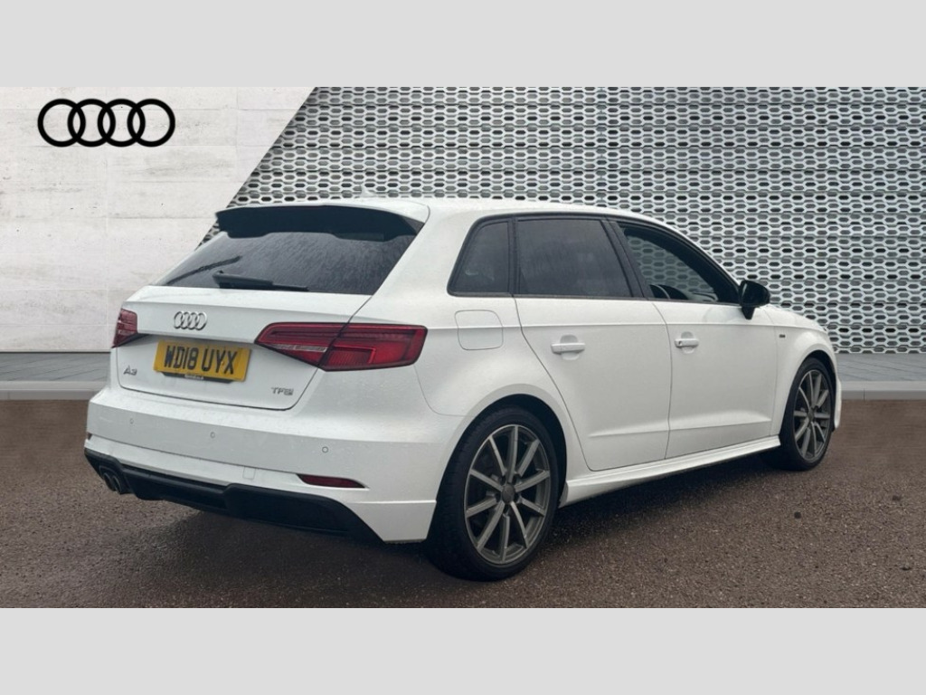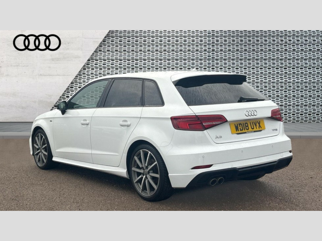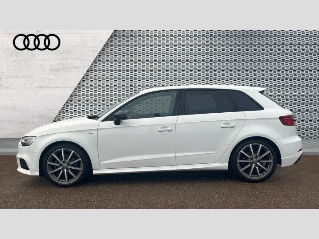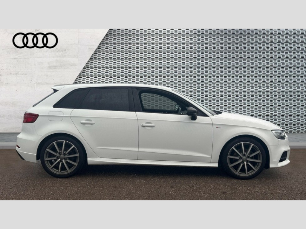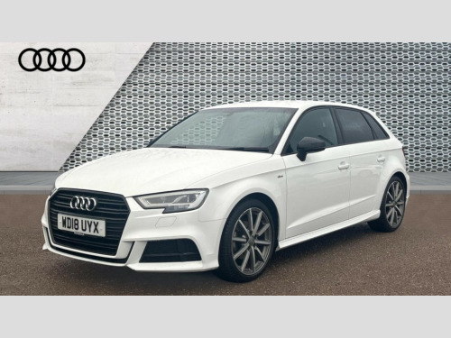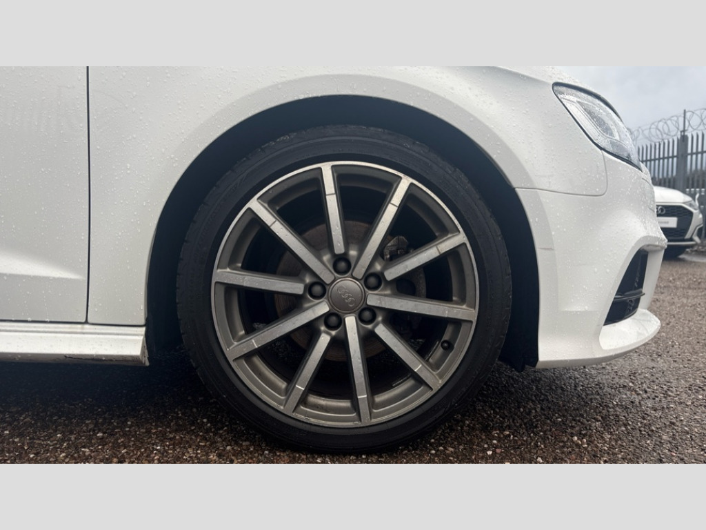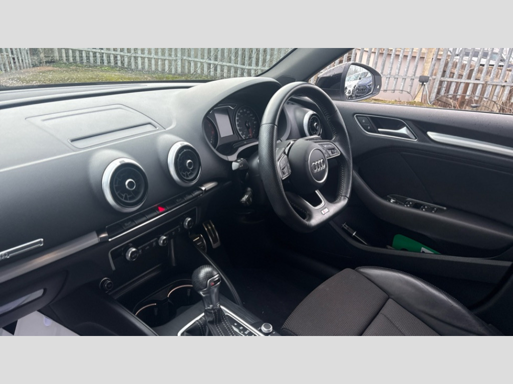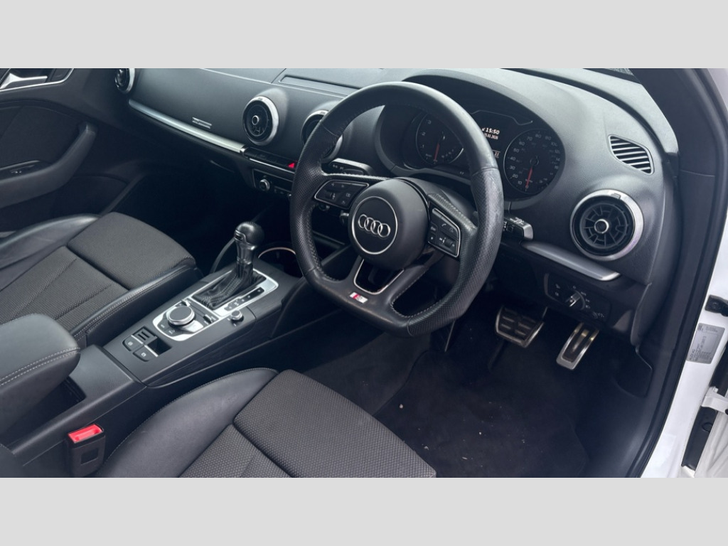 Audi A3 1.5 TFSI Black Edition 5dr S Tronic Audi connect, Audi drive select, Audi smartphone interface, Colour driver's information system display, Electro-mechanical PAS, HDD satellite navigation system radio single CD/DVD player MMI control system, Mobile telephone preparation - bluetooth interface, Service interval indicator, Speed limit display, Voice control system, 2 USB ports, Audi music interface, Audi sound system with 10 loudspeakers, Auxiliary input socket, CD player, DAB Digital radio, MMI radio plus with 7" colour MMI screen and MMI controller, Auto dimming rear view mirror with light and rain sensors, Black door mirrors, Black window surrounds, Body colour bumpers with black insert, Body colour roof spoiler, Chrome exhaust tailpipes, Electric front windows, Electric operated/heated door mirrors, Electric rear windows, Heated windscreen washer jets, LED daytime running lights, Matt black radiator grille, Privacy glass, Rear wiper, S Line body styling, Sport specific side air inlet grille and diffuser insert, 3 adjustable rear headrests, 3 spoke flat bottomed multi-function leather steering wheel, 4 lashing points to secure luggage, Adjustable front armrest, Black cloth headlining, Dual zone electronic climate control, Front and rear interior lights with delay, Front passenger seat isofix location point, Front sports seats, Front/rear floor mats, Height/depth adjustable steering column, Illuminated glovebox, ISOFIX child seat preparation+airbag deactivation, Jack and tool kit, Stainless steel pedals, Steering wheel gearshift paddles, Storage compartment in centre console, Storage compartment under front seats, Storage compartments in doors, Black styling pack - A3/S3, LED interior light pack - A3/RS3, Non smoking pack - A3, Storage and luggage pack - A3/RS3, 3 point seatbelts on all seats, ABS/EBD, Active bonnet, Active front headrests, ASR, Curtain airbags, Driver and passenger side airbags, Driver/Front Passenger airbags, Drivers knee airbag, EDL, Electromechanical parking brake, ESC - Electronic Stability Control + traction control, Front passenger airbag deactivation, Manual rear child locks, Multi-Collision braking, Seatbelt warning, Tyre pressure warning, Warning triangle and first aid kit, Anti theft alarm, Anti-theft wheel bolts, Remote control central locking, Thatcham category 1 alarm + immobiliser, Aluminium air vent surrounds, Aluminium trim elements, Matt brushed aluminium inlays, 18" 10 spoke design alloy wheels in matt titanium look with diamond cut finish, Space saver spare wheel