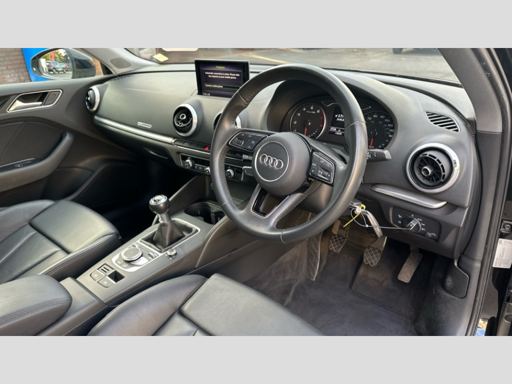 Audi A3 30 TFSI 116 Sport 5dr Audi connect, Audi drive select, Audi smartphone interface, Automatic start/stop system, Colour driver's information system display, Electro - mechanical power assisted steering, Mobile telephone preparation - bluetooth interface, SD card based satellite navigation system, Service interval indicator, Speed limit display, Voice control system, Voice recognition for navigation system, 2 USB interfaces and Aux-In jack, Audi music interface, CD player, DAB Digital radio, MMI radio plus with 7" colour MMI screen and MMI controller, Aluminium window trim, Auto dimming rear view mirror with light and rain sensors, Body colour bumpers, Body colour door mirrors, Body colour roof spoiler with aerodynamic inserts in high gloss black, Chrome exhaust tailpipes, Electric front windows, Electric rear windows, Electrically adjustable and heated door mirrors with integrated LED side indicators, Heated windscreen washer jets, Matt black radiator grille, Rear wiper, Sport specific side air inlet grille and diffuser insert, Xenon headlights with LED Daytime running light, 3 adjustable rear headrests, 4 lashing points to secure luggage, Adjustable front centre armrest, Aluminium door sill trims, Cloth headlining, Dual zone electronic climate control, Front and rear interior lights with delay, Front sports seats, Front/rear floor mats, Glovebox light, Height/depth adjustable steering column, Isofix child seat preparation for front passenger/outer rear seats inc passenger airbag deactivation, Rock grey headlining, Storage compartments in doors side trims, centre console and under front drivers seat, Non smoking pack - A3, 3 point seatbelts on all seats, ABS/EBD, Active bonnet, Active front headrests, Airbags - front driver/passenger, front & rear side, curtain, drivers knee, ASR, EDL, Electromechanical parking brake, ESC - Electronic Stability Control + traction control, Front passenger airbag deactivation, Hill hold assist, Manual rear child locks, Multi-Collision braking, Seatbelt warning, Tyre pressure warning, Warning triangle and first aid kit, Anti theft alarm, Anti-theft wheel bolts, Remote control central locking, Thatcham category 1 alarm + immobiliser, Aluminium air vent surrounds, Aluminium mistral silver inlay, Aluminium trim elements