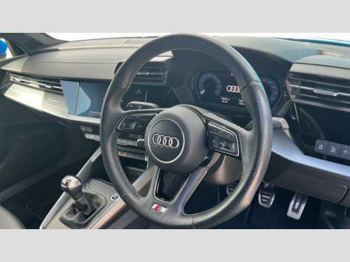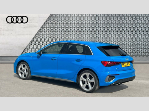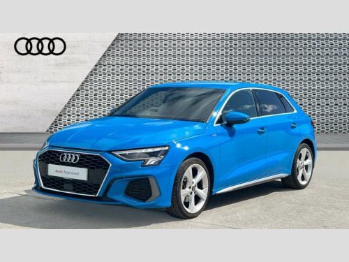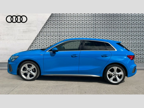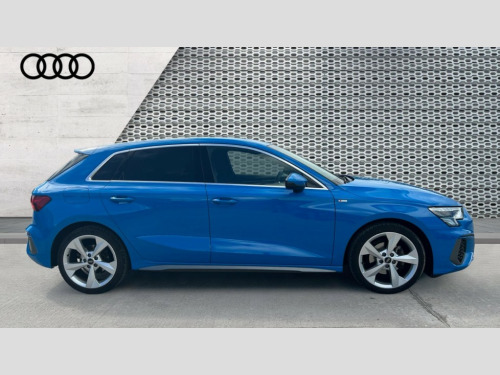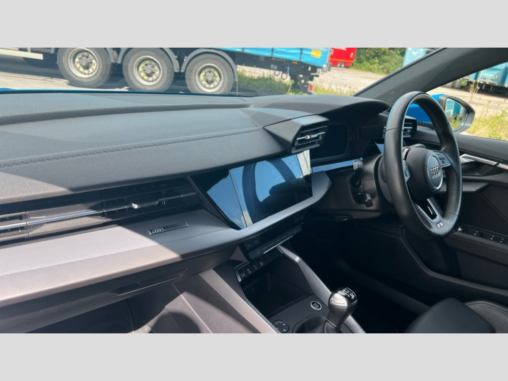 Audi A3 30 TFSI S Line 5dr Audi drive select (Auto, Comfort, Dynamic and Individual), Audi smartphone interface, Audi Virtual Cockpit - 10.25" digital and colour instrument cluster, Automatic start/stop system with recuperation, Bluetooth interface, Collision avoidance assistant, Cruise control, e-Call (emergency call), Electromechanical power speed sensitive steering, Lane departure warning system, MMI Navigation Plus with high resolution 10.1" colour touch screen display, Rear parking sensors, Service indicator, Trip computer, Voice control system with natural language interaction, Sports suspension, 2xUSB-C connection with data and charging functions, 6 passive loudspeakers, DAB Digital radio, 3rd brake light, Acoustic glass windscreen, Aluminium window trim, Auto dimming frameless rear view mirror, Body colour exterior mirrors, Electrically adjustable/heated/folding/auto dimming door mirrors with integrated LED indications + kerb view function for passenger side, Front electric windows, Illuminated aluminium inserts front door sills with S logo, LED daytime running lights, LED headlights with LED rear lights and dynamic rear indicators, Light and rain sensors, Privacy glass - dark tinted rear window, rear door and side windows, Rear electric windows, Rear side air outlets in grained matt black, Rear side wing doors, Rear wiper, S line bumpers, S roof spoiler, 12V socket and storage compartment in front centre console, 3 seat bench in 2nd row, 3 spoke leather multifunction steering wheel, 40/20/40 split folding rear seat bench with cupholder, Black cloth headlining, Dual zone electronic climate control, Front and rear centre armrest in leather, Front and rear headrests, Front/rear floor mats, Height and reach adjustable steering wheel, Illuminated vanity mirror, Interior lighting - glove compartment light and right hand side, Luggage compartment floor covering, Manual boot compartment lid, Manually adjustable front seats, Seat side bolsters, Single front passenger seat, Stainless steel pedals and front footrest in black, Twin leather upholstery with front sports seats S embossed logo, Aluminium interior elements pack - A3 Sportback, LED interior lighting pack - A3 Sportback, S line styling pack - A3 Sportback, 3x3 point rear seat belts, Audi pre sense front, Driver and front passenger airbag with passenger airbag deactivation, Electronic Stabilisation Control (ESC) including ABS, ASR and EDL, First aid kit with warning triangle and 2 safety vests, Front side airbags with head airbags and interaction airbag, Pre-sense front with pedestrian and cyclist detection, Seatbelt monitoring, Tyre pressure loss indicator, Anti theft alarm, Anti-theft wheel bolts, Electronically operated child lock, Immobiliser, Remote control central locking, Accent surfaces in the dashboard and centre console in platinum grey silk effect paint finish, Dark spectrum aluminium inlays