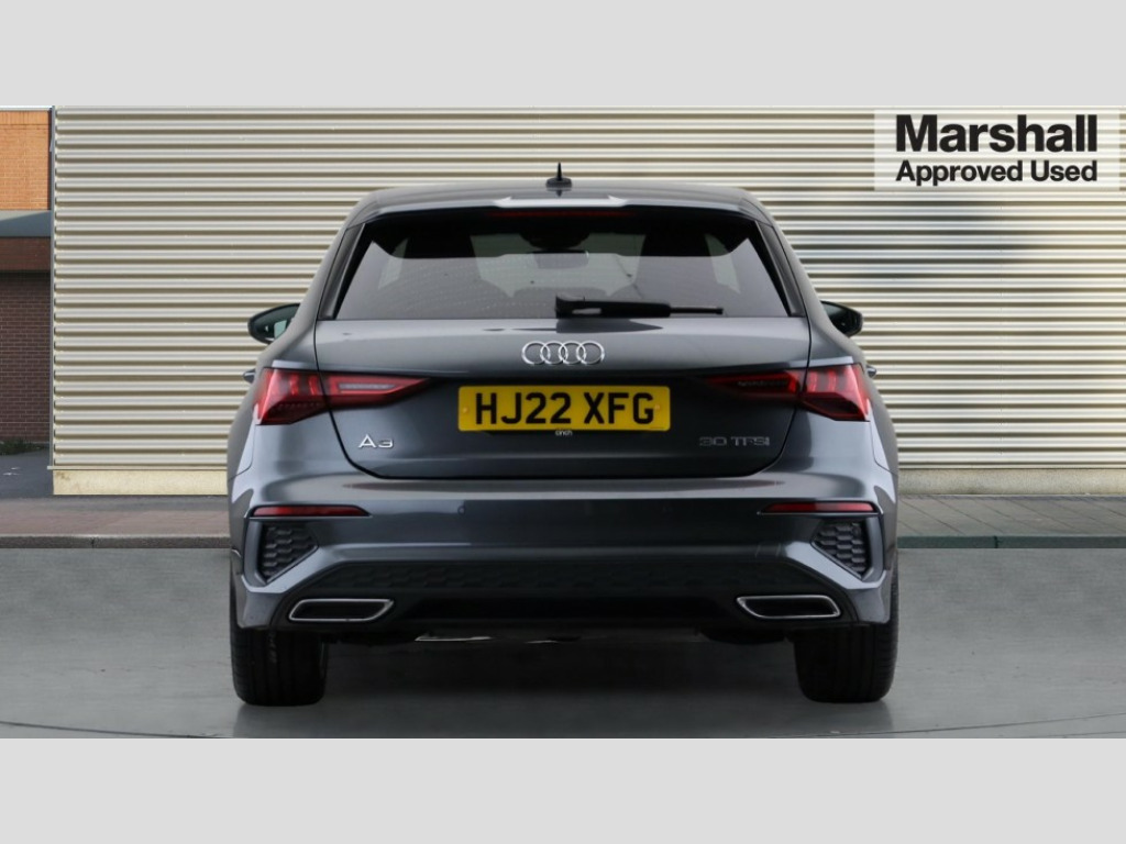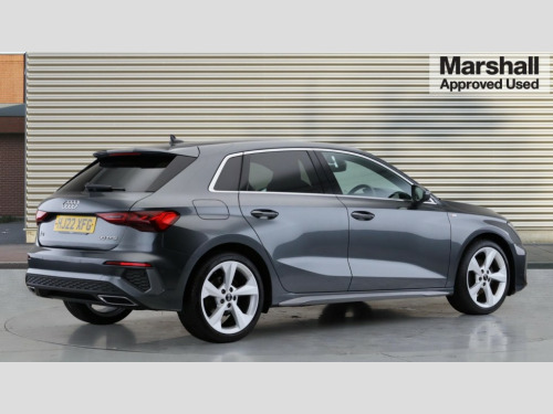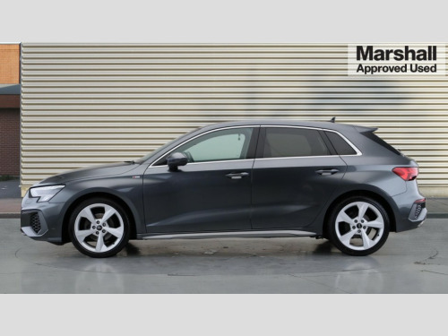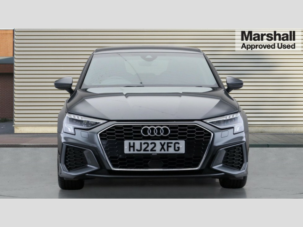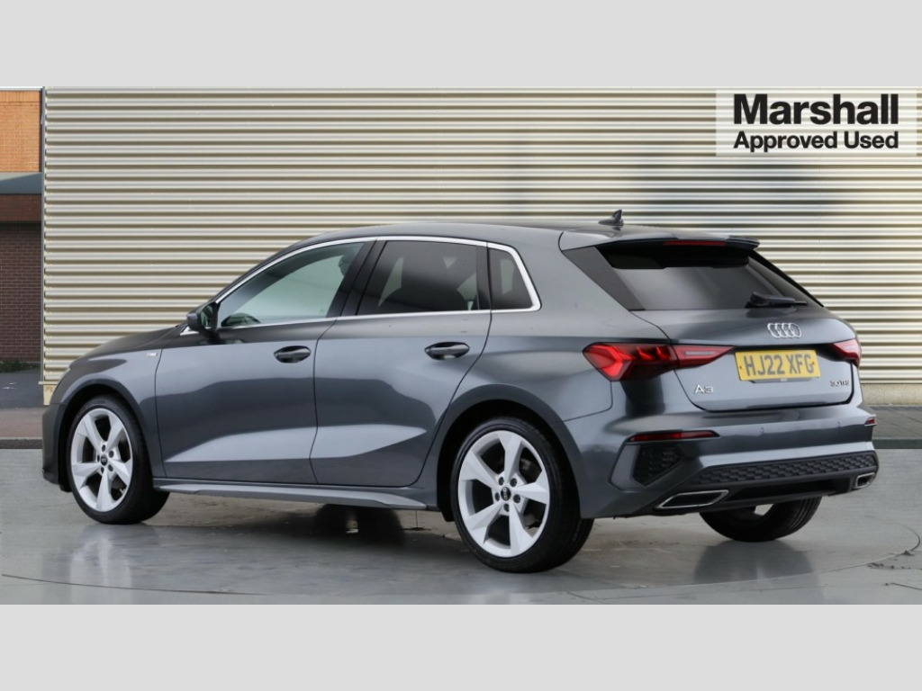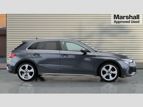 Audi A3 30 TFSI S Line 5dr Audi connect emergency call and service, Audi drive select (Auto, Comfort, Dynamic and Individual), Audi smartphone interface, Audi Virtual Cockpit - 10.25" digital and colour instrument cluster, Automatic start/stop system with recuperation, Bluetooth interface, Collision avoidance assistant, Electromechanical power speed sensitive steering, Lane departure warning system, MMI Navigation Plus with high resolution 10.1" colour touch screen display, Service indicator, Trip computer, Voice control system with natural language interaction, 2xUSB-C connection with data and charging functions, 6 passive loudspeakers, DAB Digital radio, 3rd brake light, Acoustic glass windscreen, Aluminium window trim, Auto dimming frameless rear view mirror, Electrically adjustable/heated/folding/auto dimming door mirrors with integrated LED indications + kerb view function for passenger side, Front electric windows, Illuminated aluminium inserts front door sills with S logo, LED daytime running lights, LED headlights with LED rear lights and dynamic rear indicators, Light and rain sensors, Privacy glass - dark tinted rear window, rear door and side windows, Rear electric windows, Rear side air outlets in grained matt black, Rear side wing doors, Rear wiper, S line bumpers, S roof spoiler, 12V socket and storage compartment in front centre console, 3 seat bench in 2nd row, 40/20/40 split folding rear seat bench with cupholder, Black cloth headlining, Dual zone electronic climate control, Front and rear centre armrest in leather, Front and rear headrests, Front/rear floor mats, Height and reach adjustable steering wheel, Illuminated vanity mirror, Interior lighting - glove compartment light and right hand side, Luggage compartment floor covering, Manual boot compartment lid, Manually adjustable front seats, Seat side bolsters, Single front passenger seat, Stainless steel pedals and front footrest in black, Twin leather upholstery with front sports seats S embossed logo, Aluminium interior elements pack - A3 Sportback, S line styling pack - A3 Sportback, 3x3 point rear seat belts, Driver and front passenger airbag with passenger airbag deactivation, Electronic Stabilisation Control (ESC) including ABS, ASR and EDL, First aid kit with warning triangle and 2 safety vests, Front side airbags with head airbags and interaction airbag, Pre-sense front with pedestrian and cyclist detection, Seatbelt monitoring, Tyre pressure loss indicator, Anti theft alarm, Anti-theft wheel bolts, Immobiliser, Manual child locks, Remote control central locking, Accent surfaces in the dashboard and centre console in platinum grey silk effect paint finish, Dark spectrum aluminium inlays