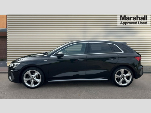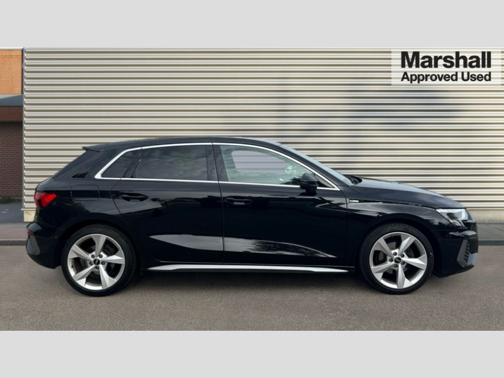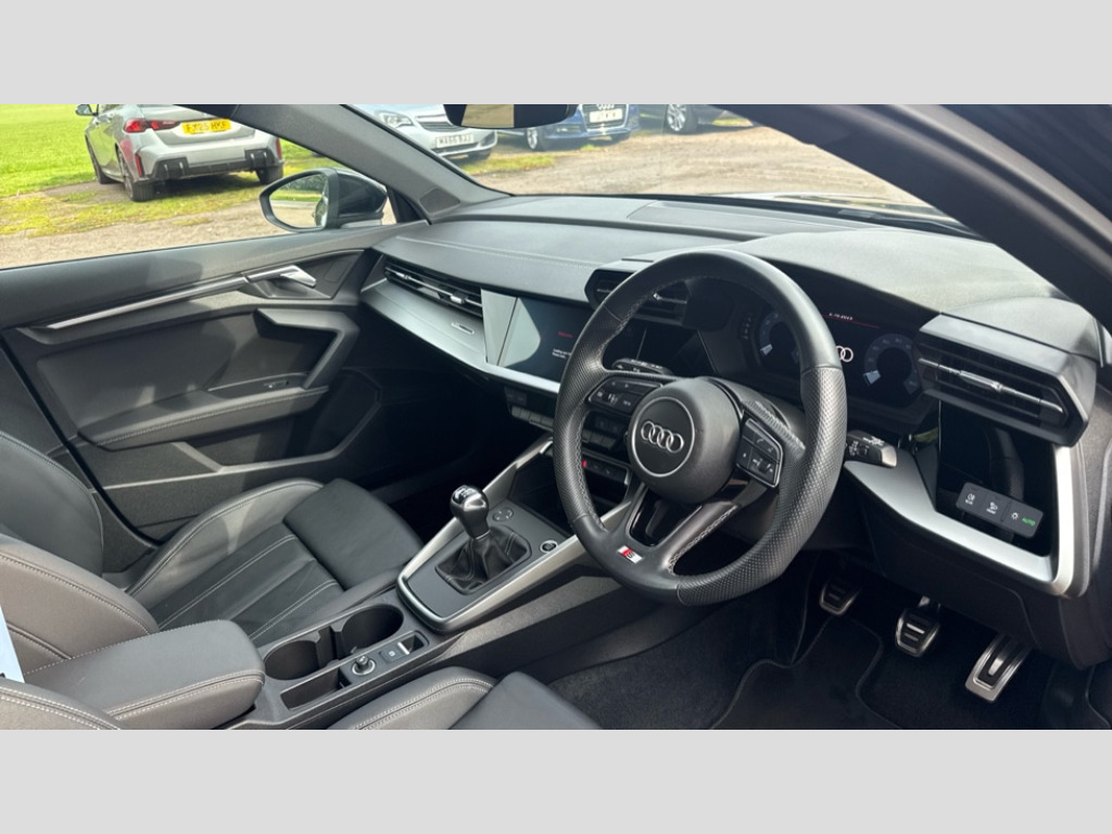 Audi A3 30 TFSI S Line 5dr Audi drive select (Auto, Comfort, Dynamic and Individual), Audi smartphone interface, Audi Virtual Cockpit - 10.25" digital and colour instrument cluster, Automatic start/stop system with recuperation, Bluetooth interface, Collision avoidance assistant, Cruise control, e-Call (emergency call), Electromechanical power speed sensitive steering, Lane departure warning system, MMI Navigation Plus with high resolution 10.1" colour touch screen display, Rear parking sensors, Service indicator, Trip computer, Voice control system with natural language interaction, 2xUSB-C connection with data and charging functions, 6 passive loudspeakers, DAB Digital radio, 3rd brake light, Acoustic glass windscreen, Aluminium window trim, Auto dimming frameless rear view mirror, Electrically adjustable/heated/folding/auto dimming door mirrors with integrated LED indications + kerb view function for passenger side, Front electric windows, Illuminated aluminium inserts front door sills with S logo, LED daytime running lights, LED headlights with LED rear lights and dynamic rear indicators, Light and rain sensors, Privacy glass - dark tinted rear window, rear door and side windows, Rear electric windows, Rear side air outlets in grained matt black, Rear side wing doors, Rear wiper, S line bumpers, S roof spoiler, 12V socket and storage compartment in front centre console, 3 seat bench in 2nd row, 40/20/40 split folding rear seat bench with cupholder, Black cloth headlining, Dual zone electronic climate control, Front and rear centre armrest in leather, Front and rear headrests, Front/rear floor mats, Height and reach adjustable steering wheel, Illuminated vanity mirror, Interior lighting - glove compartment light and right hand side, Luggage compartment floor covering, Manual boot compartment lid, Manually adjustable front seats, Seat side bolsters, Single front passenger seat, Stainless steel pedals and front footrest in black, Twin leather upholstery with front sports seats S embossed logo, Aluminium interior elements pack - A3 Sportback, LED interior lighting pack - A3 Sportback, S line styling pack - A3 Sportback, 3x3 point rear seat belts, Audi pre sense front, Driver and front passenger airbag with passenger airbag deactivation, Electronic Stabilisation Control (ESC) including ABS, ASR and EDL, First aid kit with warning triangle and 2 safety vests, Front side airbags with head airbags and interaction airbag, Pre-sense front with pedestrian and cyclist detection, Seatbelt monitoring, Tyre pressure loss indicator, Anti theft alarm, Anti-theft wheel bolts, Electronically operated child lock, Immobiliser, Remote control central locking, Accent surfaces in the dashboard and centre console in platinum grey silk effect paint finish, Dark spectrum aluminium inlays