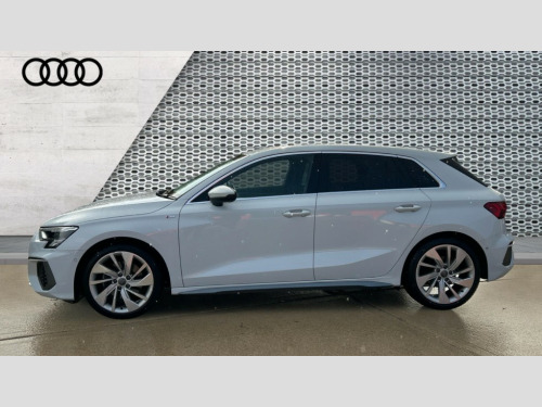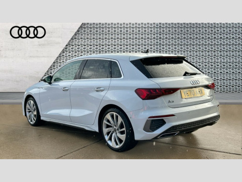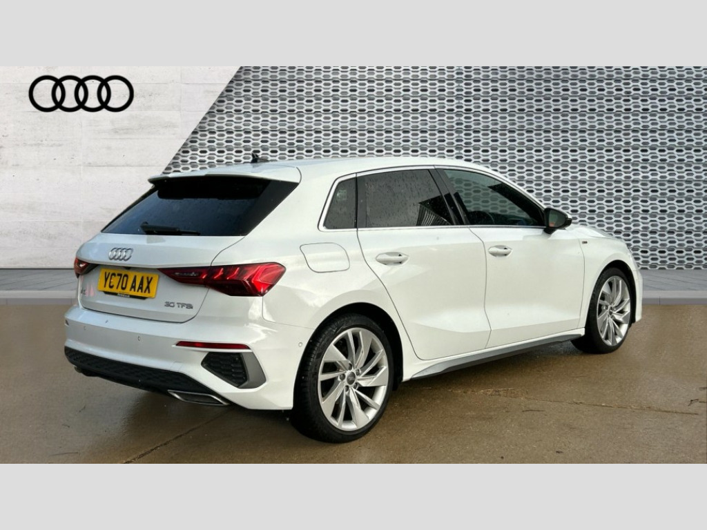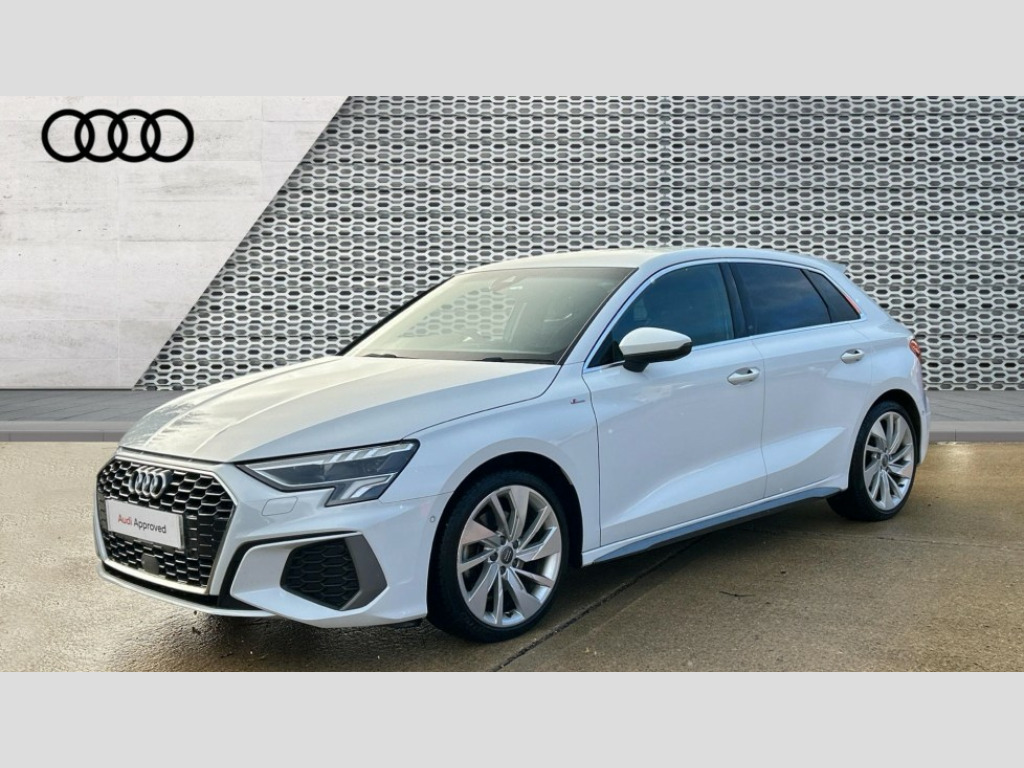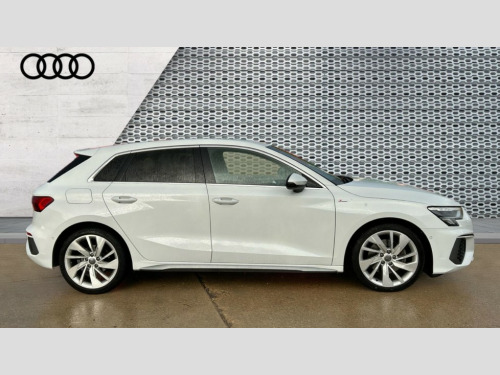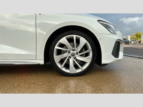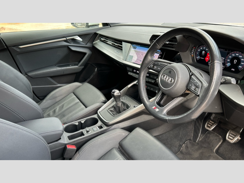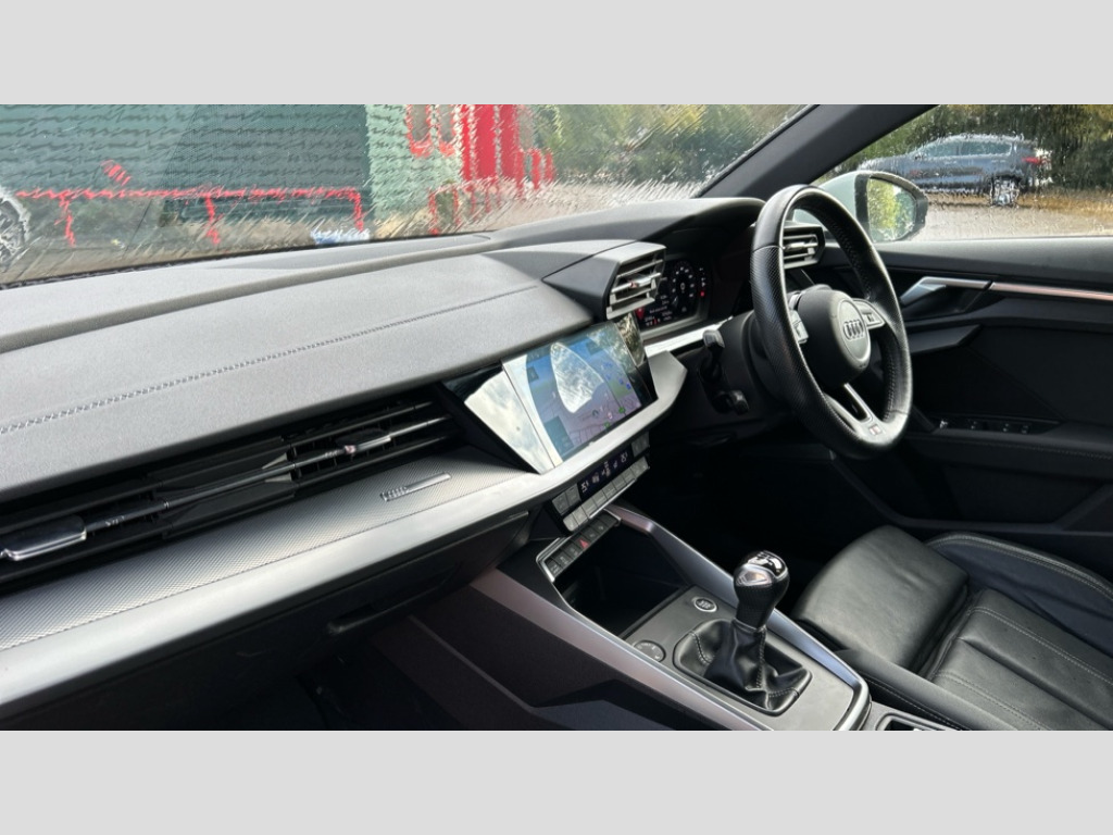 Audi A3 30 TFSI S Line 5dr Audi connect emergency call and service, Audi drive select (Auto, Comfort, Dynamic and Individual), Audi smartphone interface, Audi Virtual Cockpit - 10.25" digital and colour instrument cluster, Automatic start/stop system with recuperation, Bluetooth interface, Collision avoidance assistant, Cruise control, Electromechanical power speed sensitive steering, Lane departure warning system, MMI Navigation Plus with high resolution 10.1" colour touch screen display, Rear parking sensors, Service indicator, Trip computer, Voice control system with natural language interaction, 1xUSB-A and 1xUSB-C connection, 6 passive loudspeakers, DAB Digital radio, Acoustic glass windscreen, Aluminium window trim, Auto dimming frameless rear view mirror, Body colour exterior mirrors, Electrically adjustable/heated/folding/auto dimming door mirrors with integrated LED indications + kerb view function for passenger side, Front electric windows, Illuminated aluminium inserts front door sills with S logo, LED daytime running lights, Light and rain sensors, Privacy glass - dark tinted rear window, rear door and side windows, Rear electric windows, Rear side air outlets in grained matt black, Rear wiper, S line bumpers, S roof spoiler, 12V socket and storage compartment in front centre console, 40/20/40 split folding rear seat bench with cupholder, Black cloth headlining, Dual zone electronic climate control, Front and rear centre armrest in leather, Front and rear headrests, Front/rear floor mats, Height and reach adjustable steering wheel, Interior lighting - glove compartment light and right hand side, Luggage compartment floor covering, Manual boot compartment lid, Manually adjustable front seats, Seat side bolsters, Stainless steel pedals and front footrest, Twin leather upholstery with front sports seats S embossed logo, Aluminium interior elements pack - A3 Sportback, S line styling pack - A3 Sportback, 3x3 point rear seat belts, Driver and front passenger airbag with passenger airbag deactivation, Electronic Stabilisation Control (ESC) including ABS, ASR and EDL, First aid kit with warning triangle and 2 safety vests, Hill hold assist, Pre-sense front with pedestrian and cyclist detection, Seatbelt monitoring, Tyre pressure loss indicator, Anti theft alarm, Anti-theft wheel bolts, Electronically operated child lock, Immobiliser, Remote control central locking, Accent surfaces in the dashboard and centre console in platinum grey silk effect paint finish, Dark spectrum aluminium inlays