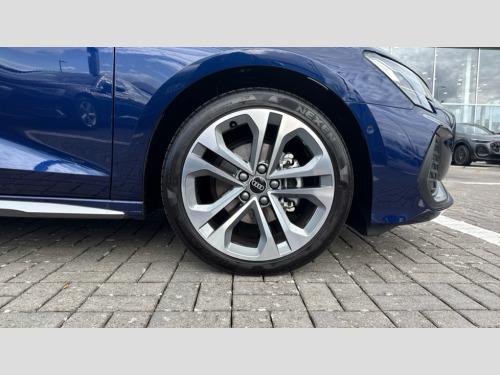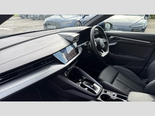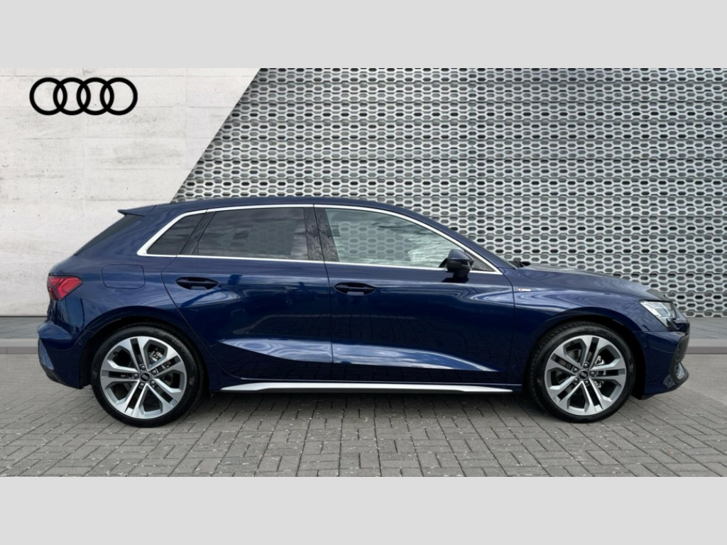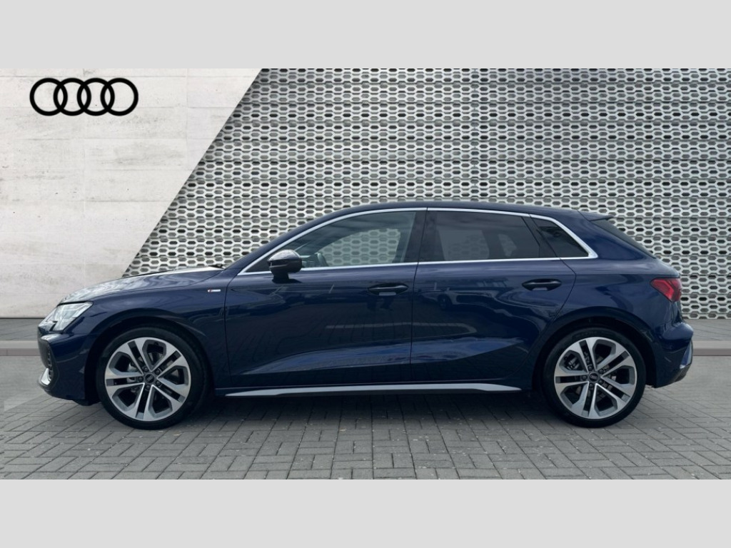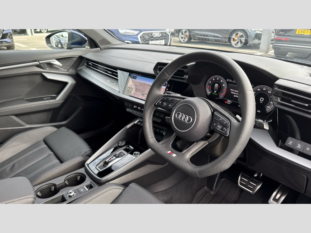 Audi A3 30 TFSI S Line 5dr S Tronic Adjustable speed limiter, Audi drive select, Audi smartphone interface with app store includes wireless Apple carplay, Android auto and Amazon alexa integration, Audi virtual cockpit plus - 12.3" full HD resolution dynamic digital instrument cluster, Automatic start/stop system with recuperation, Bluetooth interface, Camera based traffic sign recognition, Collision avoidance assistant, Cruise control, Distraction and Fatigue warning, e-Call (emergency call), Electromechanical power speed sensitive steering, Emergency assist, Lane departure warning system, MMI Navigation Plus with high resolution 10.1" colour touch screen display, Park Assist with parking system Plus, Service indicator, Tailgate, Trip computer, Voice control system with natural language interaction, Sports suspension, Audi Phonebox light with wireless charging, Audi sound system - 10 loudspeakers including centre loudspeaker and subwoofer, DAB Digital radio, USB ports with charging function in the rear, Acoustic glass windscreen, All weather light, Aluminium window trim, Auto dimming frameless rear view mirror, Automatic dynamic range control, Body colour exterior mirrors, Chrome exhaust tailpipes, Dipped beam, main beam, position light and turning light, Electrically adjustable/heated/folding/auto dimming door mirrors with integrated LED indications + kerb view function for passenger side, Exterior model badging, Front and rear side air inlets in grained matt black with dark liquid chrome frame, Front electric windows, Front radiator grill in high gloss dark chrome, Heat insulating glass windscreen, Illuminated door sills with aluminium inserts at the front with S logo, Intersection light, LED 3rd brake light, LED brake lights, LED daytime running x3, LED headlights with LED rear lights and dynamic rear indicators, LED rear number plate lights, LED reverse light, LED tail lights, Light and rain sensors, Manoeuvring light, Motorway light, Privacy glass - dark tinted rear window, rear door and side windows, Rear diffuser and grill in grained matt black with inlay in dark liquid chrome, Rear electric windows, Rear side wing doors, Rear wiper, S line bumpers, S roof spoiler, Side S line emblems on front wings, Side sill trim in dark liquid chrome, Static cornering light, 12V socket and storage compartment in front centre console, 3 seat bench in 2nd row, 3 spoke flat bottomed leather multifunction sport steering wheel with gear shift paddles, 3-zone deluxe automatic air conditioning, 4 way electrically adjustable lumbar support for driver and front passenger, 40/20/40 split folding rear seat bench, Black cloth headlining, Black front and rear floor mats, Front and rear centre armrest in artificial leather with contrasting stitching on armrests and instrument panel, Front and rear headrests, Heated front seats, Height and reach adjustable steering wheel, Manual boot compartment lid, Manually adjustable front seats, Rear centre armrest with cupholder, S badging on the steering wheel, Seat side bolsters, Single front passenger seat, Stainless steel pedals and front footrest in black, Twin leather upholstery with front sports seats S embossed logo, Aluminium interior elements pack - A3, Multi-coloured LED interior lighting package with Multi-coloured contour lighting of instrument panel - A3, 3x3 point rear seat belts, Driver and front passenger airbag with passenger airbag deactivation, Electronic Stabilisation Control (ESC) including ABS, ASR and EDL, First aid kit with warning triangle and 2 safety vests, Front side airbags with head airbags and interaction airbag, Hill hold assist, Pre-sense front with pedestrian and cyclist detection, Seatbelt monitoring, Tyre pressure loss indicator, Anti theft alarm, Anti-theft wheel bolts, Electronically operated child locks, Immobiliser, Remote central locking with safelock, Black dashboard, Inlay in dark aluminium spectrum