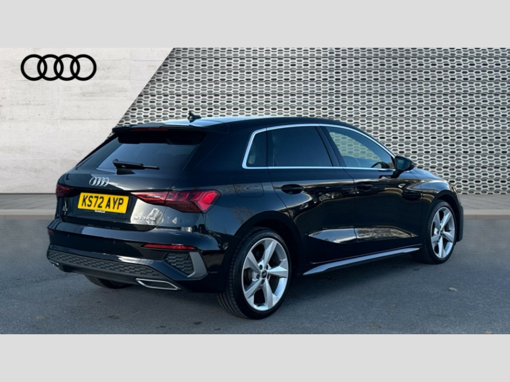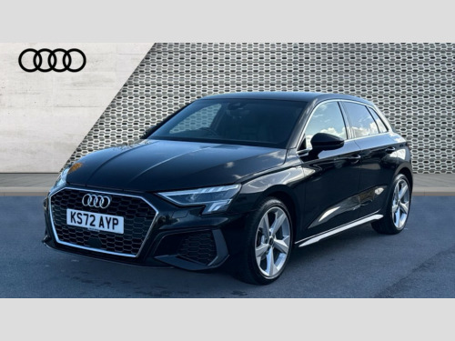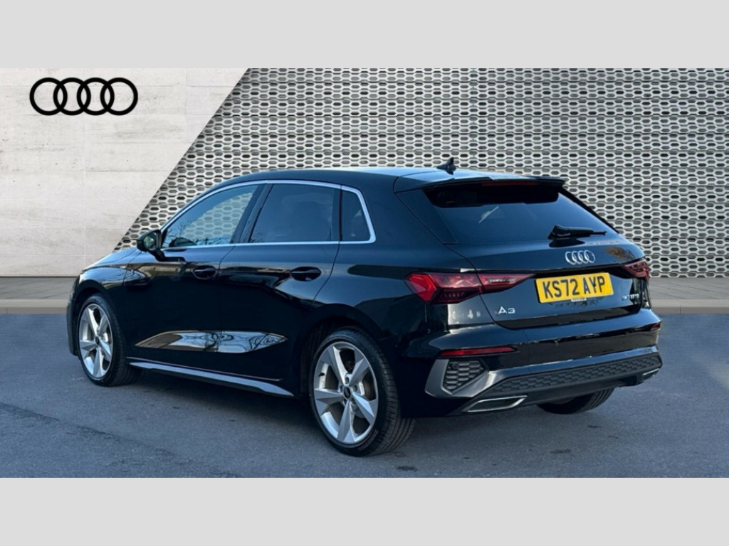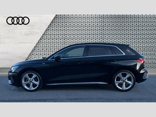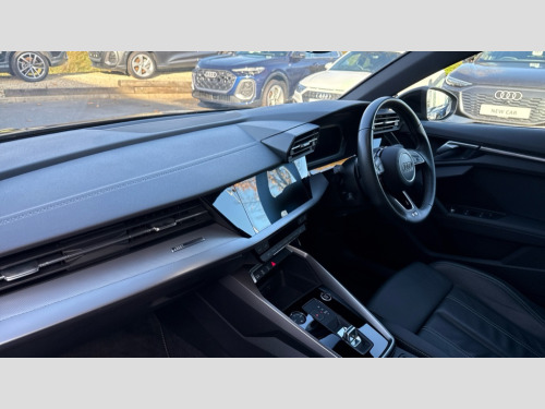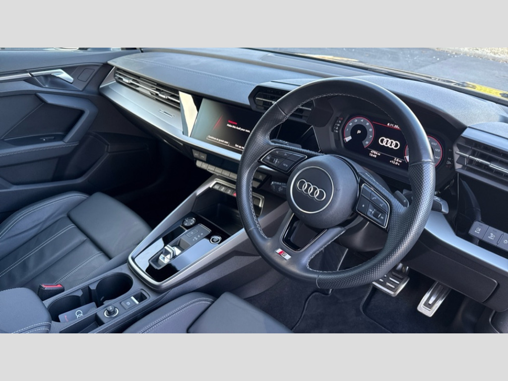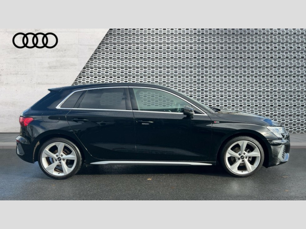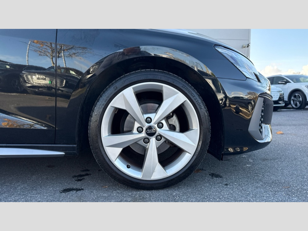 Audi A3 30 TFSI S Line 5dr S Tronic Audi drive select (Auto, Comfort, Dynamic and Individual), Audi smartphone interface, Audi Virtual Cockpit - 10.25" digital and colour instrument cluster, Automatic start/stop system with recuperation, Bluetooth interface, Collision avoidance assistant, e-Call (emergency call), Electromechanical power speed sensitive steering, Lane departure warning system, MMI Navigation Plus with high resolution 10.1" colour touch screen display, Service indicator, Trip computer, Voice control system with natural language interaction, 2xUSB-C connection with data and charging functions, 6 passive loudspeakers, DAB Digital radio, 3rd brake light, Acoustic glass windscreen, Aluminium window trim, Auto dimming frameless rear view mirror, Electrically adjustable/heated/folding/auto dimming door mirrors with integrated LED indications + kerb view function for passenger side, Front electric windows, Illuminated aluminium inserts front door sills with S logo, LED daytime running lights, LED headlights with LED rear lights and dynamic rear indicators, Light and rain sensors, Privacy glass - dark tinted rear window, rear door and side windows, Rear electric windows, Rear side air outlets in grained matt black, Rear side wing doors, Rear wiper, S line bumpers, S roof spoiler, 12V socket and storage compartment in front centre console, 3 seat bench in 2nd row, 40/20/40 split folding rear seat bench with cupholder, Black cloth headlining, Dual zone electronic climate control, Front and rear centre armrest in leather, Front and rear headrests, Front/rear floor mats, Height and reach adjustable steering wheel, Illuminated vanity mirror, Interior lighting - glove compartment light and right hand side, Luggage compartment floor covering, Manual boot compartment lid, Manually adjustable front seats, Seat side bolsters, Single front passenger seat, Stainless steel pedals and front footrest in black, Twin leather upholstery with front sports seats S embossed logo, Aluminium interior elements pack - A3 Sportback, LED interior lighting pack - A3 Sportback, S line styling pack - A3 Sportback, 3x3 point rear seat belts, Audi pre sense front, Driver and front passenger airbag with passenger airbag deactivation, Electronic Stabilisation Control (ESC) including ABS, ASR and EDL, First aid kit with warning triangle and 2 safety vests, Front side airbags with head airbags and interaction airbag, Pre-sense front with pedestrian and cyclist detection, Seatbelt monitoring, Tyre pressure loss indicator, Anti theft alarm, Anti-theft wheel bolts, Electronically operated child lock, Immobiliser, Remote control central locking, Accent surfaces in the dashboard and centre console in platinum grey silk effect paint finish, Dark spectrum aluminium inlays