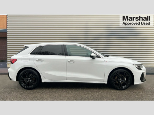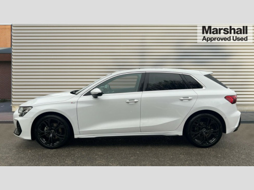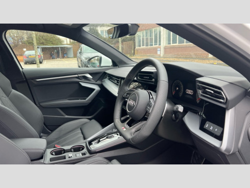 Audi A3 30 TFSI S Line 5dr S Tronic Adjustable speed limiter, Audi drive select, Audi smartphone interface with app store includes wireless Apple carplay, Android auto and Amazon alexa integration, Audi virtual cockpit plus - 12.3" full HD resolution dynamic digital instrument cluster, Automatic start/stop system with recuperation, Bluetooth interface, Camera based traffic sign recognition, Collision avoidance assistant, Cruise control, Distraction and Fatigue warning, e-Call (emergency call), Electromechanical power speed sensitive steering, Emergency assist, Lane departure warning system, MMI Navigation Plus with high resolution 10.1" colour touch screen display, Park Assist with parking system Plus, Service indicator, Tailgate, Trip computer, Voice control system with natural language interaction, Sports suspension, Audi Phonebox light with wireless charging, Audi sound system - 10 loudspeakers including centre loudspeaker and subwoofer, DAB Digital radio, USB ports with charging function in the rear, Acoustic glass windscreen, All weather light, Aluminium window trim, Auto dimming frameless rear view mirror, Automatic dynamic range control, Body colour exterior mirrors, Chrome exhaust tailpipes, Dipped beam, main beam, position light and turning light, Electrically adjustable/heated/folding/auto dimming door mirrors with integrated LED indications + kerb view function for passenger side, Exterior model badging, Front and rear side air inlets in grained matt black with dark liquid chrome frame, Front electric windows, Front radiator grill in high gloss dark chrome, Heat insulating glass windscreen, Illuminated door sills with aluminium inserts at the front with S logo, Intersection light, LED 3rd brake light, LED brake lights, LED daytime running x3, LED headlights with LED rear lights and dynamic rear indicators, LED rear number plate lights, LED reverse light, LED tail lights, Light and rain sensors, Manoeuvring light, Motorway light, Privacy glass - dark tinted rear window, rear door and side windows, Rear diffuser and grill in grained matt black with inlay in dark liquid chrome, Rear electric windows, Rear side wing doors, Rear wiper, S line bumpers, S roof spoiler, Side S line emblems on front wings, Side sill trim in dark liquid chrome, Static cornering light, 12V socket and storage compartment in front centre console, 3 seat bench in 2nd row, 3 spoke flat bottomed leather multifunction sport steering wheel with gear shift paddles, 3-zone deluxe automatic air conditioning, 4 way electrically adjustable lumbar support for driver and front passenger, 40/20/40 split folding rear seat bench, Black cloth headlining, Black front and rear floor mats, Front and rear centre armrest in artificial leather with contrasting stitching on armrests and instrument panel, Front and rear headrests, Heated front seats, Height and reach adjustable steering wheel, Manual boot compartment lid, Manually adjustable front seats, Rear centre armrest with cupholder, S badging on the steering wheel, Seat side bolsters, Single front passenger seat, Stainless steel pedals and front footrest in black, Twin leather upholstery with front sports seats S embossed logo, Aluminium interior elements pack - A3, Multi-coloured LED interior lighting package with Multi-coloured contour lighting of instrument panel - A3, 3x3 point rear seat belts, Driver and front passenger airbag with passenger airbag deactivation, Electronic Stabilisation Control (ESC) including ABS, ASR and EDL, First aid kit with warning triangle and 2 safety vests, Front side airbags with head airbags and interaction airbag, Hill hold assist, Pre-sense front with pedestrian and cyclist detection, Seatbelt monitoring, Tyre pressure loss indicator, Anti theft alarm, Anti-theft wheel bolts, Electronically operated child locks, Immobiliser, Remote central locking with safelock, Black dashboard, Inlay in dark aluminium spectrum