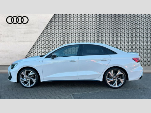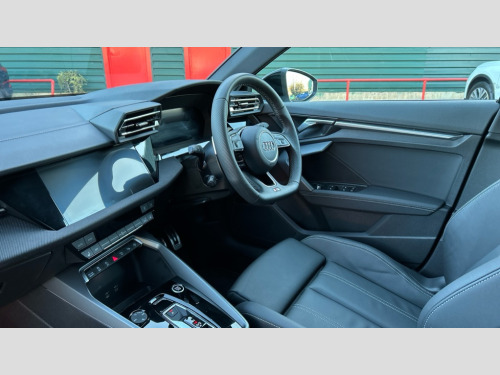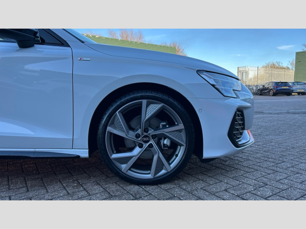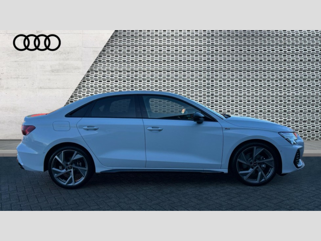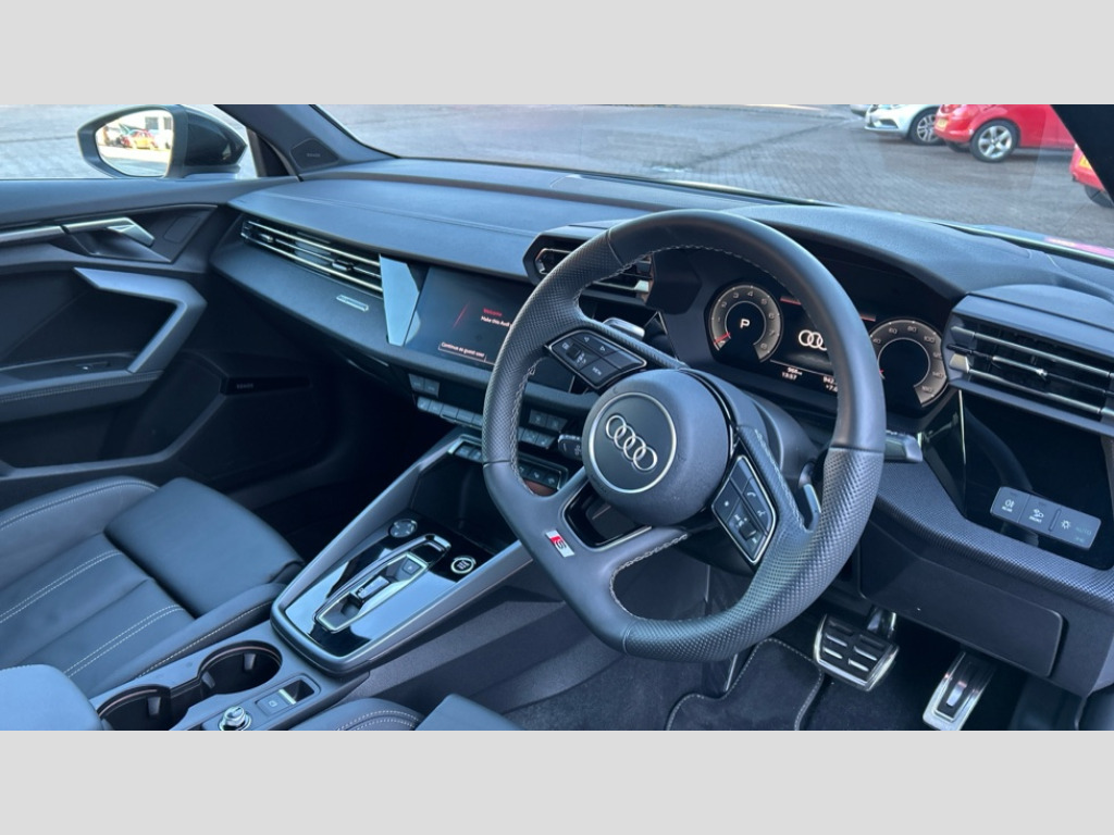 Audi A3 35 TFSI Black Edition 4dr S Tronic Adjustable speed limiter, Audi drive select, Audi smartphone interface with app store includes wireless Apple carplay, Android auto and Amazon alexa integration, Audi virtual cockpit plus - 12.3" full HD resolution dynamic digital instrument cluster, Automatic start/stop system with recuperation, Bluetooth interface, Camera based traffic sign recognition, Collision avoidance assistant, Cruise control, Distraction and Fatigue warning, e-Call (emergency call), Electromechanical power speed sensitive steering, Emergency assist, Lane departure warning system, MMI Navigation Plus with high resolution 10.1" colour touch screen display, Park Assist with parking system Plus, Service indicator, Trip computer, Voice control system with natural language interaction, Sports suspension, Audi Phonebox light with wireless charging, Audi sound system - 10 loudspeakers including centre loudspeaker and subwoofer, DAB Digital radio, USB ports with charging function in the rear, Acoustic glass windscreen, All weather light, Anthracite grey Audi rings (front and rear), Audi beam uses LEDs to project the Audi logo onto the ground as you exit your A3, Auto dimming frameless rear view mirror, Automatic dynamic range control, Black accents front and rear bumpers, Black accents in the area of the Audi single frame grille, Black accents window trims strips, Dipped beam, main beam, position light and turning light, Electrically adjustable/heated/folding/auto dimming door mirrors with integrated LED indications + kerb view function for passenger side, Exterior model badging, Front and rear side air inlets in grained matt black with dark liquid chrome frame, Front electric windows, Heat insulating glass windscreen, Illuminated door sills with aluminium inserts at the front with S logo, Intersection light, LED 3rd brake light, LED brake lights, LED daytime running x3, LED headlights with LED rear lights and dynamic rear indicators, LED rear number plate lights, LED reverse light, LED tail lights, Light and rain sensors, Manoeuvring light, Motorway light, Privacy glass - dark tinted rear window, rear door and side windows, Rear boot, Rear diffuser and grill in grained matt black with inlay in dark liquid chrome, Rear electric windows, Rear side wing doors, Static cornering light, 12V socket and storage compartment in front centre console, 3 seat bench in 2nd row, 3 spoke flat bottomed leather multifunction sport steering wheel with gear shift paddles, 3-zone deluxe automatic air conditioning, 4 way electrically adjustable lumbar support for driver and front passenger, 40/20/40 split folding rear seat bench, Black cloth headlining, Black front and rear floor mats, Front and rear centre armrest in artificial leather with contrasting stitching on armrests and instrument panel, Front and rear headrests, Heated front seats, Height and reach adjustable steering wheel, Manual boot compartment lid, Manually adjustable front seats, Rear centre armrest with cupholder, S badging on the steering wheel, Seat side bolsters, Single front passenger seat, Stainless steel pedals and front footrest in black, Twin leather upholstery with front sports seats S embossed logo, Aluminium interior elements pack - A3, 3x3 point rear seat belts, Driver and front passenger airbag with passenger airbag deactivation, Electronic Stabilisation Control (ESC) including ABS, ASR and EDL, First aid kit with warning triangle and 2 safety vests, Front side airbags with head airbags and interaction airbag, Hill hold assist, Pre-sense front with pedestrian and cyclist detection, Seatbelt monitoring, Tyre pressure loss indicator, Anti theft alarm, Anti-theft wheel bolts, Electronically operated child locks, Immobiliser, Remote central locking with safelock, Black dashboard