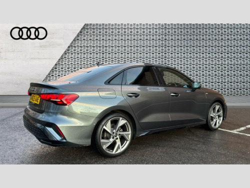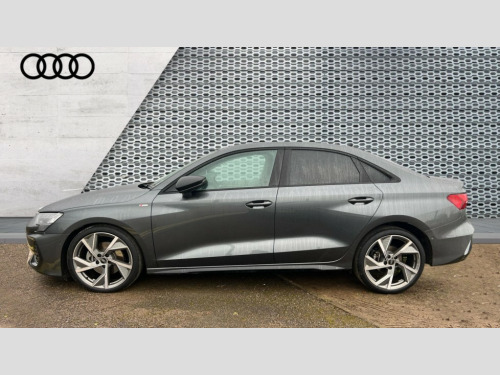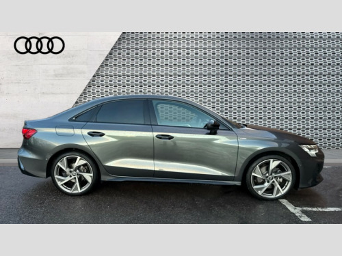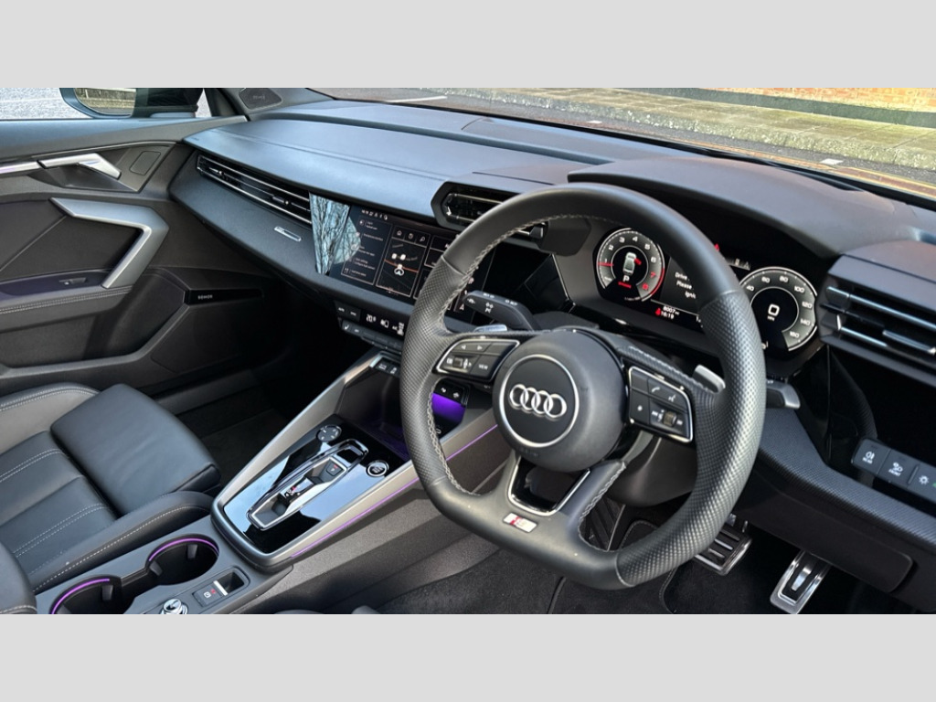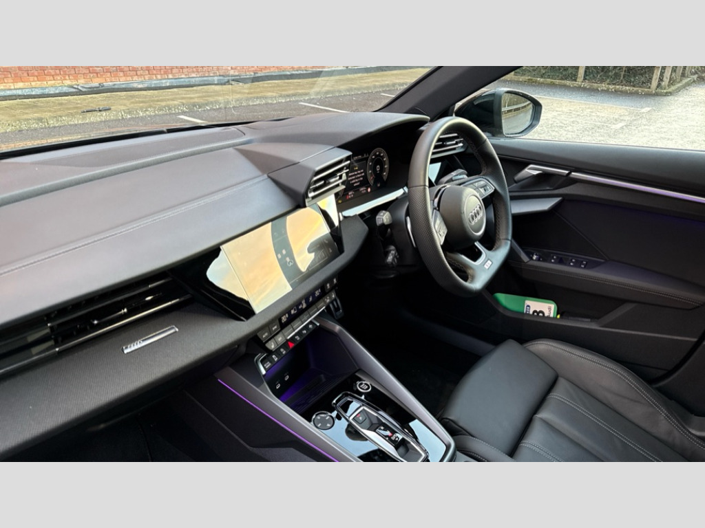 Audi A3 35 TFSI Black Edition 4dr S Tronic Adjustable speed limiter, Audi drive select, Audi smartphone interface with app store includes wireless Apple carplay, Android auto and Amazon alexa integration, Audi virtual cockpit plus - 12.3" full HD resolution dynamic digital instrument cluster, Automatic start/stop system with recuperation, Bluetooth interface, Camera based traffic sign recognition, Collision avoidance assistant, Cruise control, Distraction and Fatigue warning, e-Call (emergency call), Electromechanical power speed sensitive steering, Emergency assist, Lane departure warning system, MMI Navigation Plus with high resolution 10.1" colour touch screen display, Park Assist with parking system Plus, Service indicator, Trip computer, Voice control system with natural language interaction, Sports suspension, Audi Phonebox light with wireless charging, Audi sound system - 10 loudspeakers including centre loudspeaker and subwoofer, DAB Digital radio, USB ports with charging function in the rear, Acoustic glass windscreen, All weather light, Anthracite grey Audi rings (front and rear), Audi beam uses LEDs to project the Audi logo onto the ground as you exit your A3, Auto dimming frameless rear view mirror, Automatic dynamic range control, Black accents front and rear bumpers, Black accents in the area of the Audi single frame grille, Black accents window trims strips, Dipped beam, main beam, position light and turning light, Electrically adjustable/heated/folding/auto dimming door mirrors with integrated LED indications + kerb view function for passenger side, Exterior model badging, Front and rear side air inlets in grained matt black with dark liquid chrome frame, Front electric windows, Heat insulating glass windscreen, Illuminated door sills with aluminium inserts at the front with S logo, Intersection light, LED 3rd brake light, LED brake lights, LED daytime running x3, LED headlights with LED rear lights and dynamic rear indicators, LED rear number plate lights, LED reverse light, LED tail lights, Light and rain sensors, Manoeuvring light, Motorway light, Privacy glass - dark tinted rear window, rear door and side windows, Rear boot, Rear diffuser and grill in grained matt black with inlay in dark liquid chrome, Rear electric windows, Rear side wing doors, Static cornering light, 12V socket and storage compartment in front centre console, 3 seat bench in 2nd row, 3 spoke flat bottomed leather multifunction sport steering wheel with gear shift paddles, 3-zone deluxe automatic air conditioning, 4 way electrically adjustable lumbar support for driver and front passenger, 40/20/40 split folding rear seat bench, Black cloth headlining, Black front and rear floor mats, Front and rear centre armrest in artificial leather with contrasting stitching on armrests and instrument panel, Front and rear headrests, Heated front seats, Height and reach adjustable steering wheel, Manual boot compartment lid, Manually adjustable front seats, Rear centre armrest with cupholder, S badging on the steering wheel, Seat side bolsters, Single front passenger seat, Stainless steel pedals and front footrest in black, Twin leather upholstery with front sports seats S embossed logo, Aluminium interior elements pack - A3, 3x3 point rear seat belts, Driver and front passenger airbag with passenger airbag deactivation, Electronic Stabilisation Control (ESC) including ABS, ASR and EDL, First aid kit with warning triangle and 2 safety vests, Front side airbags with head airbags and interaction airbag, Hill hold assist, Pre-sense front with pedestrian and cyclist detection, Seatbelt monitoring, Tyre pressure loss indicator, Anti theft alarm, Anti-theft wheel bolts, Electronically operated child locks, Immobiliser, Remote central locking with safelock, Black dashboard