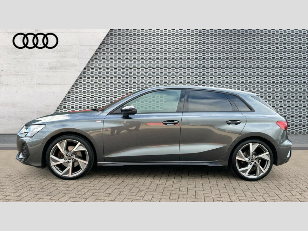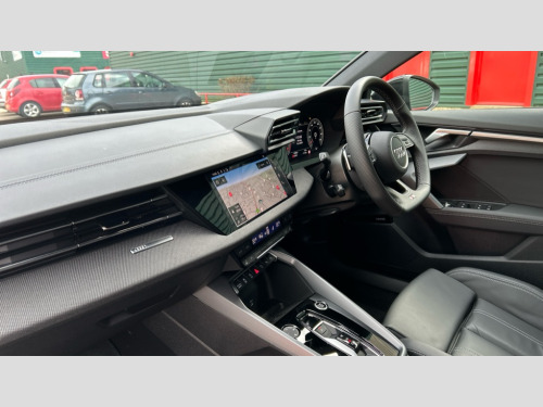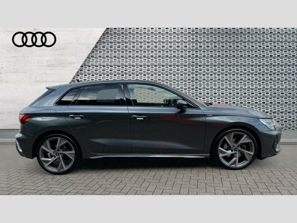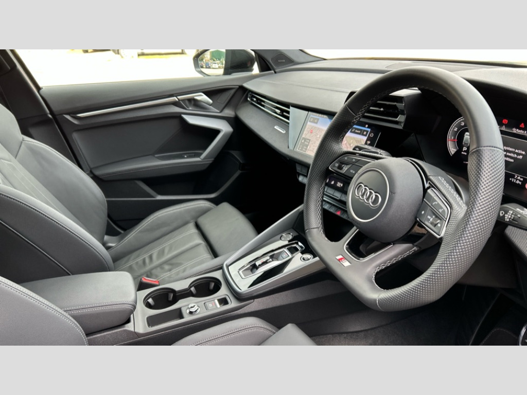 Audi A3 35 TFSI Black Edition 5dr S Tronic Adjustable speed limiter, Audi drive select, Audi smartphone interface with app store includes wireless Apple carplay, Android auto and Amazon alexa integration, Audi virtual cockpit plus - 12.3" full HD resolution dynamic digital instrument cluster, Automatic start/stop system with recuperation, Bluetooth interface, Camera based traffic sign recognition, Collision avoidance assistant, Cruise control, Distraction and Fatigue warning, e-Call (emergency call), Electromechanical power speed sensitive steering, Emergency assist, Lane departure warning system, MMI Navigation Plus with high resolution 10.1" colour touch screen display, Park Assist with parking system Plus, Service indicator, Tailgate, Trip computer, Voice control system with natural language interaction, Sports suspension, Audi Phonebox light with wireless charging, Audi sound system - 10 loudspeakers including centre loudspeaker and subwoofer, DAB Digital radio, USB ports with charging function in the rear, Acoustic glass windscreen, All weather light, Anthracite grey Audi rings (front and rear), Audi beam uses LEDs to project the Audi logo onto the ground as you exit your A3, Auto dimming frameless rear view mirror, Automatic dynamic range control, Black accents front and rear bumpers, Black accents in the area of the Audi single frame grille, Black accents window trims strips, Dipped beam, main beam, position light and turning light, Electrically adjustable/heated/folding/auto dimming door mirrors with integrated LED indications + kerb view function for passenger side, Exterior model badging, Front and rear side air inlets in grained matt black with dark liquid chrome frame, Front electric windows, Heat insulating glass windscreen, Illuminated door sills with aluminium inserts at the front with S logo, Intersection light, LED 3rd brake light, LED brake lights, LED daytime running x3, LED headlights with LED rear lights and dynamic rear indicators, LED rear number plate lights, LED reverse light, LED tail lights, Light and rain sensors, Manoeuvring light, Motorway light, Privacy glass - dark tinted rear window, rear door and side windows, Rear diffuser and grill in grained matt black with inlay in dark liquid chrome, Rear electric windows, Rear side wing doors, Rear wiper, S roof spoiler, Static cornering light, 12V socket and storage compartment in front centre console, 3 seat bench in 2nd row, 3 spoke flat bottomed leather multifunction sport steering wheel with gear shift paddles, 3-zone deluxe automatic air conditioning, 4 way electrically adjustable lumbar support for driver and front passenger, 40/20/40 split folding rear seat bench, Black cloth headlining, Black front and rear floor mats, Front and rear centre armrest in artificial leather with contrasting stitching on armrests and instrument panel, Front and rear headrests, Heated front seats, Height and reach adjustable steering wheel, Manual boot compartment lid, Manually adjustable front seats, Rear centre armrest with cupholder, S badging on the steering wheel, Seat side bolsters, Single front passenger seat, Stainless steel pedals and front footrest in black, Twin leather upholstery with front sports seats S embossed logo, Aluminium interior elements pack - A3, 3x3 point rear seat belts, Driver and front passenger airbag with passenger airbag deactivation, Electronic Stabilisation Control (ESC) including ABS, ASR and EDL, First aid kit with warning triangle and 2 safety vests, Front side airbags with head airbags and interaction airbag, Hill hold assist, Pre-sense front with pedestrian and cyclist detection, Seatbelt monitoring, Tyre pressure loss indicator, Anti theft alarm, Anti-theft wheel bolts, Electronically operated child locks, Immobiliser, Remote central locking with safelock, Black dashboard