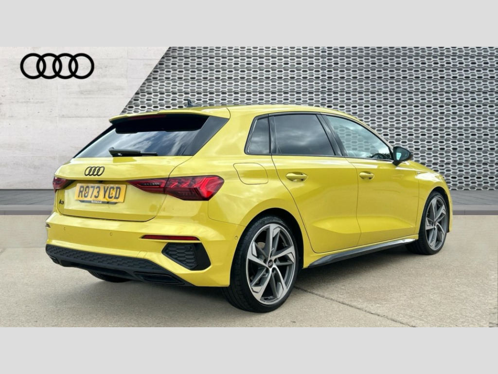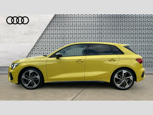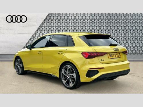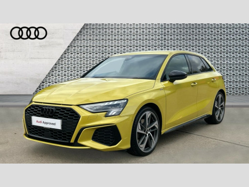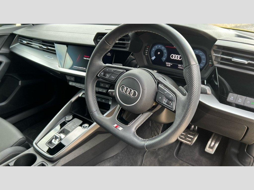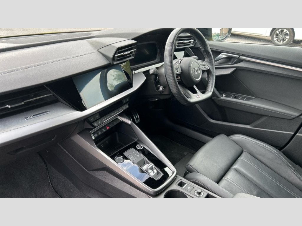 Audi A3 35 TFSI Black Edition 5dr S Tronic Audi drive select (Auto, Comfort, Dynamic, Efficiency and Individual), Audi smartphone interface, Audi Virtual Cockpit - 10.25" digital and colour instrument cluster, Automatic start/stop system with recuperation, Bluetooth interface, Camera based traffic sign recognition, Collision avoidance assistant, e-Call (emergency call), Electromechanical power speed sensitive steering, Lane departure warning system, MMI Navigation Plus with high resolution 10.1" colour touch screen display, Service indicator, Trip computer, Voice control system with natural language interaction, Sports suspension, 2xUSB-C connection with data and charging functions, DAB Digital radio, 3rd brake light, Acoustic glass windscreen, Audi beam uses LEDs to project the Audi logo onto the ground as you exit your A3, Auto dimming frameless rear view mirror, Electrically adjustable/heated/folding/auto dimming door mirrors with integrated LED indications + kerb view function for passenger side, Front electric windows, Illuminated door sills with aluminium inserts at the front with S logo, LED daytime running lights, LED headlights with LED rear lights and dynamic rear indicators, Light and rain sensors, Privacy glass - dark tinted rear window, rear door and side windows, Rear electric windows, Rear side air outlets in grained matt black, Rear side wing doors, Rear wiper, S roof spoiler, 12V socket and storage compartment in front centre console, 3 seat bench in 2nd row, 3 spoke flat bottomed leather multifunction sport steering wheel with gear shift paddles, 4 way electrically adjustable lumbar support for driver and front passenger, 60/40 split folding rear seat bench, Black cloth headlining, Dual zone electronic climate control, Front and rear centre armrest in artificial leather, Front and rear headrests, Front/rear floor mats, Height and reach adjustable steering wheel, Interior lighting - glove compartment light and right hand side, Luggage compartment floor covering, Manual boot compartment lid, Seat side bolsters, Single front passenger seat, Stainless steel pedals and front footrest in black, Twin leather upholstery with front sports seats S embossed logo, Aluminium interior elements pack - A3 Sportback, Black styling pack - A3 Sportback/Black edition, LED interior lighting pack - A3 Sportback, Technology pack - A3 Sportback, 3x3 point rear seat belts, Driver and front passenger airbag with passenger airbag deactivation, Electronic Stabilisation Control (ESC) including ABS, ASR and EDL, First aid kit with warning triangle and 2 safety vests, Front side airbags with head airbags and interaction airbag, Pre-sense front with pedestrian and cyclist detection, Seatbelt monitoring, Tyre pressure loss indicator, Anti theft alarm, Anti-theft wheel bolts, Electronically operated child locks, Immobiliser, Remote control central locking, Dark spectrum aluminium inlays, accent surfaces in the dashboard and centre console in platinum grey silk effect paint finish, 19" 5 arm trapezoid design alloy wheels in matt grey with diamond cut finish