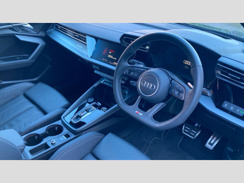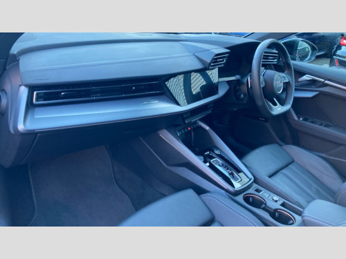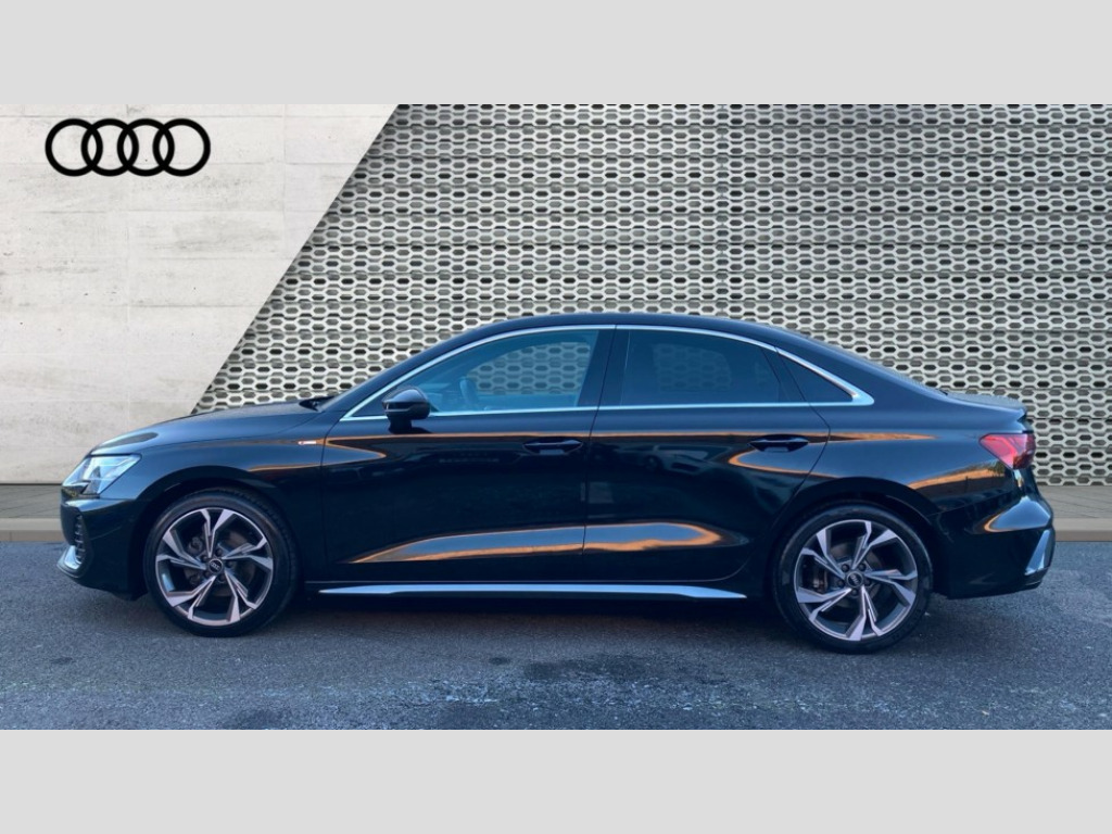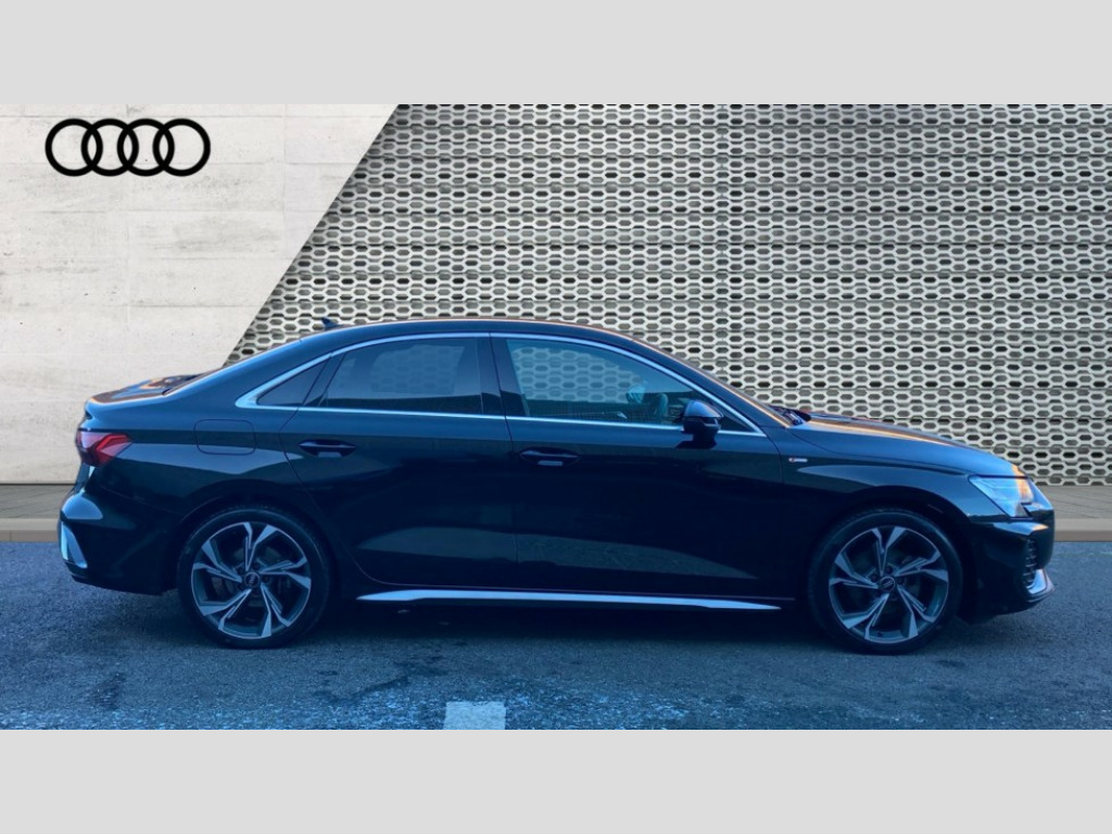 Audi A3 35 TFSI S Line 4dr S Tronic Adjustable speed limiter, Audi drive select, Audi smartphone interface with app store includes wireless Apple carplay, Android auto and Amazon alexa integration, Audi virtual cockpit plus - 12.3" full HD resolution dynamic digital instrument cluster, Automatic start/stop system with recuperation, Bluetooth interface, Camera based traffic sign recognition, Collision avoidance assistant, Cruise control, Distraction and Fatigue warning, e-Call (emergency call), Electromechanical power speed sensitive steering, Emergency assist, Lane departure warning system, MMI Navigation Plus with high resolution 10.1" colour touch screen display, Park Assist with parking system Plus, Service indicator, Trip computer, Voice control system with natural language interaction, Sports suspension, Audi Phonebox light with wireless charging, Audi sound system - 10 loudspeakers including centre loudspeaker and subwoofer, DAB Digital radio, USB ports with charging function in the rear, Acoustic glass windscreen, All weather light, Aluminium window trim, Auto dimming frameless rear view mirror, Automatic dynamic range control, Body colour exterior mirrors, Chrome exhaust tailpipes, Dipped beam, main beam, position light and turning light, Electrically adjustable/heated/folding/auto dimming door mirrors with integrated LED indications + kerb view function for passenger side, Exterior model badging, Front and rear side air inlets in grained matt black with dark liquid chrome frame, Front electric windows, Front radiator grill in high gloss dark chrome, Heat insulating glass windscreen, Illuminated door sills with aluminium inserts at the front with S logo, Intersection light, LED 3rd brake light, LED brake lights, LED daytime running x3, LED headlights with LED rear lights and dynamic rear indicators, LED rear number plate lights, LED reverse light, LED tail lights, Light and rain sensors, Manoeuvring light, Motorway light, Privacy glass - dark tinted rear window, rear door and side windows, Rear boot, Rear diffuser and grill in grained matt black with inlay in dark liquid chrome, Rear electric windows, Rear side wing doors, S line bumpers, Side S line emblems on front wings, Side sill trim in dark liquid chrome, Static cornering light, 12V socket and storage compartment in front centre console, 3 seat bench in 2nd row, 3 spoke flat bottomed leather multifunction sport steering wheel with gear shift paddles, 3-zone deluxe automatic air conditioning, 4 way electrically adjustable lumbar support for driver and front passenger, 40/20/40 split folding rear seat bench, Black cloth headlining, Black front and rear floor mats, Front and rear centre armrest in artificial leather with contrasting stitching on armrests and instrument panel, Front and rear headrests, Heated front seats, Height and reach adjustable steering wheel, Manual boot compartment lid, Manually adjustable front seats, Rear centre armrest with cupholder, S badging on the steering wheel, Seat side bolsters, Single front passenger seat, Stainless steel pedals and front footrest in black, Twin leather upholstery with front sports seats S embossed logo, Aluminium interior elements pack - A3, Multi-coloured LED interior lighting package with Multi-coloured contour lighting of instrument panel - A3, 3x3 point rear seat belts, Driver and front passenger airbag with passenger airbag deactivation, Electronic Stabilisation Control (ESC) including ABS, ASR and EDL, First aid kit with warning triangle and 2 safety vests, Front side airbags with head airbags and interaction airbag, Hill hold assist, Pre-sense front with pedestrian and cyclist detection, Seatbelt monitoring, Tyre pressure loss indicator, Anti theft alarm, Anti-theft wheel bolts, Electronically operated child locks, Immobiliser, Remote central locking with safelock, Black dashboard, Inlay in dark aluminium spectrum