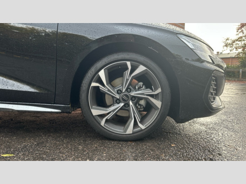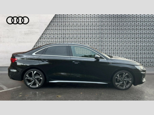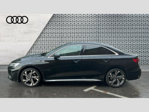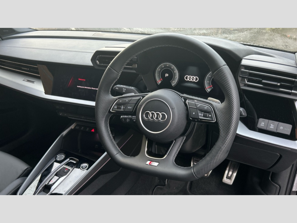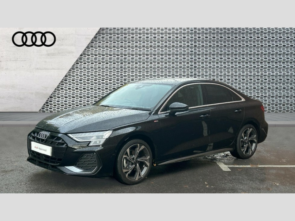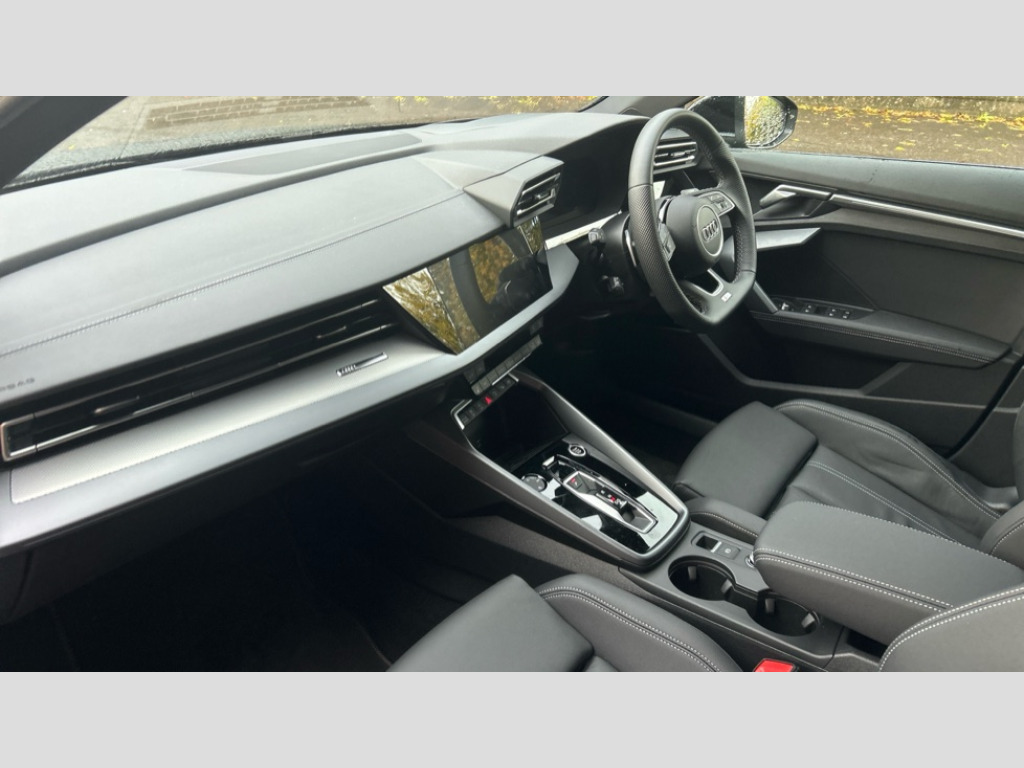 Audi A3 35 TFSI S Line 4dr S Tronic Adjustable speed limiter, Audi drive select, Audi smartphone interface with app store includes wireless Apple carplay, Android auto and Amazon alexa integration, Audi virtual cockpit plus - 12.3" full HD resolution dynamic digital instrument cluster, Automatic start/stop system with recuperation, Bluetooth interface, Camera based traffic sign recognition, Collision avoidance assistant, Distraction and Fatigue warning, e-Call (emergency call), Electromechanical power speed sensitive steering, Emergency assist, Lane departure warning system, MMI Navigation Plus with high resolution 10.1" colour touch screen display, Park Assist with parking system Plus, Service indicator, Trip computer, Voice control system with natural language interaction, Sports suspension, Audi Phonebox light with wireless charging, DAB Digital radio, USB ports with charging function in the rear, All weather light, Aluminium window trim, Auto dimming frameless rear view mirror, Automatic dynamic range control, Body colour exterior mirrors, Chrome exhaust tailpipes, Dipped beam, main beam, position light and turning light, Electrically adjustable/heated/folding/auto dimming door mirrors with integrated LED indications + kerb view function for passenger side, Exterior model badging, Front and rear side air inlets in grained matt black with dark liquid chrome frame, Front electric windows, Front radiator grill in high gloss dark chrome, Heat insulating glass windscreen, Illuminated door sills with aluminium inserts at the front with S logo, Intersection light, LED 3rd brake light, LED brake lights, LED daytime running x3, LED headlights with LED rear lights and dynamic rear indicators, LED rear number plate lights, LED reverse light, LED tail lights, Light and rain sensors, Manoeuvring light, Motorway light, Privacy glass - dark tinted rear window, rear door and side windows, Rear boot, Rear diffuser and grill in grained matt black with inlay in dark liquid chrome, Rear electric windows, Rear side wing doors, S line bumpers, Side S line emblems on front wings, Side sill trim in dark liquid chrome, Static Cornering lights, 12V socket and storage compartment in front centre console, 3 seat bench in 2nd row, 3 spoke flat bottomed leather multifunction sport steering wheel with gear shift paddles, 3-zone deluxe automatic air conditioning, 4 way electrically adjustable lumbar support for driver and front passenger, 40/20/40 split folding rear seat bench, Black cloth headlining, Black front and rear floor mats, Front and rear centre armrest in artificial leather with contrasting stitching on armrests and instrument panel, Front and rear headrests, Heated front seats, Height and reach adjustable steering wheel, Manual boot compartment lid, Manually adjustable front seats, Rear centre armrest with cupholder, S badging on the steering wheel, Seat side bolsters, Single front passenger seat, Stainless steel pedals and front footrest in black, Twin leather upholstery with front sports seats S embossed logo, Aluminium interior elements pack - A3, Multi-coloured LED interior lighting package with Multi-coloured contour lighting of instrument panel - A3, Technology package - A3, 3x3 point rear seat belts, Driver and front passenger airbag with passenger airbag deactivation, Electronic Stabilisation Control (ESC) including ABS, ASR and EDL, First aid kit with warning triangle and 2 safety vests, Front side airbags with head airbags and interaction airbag, Hill hold assist, Pre-sense front with pedestrian and cyclist detection, Seatbelt monitoring, Tyre pressure loss indicator, Anti theft alarm, Anti-theft wheel bolts, Electronically operated child locks, Immobiliser, Remote central locking with safelock, Black dashboard, Inlay in dark aluminium spectrum