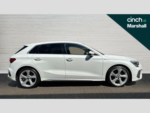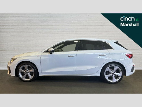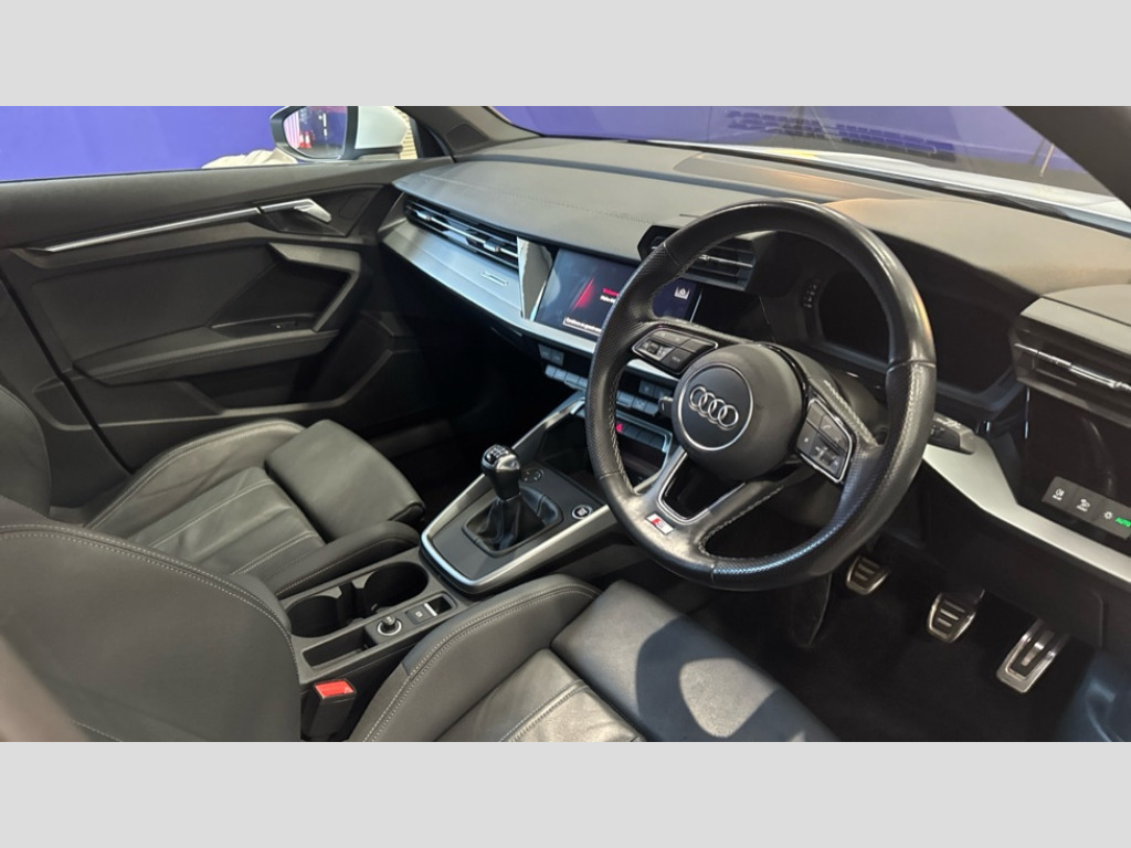 Audi A3 35 TFSI S Line 5dr Audi connect emergency call and service, Audi drive select (Auto, Comfort, Dynamic, Efficiency and Individual), Audi smartphone interface, Audi Virtual Cockpit - 10.25" digital and colour instrument cluster, Automatic start/stop system with recuperation, Bluetooth interface, Collision avoidance assistant, Electromechanical power speed sensitive steering, Lane departure warning system, MMI Navigation Plus with high resolution 10.1" colour touch screen display, Service indicator, Trip computer, Voice control system with natural language interaction, 2xUSB-C connection with data and charging functions, 6 passive loudspeakers, DAB Digital radio, Acoustic glass windscreen, Aluminium window trim, Auto dimming frameless rear view mirror, Electrically adjustable/heated/folding/auto dimming door mirrors with integrated LED indications + kerb view function for passenger side, Front electric windows, Illuminated aluminium inserts front door sills with S logo, LED daytime running lights, LED headlights with LED rear lights and dynamic rear indicators, Light and rain sensors, Privacy glass - dark tinted rear window, rear door and side windows, Rear electric windows, Rear side air outlets in grained matt black, Rear wiper, S line bumpers, S roof spoiler, 12V socket and storage compartment in front centre console, 40/20/40 split folding rear seat bench with cupholder, Black cloth headlining, Dual zone electronic climate control, Front and rear centre armrest in leather, Front and rear headrests, Front/rear floor mats, Height and reach adjustable steering wheel, Interior lighting - glove compartment light and right hand side, Luggage compartment floor covering, Manual boot compartment lid, Manually adjustable front seats, Seat side bolsters, Stainless steel pedals and front footrest, Twin leather upholstery with front sports seats S embossed logo, Aluminium interior elements pack - A3 Sportback, S line styling pack - A3 Sportback, 3x3 point rear seat belts, Driver and front passenger airbag with passenger airbag deactivation, Electronic Stabilisation Control (ESC) including ABS, ASR and EDL, First aid kit with warning triangle and 2 safety vests, Front side airbags with head airbags and interaction airbag, Hill hold assist, Pre-sense front with pedestrian and cyclist detection, Seatbelt monitoring, Tyre pressure loss indicator, Anti theft alarm, Anti-theft wheel bolts, Electronically operated child lock, Immobiliser, Remote control central locking, Accent surfaces in the dashboard and centre console in platinum grey silk effect paint finish, Dark spectrum aluminium inlays