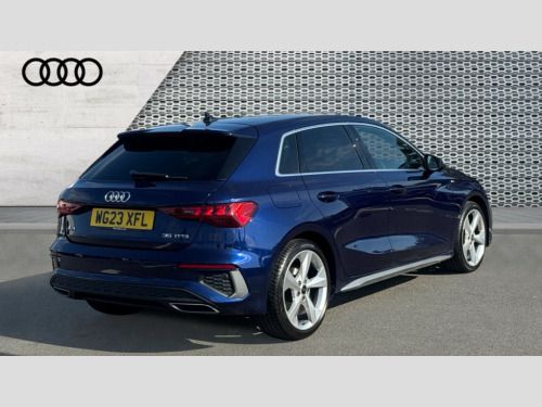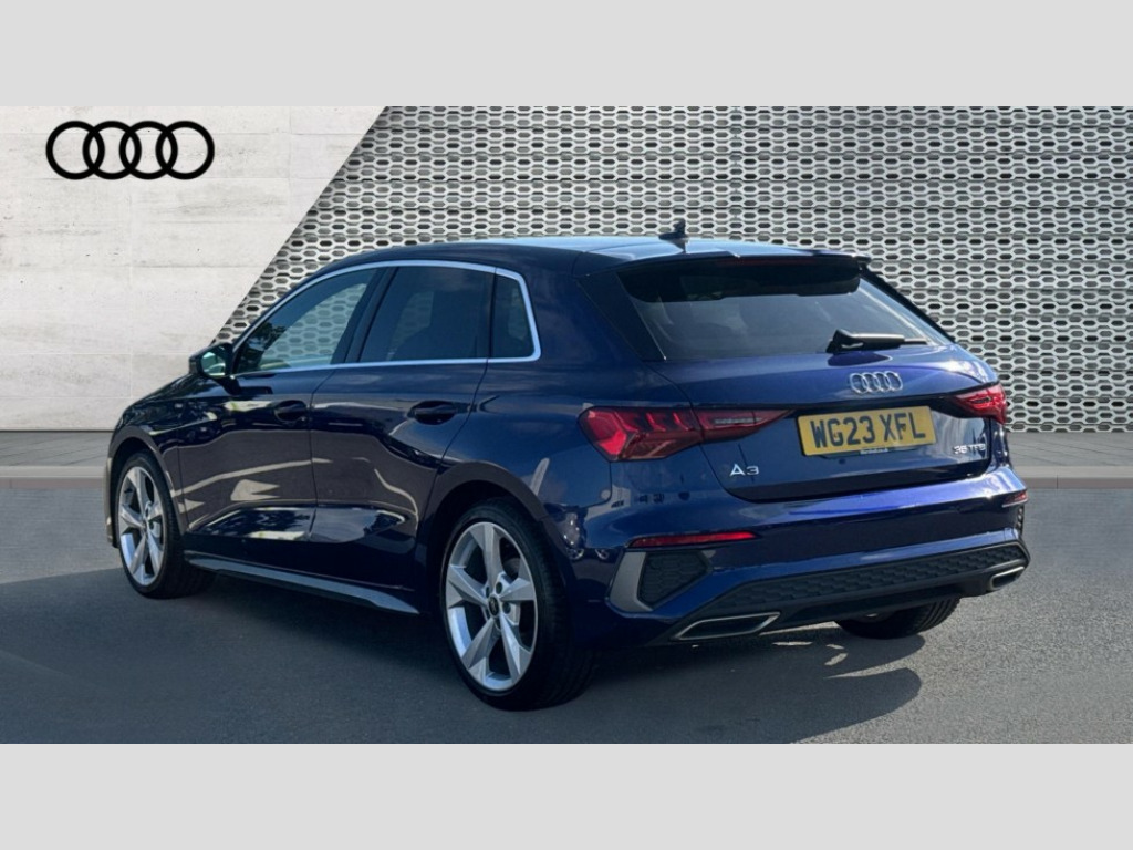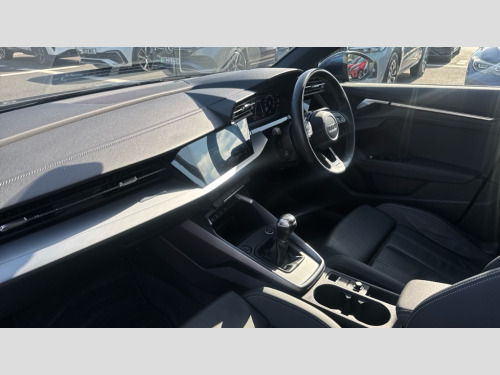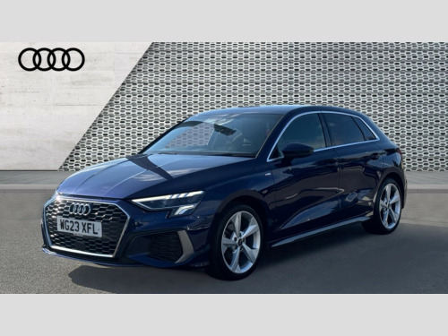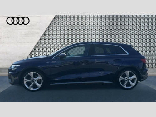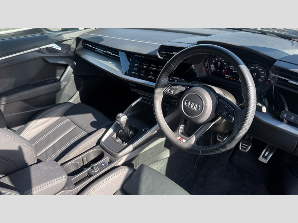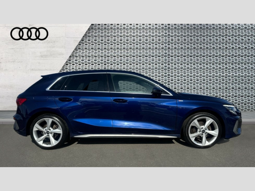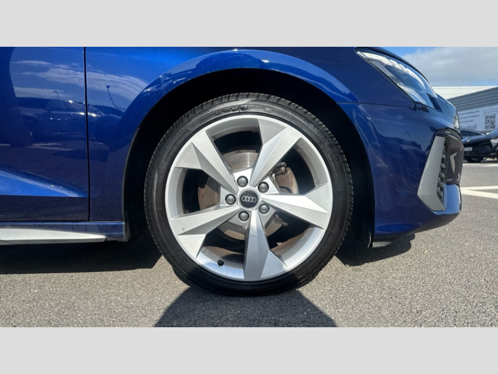 Audi A3 35 TFSI S Line 5dr Audi drive select (Auto, Comfort, Dynamic, Efficiency and Individual), Audi smartphone interface, Audi Virtual Cockpit - 10.25" digital and colour instrument cluster, Automatic start/stop system with recuperation, Bluetooth interface, Camera based traffic sign recognition, Collision avoidance assistant, Cruise control, e-Call (emergency call), Electromechanical power speed sensitive steering, Lane departure warning system, MMI Navigation Plus with high resolution 10.1" colour touch screen display, Rear parking sensors, Service indicator, Trip computer, Voice control system with natural language interaction, Sports suspension, 2xUSB-C connection with data and charging functions, 6 passive loudspeakers, DAB Digital radio, 3rd brake light, Acoustic glass windscreen, Aluminium window trim, Auto dimming frameless rear view mirror, Body colour exterior mirrors, Electrically adjustable/heated/folding/auto dimming door mirrors with integrated LED indications + kerb view function for passenger side, Front electric windows, Illuminated aluminium inserts front door sills with S logo, LED daytime running lights, LED headlights with LED rear lights and dynamic rear indicators, Light and rain sensors, Privacy glass - dark tinted rear window, rear door and side windows, Rear electric windows, Rear side air outlets in grained matt black, Rear side wing doors, Rear wiper, S line bumpers, S roof spoiler, 12V socket and storage compartment in front centre console, 3 seat bench in 2nd row, 3 spoke leather multifunction steering wheel, 4 way electrically adjustable lumbar support for driver and front passenger, 60/40 split folding rear seat bench, Black cloth headlining, Dual zone electronic climate control, Front and rear centre armrest in leather, Front and rear headrests, Front/rear floor mats, Height and reach adjustable steering wheel, Interior lighting - glove compartment light and right hand side, Luggage compartment floor covering, Manual boot compartment lid, Manually adjustable front seats, Seat side bolsters, Single front passenger seat, Stainless steel pedals and front footrest in black, Twin leather upholstery with front sports seats S embossed logo, Aluminium interior elements pack - A3 Sportback, LED interior lighting pack - A3 Sportback, S line styling pack - A3 Sportback, 3x3 point rear seat belts, Driver and front passenger airbag with passenger airbag deactivation, Electronic Stabilisation Control (ESC) including ABS, ASR and EDL, First aid kit with warning triangle and 2 safety vests, Front side airbags with head airbags and interaction airbag, Pre-sense front with pedestrian and cyclist detection, Seatbelt monitoring, Tyre pressure loss indicator, Anti theft alarm, Anti-theft wheel bolts, Electronically operated child lock, Immobiliser, Remote control central locking, Dark spectrum aluminium inlays, accent surfaces in the dashboard and centre console in platinum grey silk effect paint finish