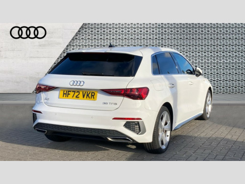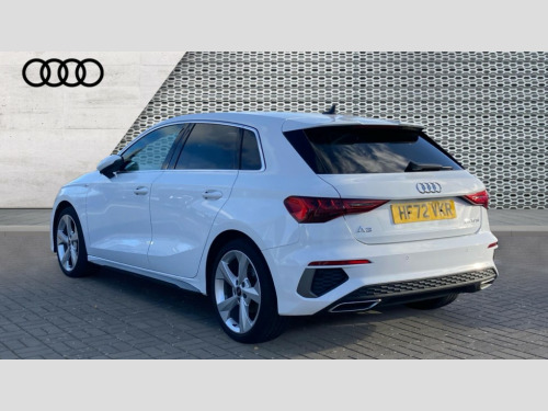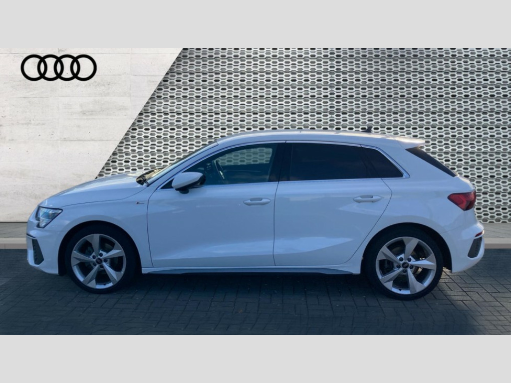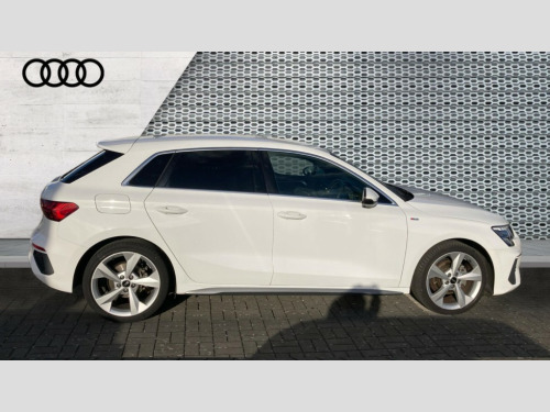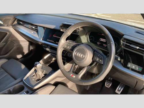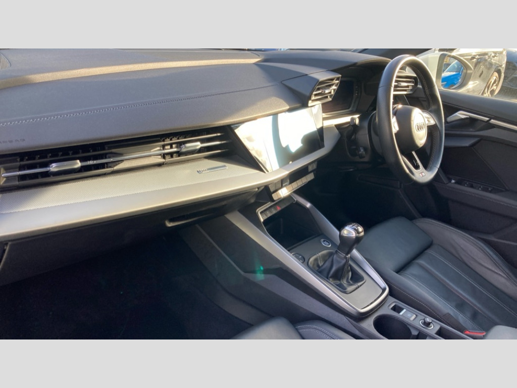 Audi A3 35 TFSI S Line 5dr Audi drive select (Auto, Comfort, Dynamic, Efficiency and Individual), Audi smartphone interface, Audi Virtual Cockpit - 10.25" digital and colour instrument cluster, Automatic start/stop system with recuperation, Bluetooth interface, Collision avoidance assistant, Cruise control, e-Call (emergency call), Electromechanical power speed sensitive steering, Lane departure warning system, MMI Navigation Plus with high resolution 10.1" colour touch screen display, Rear parking sensors, Service indicator, Trip computer, Voice control system with natural language interaction, 2xUSB-C connection with data and charging functions, 6 passive loudspeakers, DAB Digital radio, 3rd brake light, Acoustic glass windscreen, Aluminium window trim, Auto dimming frameless rear view mirror, Electrically adjustable/heated/folding/auto dimming door mirrors with integrated LED indications + kerb view function for passenger side, Front electric windows, Illuminated aluminium inserts front door sills with S logo, LED daytime running lights, LED headlights with LED rear lights and dynamic rear indicators, Light and rain sensors, Privacy glass - dark tinted rear window, rear door and side windows, Rear electric windows, Rear side air outlets in grained matt black, Rear side wing doors, Rear wiper, S line bumpers, S roof spoiler, 12V socket and storage compartment in front centre console, 3 seat bench in 2nd row, 40/20/40 split folding rear seat bench with cupholder, Black cloth headlining, Dual zone electronic climate control, Front and rear centre armrest in leather, Front and rear headrests, Front/rear floor mats, Height and reach adjustable steering wheel, Illuminated vanity mirror, Interior lighting - glove compartment light and right hand side, Luggage compartment floor covering, Manual boot compartment lid, Manually adjustable front seats, Seat side bolsters, Single front passenger seat, Stainless steel pedals and front footrest in black, Twin leather upholstery with front sports seats S embossed logo, Aluminium interior elements pack - A3 Sportback, S line styling pack - A3 Sportback, 3x3 point rear seat belts, Audi pre sense front, Driver and front passenger airbag with passenger airbag deactivation, Electronic Stabilisation Control (ESC) including ABS, ASR and EDL, First aid kit with warning triangle and 2 safety vests, Front side airbags with head airbags and interaction airbag, Pre-sense front with pedestrian and cyclist detection, Seatbelt monitoring, Tyre pressure loss indicator, Anti theft alarm, Anti-theft wheel bolts, Immobiliser, Manual child locks, Remote control central locking, Accent surfaces in the dashboard and centre console in platinum grey silk effect paint finish, Dark spectrum aluminium inlays