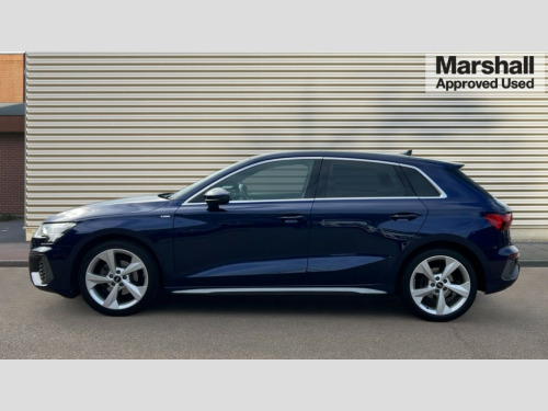 Audi A3 35 TFSI S Line 5dr S Tronic Audi drive select (Auto, Comfort, Dynamic, Efficiency and Individual), Audi smartphone interface, Audi Virtual Cockpit - 10.25" digital and colour instrument cluster, Automatic start/stop system with recuperation, Bluetooth interface, Collision avoidance assistant, e-Call (emergency call), Electromechanical power speed sensitive steering, Lane departure warning system, MMI Navigation Plus with high resolution 10.1" colour touch screen display, Service indicator, Trip computer, Voice control system with natural language interaction, 2xUSB-C connection with data and charging functions, 6 passive loudspeakers, DAB Digital radio, 3rd brake light, Acoustic glass windscreen, Aluminium window trim, Auto dimming frameless rear view mirror, Electrically adjustable/heated/folding/auto dimming door mirrors with integrated LED indications + kerb view function for passenger side, Front electric windows, Illuminated aluminium inserts front door sills with S logo, LED daytime running lights, LED headlights with LED rear lights and dynamic rear indicators, Light and rain sensors, Privacy glass - dark tinted rear window, rear door and side windows, Rear electric windows, Rear side air outlets in grained matt black, Rear side wing doors, Rear wiper, S line bumpers, S roof spoiler, 12V socket and storage compartment in front centre console, 3 seat bench in 2nd row, 40/20/40 split folding rear seat bench with cupholder, Black cloth headlining, Dual zone electronic climate control, Front and rear centre armrest in leather, Front and rear headrests, Front/rear floor mats, Height and reach adjustable steering wheel, Illuminated vanity mirror, Interior lighting - glove compartment light and right hand side, Luggage compartment floor covering, Manual boot compartment lid, Manually adjustable front seats, Seat side bolsters, Single front passenger seat, Stainless steel pedals and front footrest in black, Twin leather upholstery with front sports seats S embossed logo, Aluminium interior elements pack - A3 Sportback, LED interior lighting pack - A3 Sportback, S line styling pack - A3 Sportback, 3x3 point rear seat belts, Audi pre sense front, Driver and front passenger airbag with passenger airbag deactivation, Electronic Stabilisation Control (ESC) including ABS, ASR and EDL, First aid kit with warning triangle and 2 safety vests, Front side airbags with head airbags and interaction airbag, Pre-sense front with pedestrian and cyclist detection, Seatbelt monitoring, Tyre pressure loss indicator, Anti theft alarm, Anti-theft wheel bolts, Electronically operated child lock, Immobiliser, Remote control central locking, Accent surfaces in the dashboard and centre console in platinum grey silk effect paint finish, Dark spectrum aluminium inlays