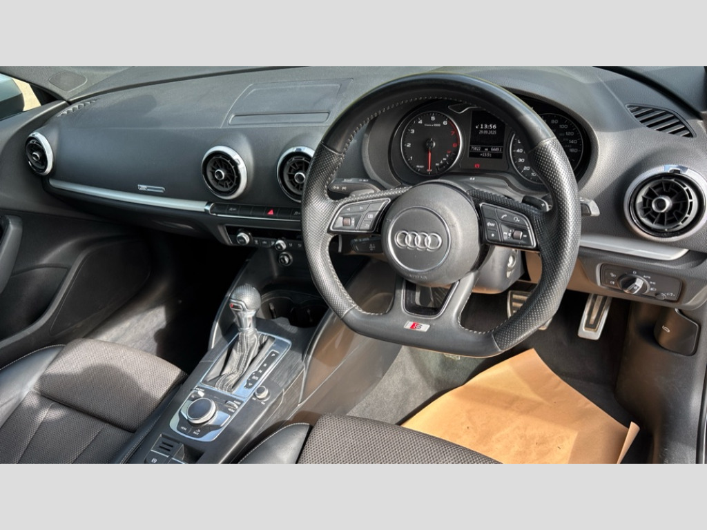 Audi A3 35 TFSI S Line 5dr S Tronic Audi connect, Audi drive select, Audi smartphone interface, Automatic start/stop system, Colour driver's information system display, Electro - mechanical power assisted steering, Mobile telephone preparation - bluetooth interface, SD card based satellite navigation system, Service interval indicator, Speed limit display, Voice control system, Voice recognition for navigation system, 2 USB interfaces and Aux-In jack, Audi music interface, CD player, DAB Digital radio, MMI radio plus with 7" colour MMI screen and MMI controller, Aluminium window trim, Auto dimming rear view mirror with light and rain sensors, Body colour door mirrors, Chrome exhaust tailpipes, Electric front windows, Electric rear windows, Electrically adjustable and heated door mirrors with integrated LED side indicators, Heated windscreen washer jets, LED daytime running lights, Matt black radiator grille, Rear wiper, S line badges on front wings, S Line body styling with front & rear bumpers and side skirts, radiator grille and rear diffuser insert, roof spoiler, Sport specific side air inlet grille and diffuser insert, 3 adjustable rear headrests, 4 lashing points to secure luggage, Adjustable front centre armrest, Black cloth headlining, Dual zone electronic climate control, Front and rear interior lights with delay, Front/rear floor mats, Glovebox light, Height and reach adjustable steering wheel, Illuminated door sill trims with S logo, Isofix child seat preparation for front passenger/outer rear seats inc passenger airbag deactivation, Stainless steel pedals, Storage compartments in doors side trims, centre console and under front drivers seat, LED interior light pack - A3/RS3, Non smoking pack - A3, Storage and luggage pack - A3/RS3, 3 point seatbelts on all seats, ABS/EBD, Active bonnet, Active front headrests, Airbags - front driver/passenger, front & rear side, curtain, drivers knee, ASR, EDL, Electromechanical parking brake, ESC - Electronic Stability Control + traction control, Front passenger airbag deactivation, Hill hold assist, Manual rear child locks, Multi-Collision braking, Seatbelt warning, Tyre pressure warning, Warning triangle and first aid kit, Anti theft alarm, Anti-theft wheel bolts, Remote control central locking, Thatcham category 1 alarm + immobiliser, Aluminium air vent surrounds, Aluminium trim elements, Matt brushed aluminium inlays, Tool kit, Tyre repair kit