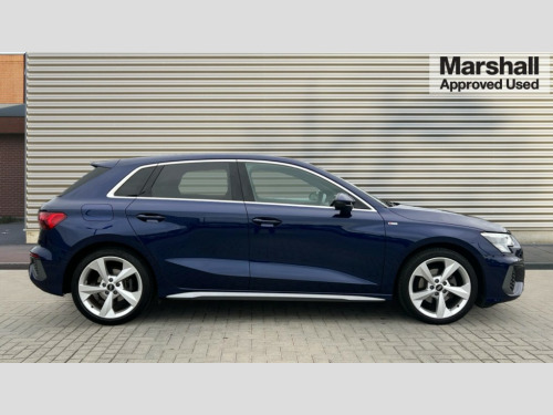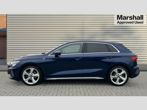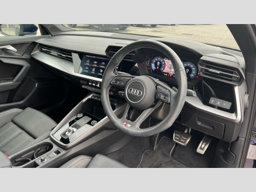Audi A3 35 TFSI S Line 5dr S Tronic Audi drive select (Auto, Comfort, Dynamic, Efficiency and Individual), Audi smartphone interface, Audi Virtual Cockpit - 10.25" digital and colour instrument cluster, Automatic start/stop system with recuperation, Bluetooth interface, Camera based traffic sign recognition, Collision avoidance assistant, e-Call (emergency call), Electromechanical power speed sensitive steering, Lane departure warning system, MMI Navigation Plus with high resolution 10.1" colour touch screen display, Service indicator, Trip computer, Voice control system with natural language interaction, Sports suspension, 2xUSB-C connection with data and charging functions, 6 passive loudspeakers, DAB Digital radio, 3rd brake light, Acoustic glass windscreen, Aluminium window trim, Auto dimming frameless rear view mirror, Body colour exterior mirrors, Electrically adjustable/heated/folding/auto dimming door mirrors with integrated LED indications + kerb view function for passenger side, Front electric windows, Illuminated door sills with aluminium inserts at the front with S logo, LED daytime running lights, LED headlights with LED rear lights and dynamic rear indicators, Light and rain sensors, Privacy glass - dark tinted rear window, rear door and side windows, Rear electric windows, Rear side air outlets in grained matt black, Rear side wing doors, Rear wiper, S line bumpers, S roof spoiler, 12V socket and storage compartment in front centre console, 3 seat bench in 2nd row, 3 spoke leather multifunction steering wheel with paddle shift, 4 way electrically adjustable lumbar support for driver and front passenger, 60/40 split folding rear seat bench, Black cloth headlining, Dual zone electronic climate control, Front and rear centre armrest in artificial leather, Front and rear headrests, Front/rear floor mats, Height and reach adjustable steering wheel, Interior lighting - glove compartment light and right hand side, Luggage compartment floor covering, Manual boot compartment lid, Manually adjustable front seats, Seat side bolsters, Single front passenger seat, Stainless steel pedals and front footrest in black, Twin leather upholstery with front sports seats S embossed logo, Aluminium interior elements pack - A3 Sportback, LED interior lighting pack - A3 Sportback, S line styling pack - A3 Sportback, 3x3 point rear seat belts, Driver and front passenger airbag with passenger airbag deactivation, Electronic Stabilisation Control (ESC) including ABS, ASR and EDL, First aid kit with warning triangle and 2 safety vests, Front side airbags with head airbags and interaction airbag, Pre-sense front with pedestrian and cyclist detection, Seatbelt monitoring, Tyre pressure loss indicator, Anti theft alarm, Anti-theft wheel bolts, Electronically operated child locks, Immobiliser, Remote control central locking, Dark spectrum aluminium inlays, accent surfaces in the dashboard and centre console in platinum grey silk effect paint finish