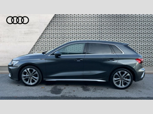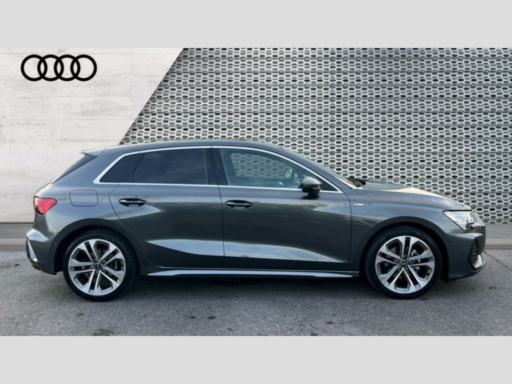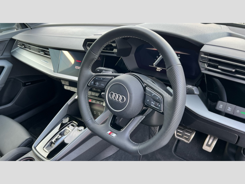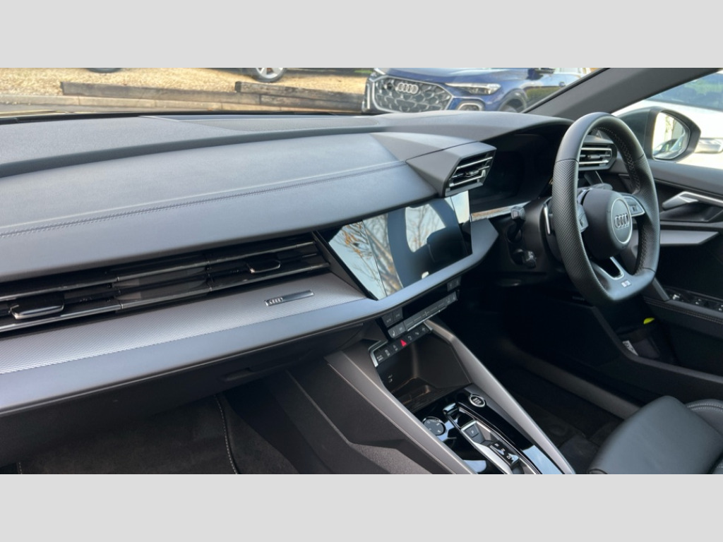 Audi A3 35 TFSI S Line 5dr S Tronic Adjustable speed limiter, Audi drive select, Audi smartphone interface with app store includes wireless Apple carplay, Android auto and Amazon alexa integration, Audi virtual cockpit plus - 12.3" full HD resolution dynamic digital instrument cluster, Automatic start/stop system with recuperation, Bluetooth interface, Camera based traffic sign recognition, Collision avoidance assistant, Cruise control, Distraction and Fatigue warning, e-Call (emergency call), Electromechanical power speed sensitive steering, Emergency assist, Lane departure warning system, MMI Navigation Plus with high resolution 10.1" colour touch screen display, Park Assist with parking system Plus, Service indicator, Tailgate, Trip computer, Voice control system with natural language interaction, Sports suspension, Audi Phonebox light with wireless charging, Audi sound system - 10 loudspeakers including centre loudspeaker and subwoofer, DAB Digital radio, USB ports with charging function in the rear, Acoustic glass windscreen, All weather light, Aluminium window trim, Auto dimming frameless rear view mirror, Automatic dynamic range control, Body colour exterior mirrors, Chrome exhaust tailpipes, Dipped beam, main beam, position light and turning light, Electrically adjustable/heated/folding/auto dimming door mirrors with integrated LED indications + kerb view function for passenger side, Exterior model badging, Front and rear side air inlets in grained matt black with dark liquid chrome frame, Front electric windows, Front radiator grill in high gloss dark chrome, Heat insulating glass windscreen, Illuminated door sills with aluminium inserts at the front with S logo, Intersection light, LED 3rd brake light, LED brake lights, LED daytime running x3, LED headlights with LED rear lights and dynamic rear indicators, LED rear number plate lights, LED reverse light, LED tail lights, Light and rain sensors, Manoeuvring light, Motorway light, Privacy glass - dark tinted rear window, rear door and side windows, Rear diffuser and grill in grained matt black with inlay in dark liquid chrome, Rear electric windows, Rear side wing doors, Rear wiper, S line bumpers, S roof spoiler, Side S line emblems on front wings, Side sill trim in dark liquid chrome, Static cornering light, 12V socket and storage compartment in front centre console, 3 seat bench in 2nd row, 3 spoke flat bottomed leather multifunction sport steering wheel with gear shift paddles, 3-zone deluxe automatic air conditioning, 4 way electrically adjustable lumbar support for driver and front passenger, 40/20/40 split folding rear seat bench, Black cloth headlining, Black front and rear floor mats, Front and rear centre armrest in artificial leather with contrasting stitching on armrests and instrument panel, Front and rear headrests, Heated front seats, Height and reach adjustable steering wheel, Manual boot compartment lid, Manually adjustable front seats, Rear centre armrest with cupholder, S badging on the steering wheel, Seat side bolsters, Single front passenger seat, Stainless steel pedals and front footrest in black, Twin leather upholstery with front sports seats S embossed logo, Aluminium interior elements pack - A3, Multi-coloured LED interior lighting package with Multi-coloured contour lighting of instrument panel - A3, 3x3 point rear seat belts, Driver and front passenger airbag with passenger airbag deactivation, Electronic Stabilisation Control (ESC) including ABS, ASR and EDL, First aid kit with warning triangle and 2 safety vests, Front side airbags with head airbags and interaction airbag, Hill hold assist, Pre-sense front with pedestrian and cyclist detection, Seatbelt monitoring, Tyre pressure loss indicator, Anti theft alarm, Anti-theft wheel bolts, Electronically operated child locks, Immobiliser, Remote central locking with safelock, Black dashboard, Inlay in dark aluminium spectrum