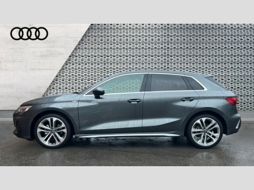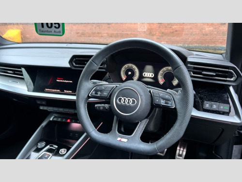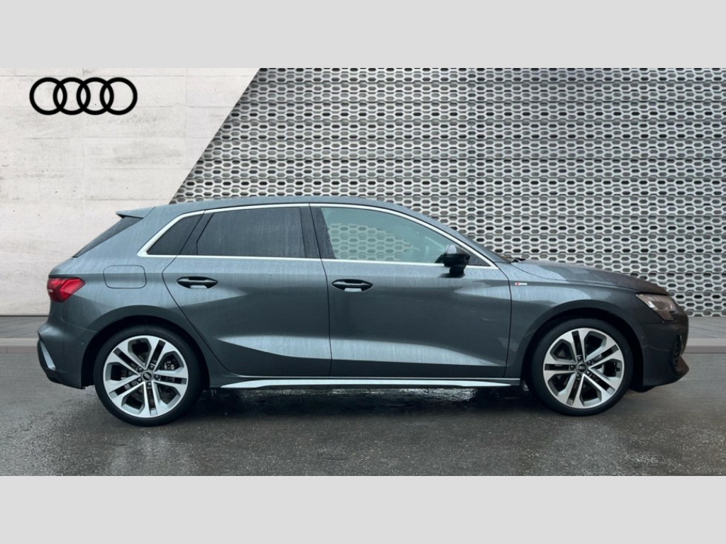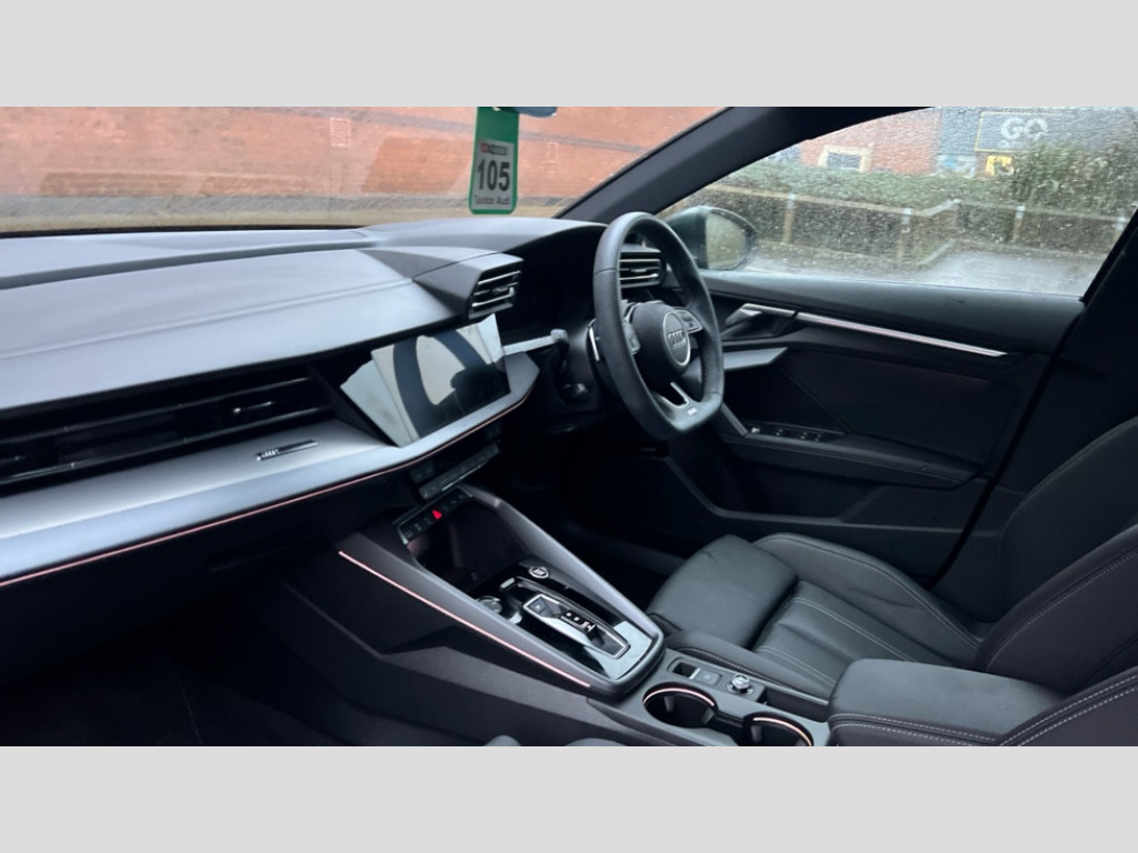 Audi A3 35 TFSI S Line 5dr S Tronic Adjustable speed limiter, Audi drive select, Audi smartphone interface with app store includes wireless Apple carplay, Android auto and Amazon alexa integration, Audi virtual cockpit plus - 12.3" full HD resolution dynamic digital instrument cluster, Automatic start/stop system with recuperation, Bluetooth interface, Camera based traffic sign recognition, Collision avoidance assistant, Cruise control, Distraction and Fatigue warning, e-Call (emergency call), Electromechanical power speed sensitive steering, Emergency assist, Lane departure warning system, MMI Navigation Plus with high resolution 10.1" colour touch screen display, Park Assist with parking system Plus, Service indicator, Tailgate, Trip computer, Voice control system with natural language interaction, Sports suspension, Audi Phonebox light with wireless charging, Audi sound system - 10 loudspeakers including centre loudspeaker and subwoofer, DAB Digital radio, USB ports with charging function in the rear, Acoustic glass windscreen, All weather light, Aluminium window trim, Auto dimming frameless rear view mirror, Automatic dynamic range control, Body colour exterior mirrors, Chrome exhaust tailpipes, Dipped beam, main beam, position light and turning light, Electrically adjustable/heated/folding/auto dimming door mirrors with integrated LED indications + kerb view function for passenger side, Exterior model badging, Front and rear side air inlets in grained matt black with dark liquid chrome frame, Front electric windows, Front radiator grill in high gloss dark chrome, Heat insulating glass windscreen, Illuminated door sills with aluminium inserts at the front with S logo, Intersection light, LED 3rd brake light, LED brake lights, LED daytime running x3, LED headlights with LED rear lights and dynamic rear indicators, LED rear number plate lights, LED reverse light, LED tail lights, Light and rain sensors, Manoeuvring light, Motorway light, Privacy glass - dark tinted rear window, rear door and side windows, Rear diffuser and grill in grained matt black with inlay in dark liquid chrome, Rear electric windows, Rear side wing doors, Rear wiper, S line bumpers, S roof spoiler, Side S line emblems on front wings, Side sill trim in dark liquid chrome, Static cornering light, 12V socket and storage compartment in front centre console, 3 seat bench in 2nd row, 3 spoke flat bottomed leather multifunction sport steering wheel with gear shift paddles, 3-zone deluxe automatic air conditioning, 4 way electrically adjustable lumbar support for driver and front passenger, 40/20/40 split folding rear seat bench, Black cloth headlining, Black front and rear floor mats, Front and rear centre armrest in artificial leather with contrasting stitching on armrests and instrument panel, Front and rear headrests, Heated front seats, Height and reach adjustable steering wheel, Manual boot compartment lid, Manually adjustable front seats, Rear centre armrest with cupholder, S badging on the steering wheel, Seat side bolsters, Single front passenger seat, Stainless steel pedals and front footrest in black, Twin leather upholstery with front sports seats S embossed logo, Aluminium interior elements pack - A3, Multi-coloured LED interior lighting package with Multi-coloured contour lighting of instrument panel - A3, 3x3 point rear seat belts, Driver and front passenger airbag with passenger airbag deactivation, Electronic Stabilisation Control (ESC) including ABS, ASR and EDL, First aid kit with warning triangle and 2 safety vests, Front side airbags with head airbags and interaction airbag, Hill hold assist, Pre-sense front with pedestrian and cyclist detection, Seatbelt monitoring, Tyre pressure loss indicator, Anti theft alarm, Anti-theft wheel bolts, Electronically operated child locks, Immobiliser, Remote central locking with safelock, Black dashboard, Inlay in dark aluminium spectrum