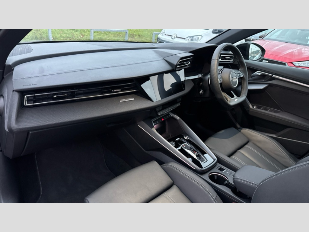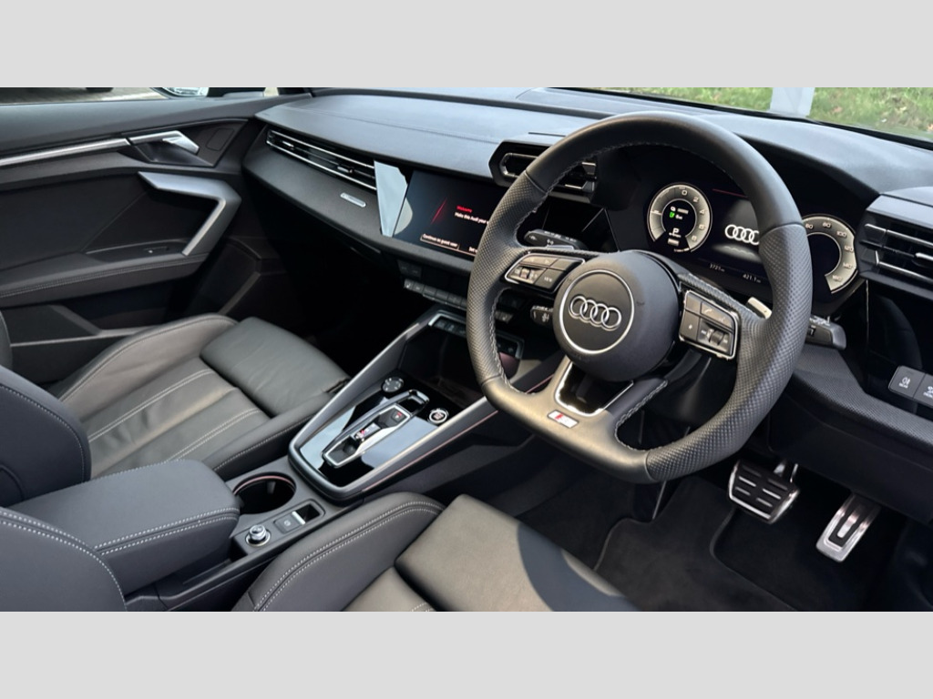 Audi A3 1.5 TFSI e 204 S Line 5dr S Tronic Adjustable speed limiter, Audi drive select, Audi smartphone interface with app store includes wireless Apple carplay, Android auto and Amazon alexa integration, Audi virtual cockpit plus - 12.3" full HD resolution dynamic digital instrument cluster, Automatic start/stop system with recuperation, Bluetooth interface, Camera based traffic sign recognition, Collision avoidance assistant, Cruise control, Distraction and Fatigue warning, e-Call (emergency call), Electromechanical power speed sensitive steering, Emergency assist, Lane departure warning system, MMI Navigation Plus with high resolution 10.1" colour touch screen display, Park Assist with parking system Plus, Service indicator, Trip computer, Voice control system with natural language interaction, 3 pin 10 amp domestic charging cable, CCS socket for DC charging, Charging cable for public charging, mode 3 (type 2), 32 A, Compact charging system, Industrial connector CEE 32 A, 230 V, length 1.6 m, Standard suspension, Type 2 socket for AC charging, Audi Phonebox light with wireless charging, Audi sound system - 10 loudspeakers including centre loudspeaker and subwoofer, DAB Digital radio, USB ports with charging function in the rear, Acoustic glass windscreen, All weather light, Anthracite grey Audi rings (front and rear), Audi beam uses LEDs to project the Audi logo onto the ground as you exit your A3, Auto dimming frameless rear view mirror, Automatic dynamic range control, Black accents front and rear bumpers, Black accents in the area of the Audi single frame grille, Black accents window trims strips, Dipped beam, main beam, position light and turning light, Electrically adjustable/heated/folding/auto dimming door mirrors with integrated LED indications + kerb view function for passenger side, Exterior model badging, Front and rear side air inlets in grained matt black with dark liquid chrome frame, Front electric windows, Heat insulating glass windscreen, Illuminated door sills with aluminium inserts at the front with S logo, Intersection light, LED 3rd brake light, LED brake lights, LED daytime running x3, LED headlights with LED rear lights and dynamic rear indicators, LED rear number plate lights, LED reverse light, LED tail lights, Light and rain sensors, Manoeuvring light, Motorway light, Privacy glass - dark tinted rear window, rear door and side windows, Rear diffuser and grill in grained matt black with inlay in dark liquid chrome, Rear electric windows, Rear side wing doors, Rear wiper, S roof spoiler, Static cornering light, 12V socket and storage compartment in front centre console, 3 seat bench in 2nd row, 3 spoke flat bottomed leather multifunction sport steering wheel with gear shift paddles, 3-zone deluxe automatic air conditioning, 4 way electrically adjustable lumbar support for driver and front passenger, 40/20/40 split folding rear seat bench, Black cloth headlining, Black front and rear floor mats, Convenience auxiliary air conditioning, Front and rear centre armrest in artificial leather with contrasting stitching on armrests and instrument panel, Front and rear headrests, Heated front seats, Height and reach adjustable steering wheel, Manual boot compartment lid, Manually adjustable front seats, Rear centre armrest with cupholder, S badging on the steering wheel, Seat side bolsters, Single front passenger seat, Stainless steel pedals and front footrest in black, Twin leather upholstery with front sports seats S embossed logo, Aluminium interior elements pack - A3, 3x3 point rear seat belts, Acoustic vehicle alerting system, Driver and front passenger airbag with passenger airbag deactivation, Electronic Stabilisation Control (ESC) including ABS, ASR and EDL, First aid kit with warning triangle and 2 safety vests, Front side airbags with head airbags and interaction airbag, Hill hold assist, Pre-sense front with pedestrian and cyclist detection, Seatbelt monitoring, Tyre pressure loss indicator, Anti theft alarm, Anti-theft wheel bolts, Electronically operated child locks, Immobiliser, Remote central locking with safelock, Black dashboard, 18" 5 Y twin spoke style alloy wheel in metallic black, Tyre repair kit