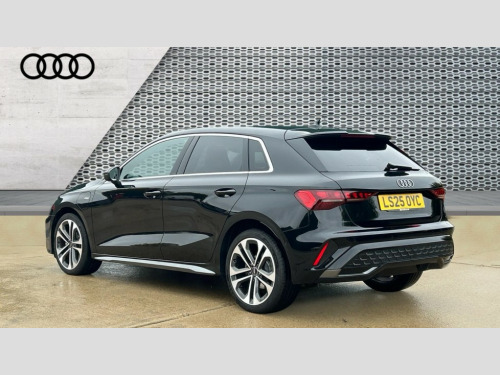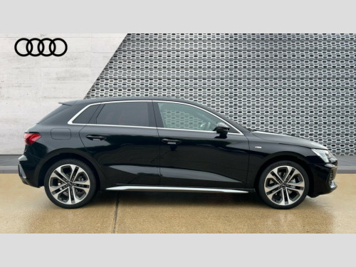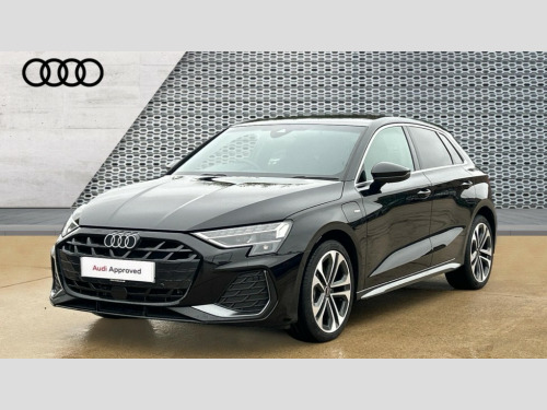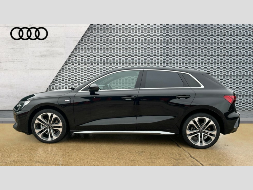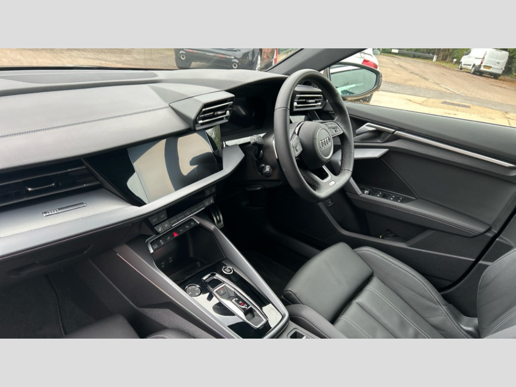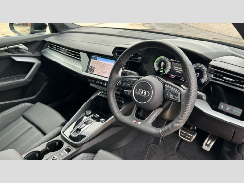 Audi A3 40 TFSI e S Line 5dr S Tronic Adjustable speed limiter, Audi drive select, Audi smartphone interface with app store includes wireless Apple carplay, Android auto and Amazon alexa integration, Audi virtual cockpit plus - 12.3" full HD resolution dynamic digital instrument cluster, Automatic start/stop system with recuperation, Bluetooth interface, Camera based traffic sign recognition, Collision avoidance assistant, Cruise control, Distraction and Fatigue warning, e-Call (emergency call), Electromechanical power speed sensitive steering, Emergency assist, Lane departure warning system, MMI Navigation Plus with high resolution 10.1" colour touch screen display, Park Assist with parking system Plus, Service indicator, Trip computer, Voice control system with natural language interaction, 3 pin 10 amp domestic charging cable, CCS socket for DC charging, Charging cable for public charging, mode 3 (type 2), 32 A, Compact charging system, Industrial connector CEE 32 A, 230 V, length 1.6 m, Standard suspension, Type 2 socket for AC charging, Audi Phonebox light with wireless charging, Audi sound system - 10 loudspeakers including centre loudspeaker and subwoofer, DAB Digital radio, USB ports with charging function in the rear, Acoustic glass windscreen, All weather light, Aluminium window trim, Auto dimming frameless rear view mirror, Automatic dynamic range control, Body colour exterior mirrors, Chrome exhaust tailpipes, Dipped beam, main beam, position light and turning light, Electrically adjustable/heated/folding/auto dimming door mirrors with integrated LED indications + kerb view function for passenger side, Exterior model badging, Front and rear side air inlets in grained matt black with dark liquid chrome frame, Front electric windows, Front radiator grill in high gloss dark chrome, Heat insulating glass windscreen, Illuminated door sills with aluminium inserts at the front with S logo, Intersection light, LED 3rd brake light, LED brake lights, LED daytime running x3, LED headlights with LED rear lights and dynamic rear indicators, LED rear number plate lights, LED reverse light, LED tail lights, Light and rain sensors, Manoeuvring light, Motorway light, Privacy glass - dark tinted rear window, rear door and side windows, Rear diffuser and grill in grained matt black with inlay in dark liquid chrome, Rear electric windows, Rear side wing doors, Rear wiper, S line bumpers, S roof spoiler, Side S line emblems on front wings, Side sill trim in dark liquid chrome, Static Cornering lights, 12V socket and storage compartment in front centre console, 3 seat bench in 2nd row, 3 spoke flat bottomed leather multifunction sport steering wheel with gear shift paddles, 3-zone deluxe automatic air conditioning, 4 way electrically adjustable lumbar support for driver and front passenger, 40/20/40 split folding rear seat bench, Black cloth headlining, Black front and rear floor mats, Convenience auxiliary air conditioning, Front and rear centre armrest in artificial leather with contrasting stitching on armrests and instrument panel, Front and rear headrests, Heated front seats, Height and reach adjustable steering wheel, Manual boot compartment lid, Manually adjustable front seats, Rear centre armrest with cupholder, S badging on the steering wheel, Seat side bolsters, Single front passenger seat, Stainless steel pedals and front footrest in black, Twin leather upholstery with front sports seats S embossed logo, Aluminium interior elements pack - A3, Multi-coloured LED interior lighting package with Multi-coloured contour lighting of instrument panel - A3, 3x3 point rear seat belts, Acoustic vehicle alerting system, Driver and front passenger airbag with passenger airbag deactivation, Electronic Stabilisation Control (ESC) including ABS, ASR and EDL, First aid kit with warning triangle and 2 safety vests, Front side airbags with head airbags and interaction airbag, Hill hold assist, Pre-sense front with pedestrian and cyclist detection, Seatbelt monitoring, Tyre pressure loss indicator, Anti theft alarm, Anti-theft wheel bolts, Electronically operated child locks, Immobiliser, Remote central locking with safelock, Black dashboard, Inlay in dark aluminium spectrum, Tyre repair kit