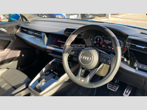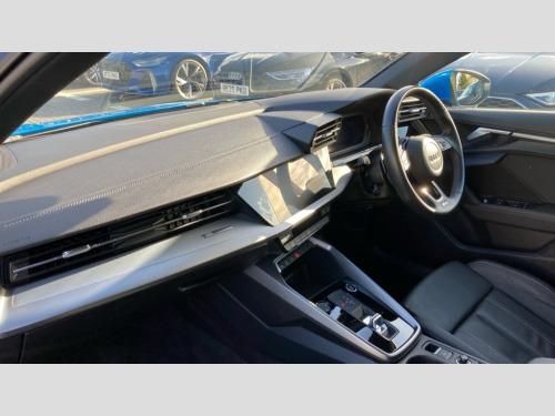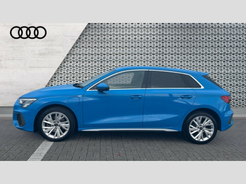 Audi A3 40 TFSI e S Line 5dr S Tronic Audi drive select (Auto, Comfort, Dynamic, Efficiency and Individual), Audi smartphone interface, Audi Virtual Cockpit - 10.25" digital and colour instrument cluster, Automatic start/stop system with recuperation, Bluetooth interface, Camera based traffic sign recognition, Collision avoidance assistant, e-Call (emergency call), Electromechanical power speed sensitive steering, Lane departure warning system, MMI Navigation Plus with high resolution 10.1" colour touch screen display, Service indicator, Trip computer, Voice control system with natural language interaction, 3 pin 10 amp domestic charging cable, 3.6 kw On-board charger, Standard suspension, Type 2 mode 3 32 amp charging cable, Type 2 socket for AC charging, 2xUSB-C connection with data and charging functions, 6 passive loudspeakers, DAB Digital radio, 3rd brake light, Acoustic glass windscreen, Aluminium window trim, Auto dimming frameless rear view mirror, Body colour exterior mirrors, Electrically adjustable/heated/folding/auto dimming door mirrors with integrated LED indications + kerb view function for passenger side, Front electric windows, Illuminated door sills with aluminium inserts at the front with S logo, LED daytime running lights, LED headlights with LED rear lights and dynamic rear indicators, Light and rain sensors, Privacy glass - dark tinted rear window, rear door and side windows, Rear electric windows, Rear side air outlets in grained matt black, Rear side wing doors, Rear wiper, S line bumpers, S roof spoiler, 12V socket and storage compartment in front centre console, 3 seat bench in 2nd row, 3 spoke leather multifunction steering wheel with paddle shift, 4 way electrically adjustable lumbar support for driver and front passenger, 60/40 split folding rear seat bench, Black cloth headlining, Dual zone electronic climate control, Front and rear centre armrest in artificial leather, Front and rear headrests, Front/rear floor mats, Height and reach adjustable steering wheel, Interior lighting - glove compartment light and right hand side, Luggage compartment floor covering, Manual boot compartment lid, Manually adjustable front seats, Seat side bolsters, Single front passenger seat, Stainless steel pedals and front footrest in black, Twin leather upholstery with front sports seats S embossed logo, Aluminium interior elements pack - A3 Sportback, LED interior lighting pack - A3 Sportback, S line styling pack - A3 Sportback, 3x3 point rear seat belts, Driver and front passenger airbag with passenger airbag deactivation, Electronic Stabilisation Control (ESC) including ABS, ASR and EDL, First aid kit with warning triangle and 2 safety vests, Front side airbags with head airbags and interaction airbag, Pre-sense front with pedestrian and cyclist detection, Seatbelt monitoring, Tyre pressure loss indicator, Anti theft alarm, Anti-theft wheel bolts, Electronically operated child locks, Immobiliser, Remote control central locking, Dark spectrum aluminium inlays, accent surfaces in the dashboard and centre console in platinum grey silk effect paint finish, Tool kit, Tyre repair kit