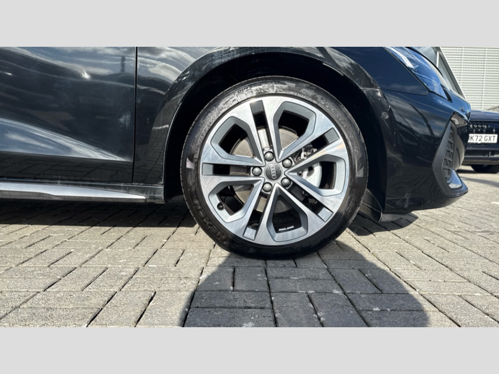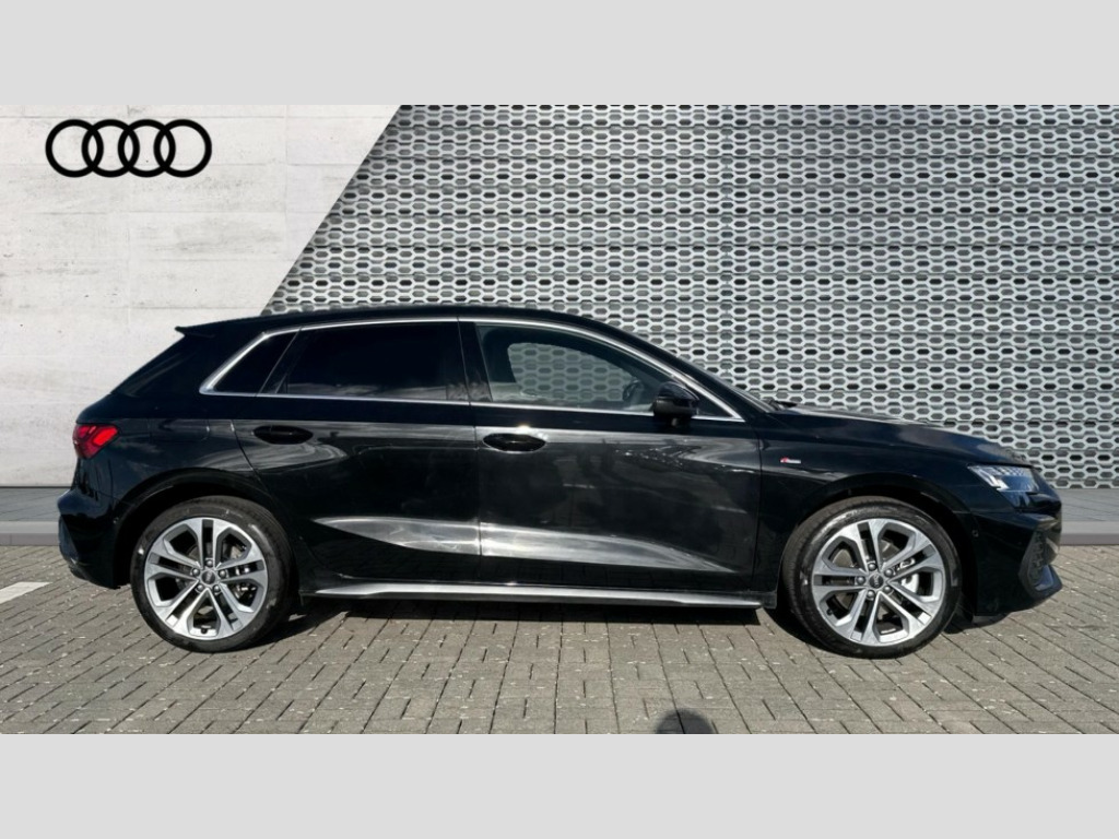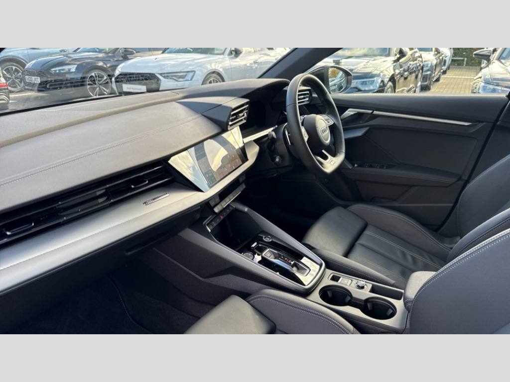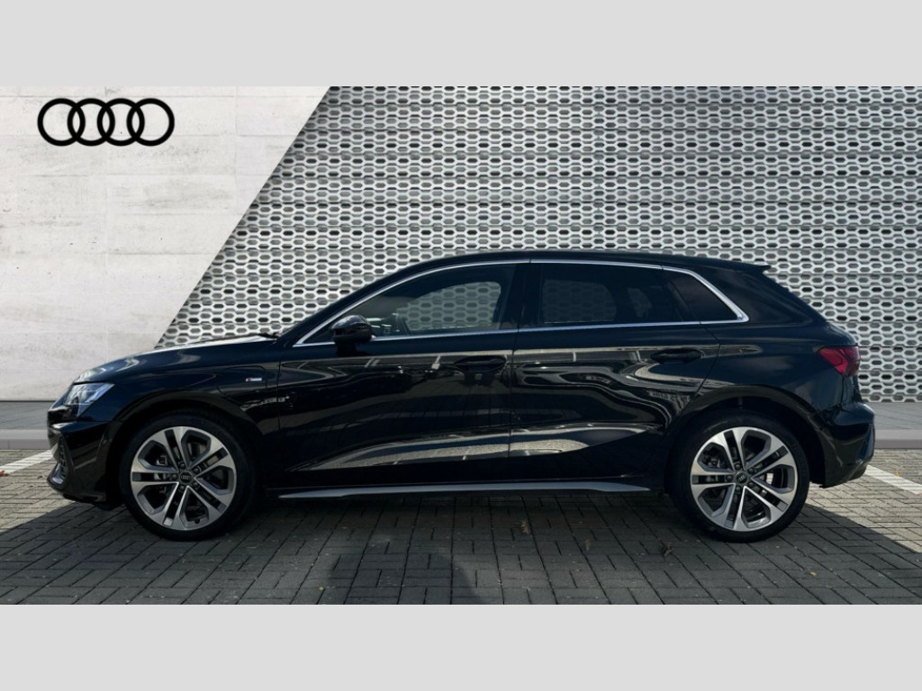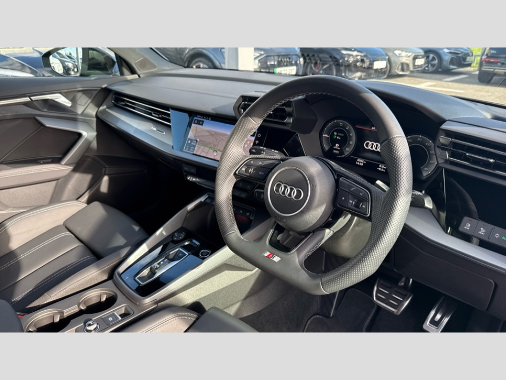 Audi A3 40 TFSI e S Line 5dr S Tronic Adjustable speed limiter, Audi drive select, Audi smartphone interface with app store includes wireless Apple carplay, Android auto and Amazon alexa integration, Audi virtual cockpit plus - 12.3" full HD resolution dynamic digital instrument cluster, Automatic start/stop system with recuperation, Bluetooth interface, Camera based traffic sign recognition, Collision avoidance assistant, Cruise control, Distraction and Fatigue warning, e-Call (emergency call), Electromechanical power speed sensitive steering, Emergency assist, Lane departure warning system, MMI Navigation Plus with high resolution 10.1" colour touch screen display, Park Assist with parking system Plus, Service indicator, Trip computer, Voice control system with natural language interaction, 3 pin 10 amp domestic charging cable, CCS socket for DC charging, Charging cable for public charging, mode 3 (type 2), 32 A, Compact charging system, Industrial connector CEE 32 A, 230 V, length 1.6 m, Standard suspension, Type 2 socket for AC charging, Audi Phonebox light with wireless charging, Audi sound system - 10 loudspeakers including centre loudspeaker and subwoofer, DAB Digital radio, USB ports with charging function in the rear, Acoustic glass windscreen, All weather light, Aluminium window trim, Auto dimming frameless rear view mirror, Automatic dynamic range control, Body colour exterior mirrors, Chrome exhaust tailpipes, Dipped beam, main beam, position light and turning light, Electrically adjustable/heated/folding/auto dimming door mirrors with integrated LED indications + kerb view function for passenger side, Exterior model badging, Front and rear side air inlets in grained matt black with dark liquid chrome frame, Front electric windows, Front radiator grill in high gloss dark chrome, Heat insulating glass windscreen, Illuminated door sills with aluminium inserts at the front with S logo, Intersection light, LED 3rd brake light, LED brake lights, LED daytime running x3, LED headlights with LED rear lights and dynamic rear indicators, LED rear number plate lights, LED reverse light, LED tail lights, Light and rain sensors, Manoeuvring light, Motorway light, Privacy glass - dark tinted rear window, rear door and side windows, Rear diffuser and grill in grained matt black with inlay in dark liquid chrome, Rear electric windows, Rear side wing doors, Rear wiper, S line bumpers, S roof spoiler, Side S line emblems on front wings, Side sill trim in dark liquid chrome, Static Cornering lights, 12V socket and storage compartment in front centre console, 3 seat bench in 2nd row, 3 spoke flat bottomed leather multifunction sport steering wheel with gear shift paddles, 3-zone deluxe automatic air conditioning, 4 way electrically adjustable lumbar support for driver and front passenger, 40/20/40 split folding rear seat bench, Black cloth headlining, Black front and rear floor mats, Convenience auxiliary air conditioning, Front and rear centre armrest in artificial leather with contrasting stitching on armrests and instrument panel, Front and rear headrests, Heated front seats, Height and reach adjustable steering wheel, Manual boot compartment lid, Manually adjustable front seats, Rear centre armrest with cupholder, S badging on the steering wheel, Seat side bolsters, Single front passenger seat, Stainless steel pedals and front footrest in black, Twin leather upholstery with front sports seats S embossed logo, Aluminium interior elements pack - A3, Multi-coloured LED interior lighting package with Multi-coloured contour lighting of instrument panel - A3, 3x3 point rear seat belts, Acoustic vehicle alerting system, Driver and front passenger airbag with passenger airbag deactivation, Electronic Stabilisation Control (ESC) including ABS, ASR and EDL, First aid kit with warning triangle and 2 safety vests, Front side airbags with head airbags and interaction airbag, Hill hold assist, Pre-sense front with pedestrian and cyclist detection, Seatbelt monitoring, Tyre pressure loss indicator, Anti theft alarm, Anti-theft wheel bolts, Electronically operated child locks, Immobiliser, Remote central locking with safelock, Black dashboard, Inlay in dark aluminium spectrum, Tyre repair kit