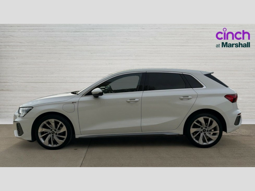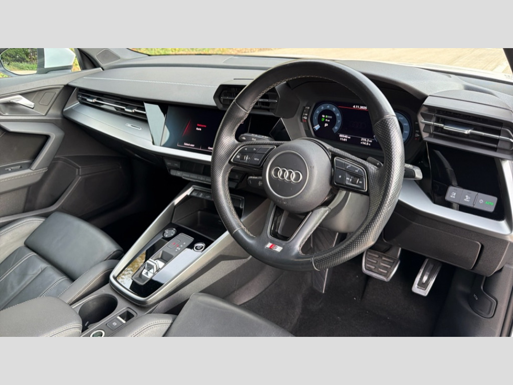 Audi A3 40 TFSI e S Line 5dr S Tronic Audi connect emergency call and service, Audi drive select (Auto, Comfort, Dynamic, Efficiency and Individual), Audi smartphone interface, Audi Virtual Cockpit - 10.25" digital and colour instrument cluster, Automatic start/stop system with recuperation, Bluetooth interface, Collision avoidance assistant, Electromechanical power speed sensitive steering, Lane departure warning system, MMI Navigation Plus with high resolution 10.1" colour touch screen display, Service indicator, Trip computer, Voice control system with natural language interaction, 3 pin 10 amp domestic charging cable, Type 2 mode 3 32 amp charging cable, Type 2 socket for AC charging, 2xUSB-C connection with data and charging functions, 6 passive loudspeakers, DAB Digital radio, Acoustic glass windscreen, Aluminium window trim, Auto dimming frameless rear view mirror, Electrically adjustable/heated/folding/auto dimming door mirrors with integrated LED indications + kerb view function for passenger side, Front electric windows, Illuminated aluminium inserts front door sills with S logo, LED daytime running lights, LED headlights with LED rear lights and dynamic rear indicators, Light and rain sensors, Privacy glass - dark tinted rear window, rear door and side windows, Rear electric windows, Rear side air outlets in grained matt black, Rear wiper, S line bumpers, S roof spoiler, 12V socket and storage compartment in front centre console, 40/20/40 split folding rear seat bench with cupholder, Black cloth headlining, Dual zone electronic climate control, Front and rear centre armrest in leather, Front and rear headrests, Front/rear floor mats, Height and reach adjustable steering wheel, Interior lighting - glove compartment light and right hand side, Luggage compartment floor covering, Manual boot compartment lid, Manually adjustable front seats, Seat side bolsters, Stainless steel pedals and front footrest, Twin leather upholstery with front sports seats S embossed logo, Aluminium interior elements pack - A3 Sportback, S line styling pack - A3 Sportback, 3x3 point rear seat belts, Driver and front passenger airbag with passenger airbag deactivation, Electronic Stabilisation Control (ESC) including ABS, ASR and EDL, First aid kit with warning triangle and 2 safety vests, Front side airbags with head airbags and interaction airbag, Hill hold assist, Pre-sense front with pedestrian and cyclist detection, Seatbelt monitoring, Tyre pressure loss indicator, Anti theft alarm, Anti-theft wheel bolts, Electronically operated child lock, Immobiliser, Remote control central locking, Accent surfaces in the dashboard and centre console in platinum grey silk effect paint finish, Dark spectrum aluminium inlays, Tool kit, Tyre repair kit