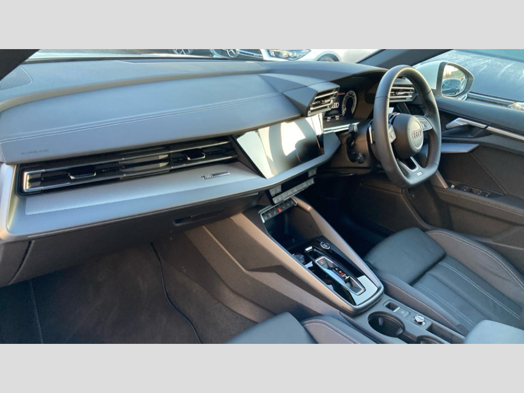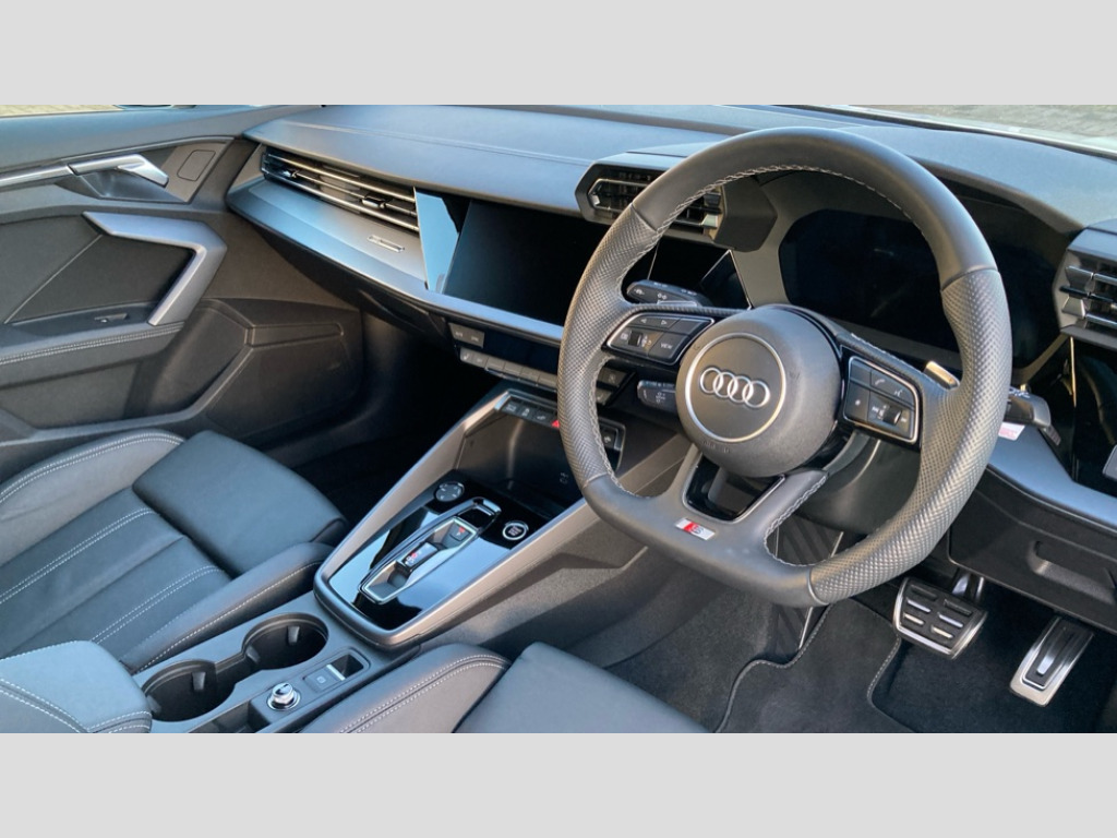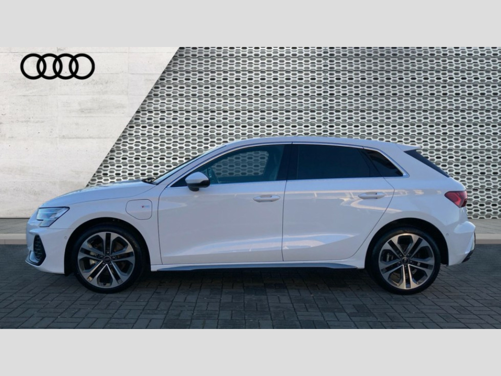 Audi A3 40 TFSI e S Line 5dr S Tronic Adjustable speed limiter, Audi drive select, Audi smartphone interface with app store includes wireless Apple carplay, Android auto and Amazon alexa integration, Audi virtual cockpit plus - 12.3" full HD resolution dynamic digital instrument cluster, Automatic start/stop system with recuperation, Bluetooth interface, Camera based traffic sign recognition, Collision avoidance assistant, Cruise control, Distraction and Fatigue warning, e-Call (emergency call), Electromechanical power speed sensitive steering, Lane departure warning system, MMI Navigation Plus with high resolution 10.1" colour touch screen display, Park Assist with parking system Plus, Service indicator, Trip computer, Voice control system with natural language interaction, 3 pin 10 amp domestic charging cable, CCS socket for DC charging, Charging cable for public charging, mode 3 (type 2), up to 22 kW (AC), Compact charging system, Industrial connector CEE 32 A, 230 V, length 1.6 m, Standard suspension, Type 2 socket for AC charging, Audi Phonebox light with wireless charging, Audi sound system - 10 loudspeakers including centre loudspeaker and subwoofer, DAB Digital radio, USB ports with charging function in the rear, Acoustic glass windscreen, Aluminium window trim, Auto dimming frameless rear view mirror, Body colour exterior mirrors, Chrome exhaust tailpipes, Electrically adjustable/heated/folding/auto dimming door mirrors with integrated LED indications + kerb view function for passenger side, Exterior model badging, Front and rear side air inlets in grained matt black with dark liquid chrome frame, Front electric windows, Front radiator grill in high gloss dark chrome, Heat insulating glass windscreen, Illuminated door sills with aluminium inserts at the front with S logo, LED 3rd brake light, LED daytime running lights, LED headlights with LED rear lights and dynamic rear indicators, Light and rain sensors, Privacy glass - dark tinted rear window, rear door and side windows, Rear diffuser and grill in grained matt black with inlay in dark liquid chrome, Rear electric windows, Rear side wing doors, Rear wiper, S line bumpers, S roof spoiler, Side S line emblems on front wings, Side sill trim in dark liquid chrome, 12V socket and storage compartment in front centre console, 3 seat bench in 2nd row, 3 spoke flat bottomed leather multifunction sport steering wheel with gear shift paddles, 3-zone deluxe automatic air conditioning, 4 way electrically adjustable lumbar support for driver and front passenger, 40/20/40 split folding rear seat bench, Black cloth headlining, Convenience auxiliary air conditioning, Front and rear centre armrest in artificial leather, Front and rear centre armrest in artificial leather with contrasting stitching on armrests and instrument panel, Front and rear headrests, Front/rear floor mats, Heated front seats, Height and reach adjustable steering wheel, Manual boot compartment lid, Manually adjustable front seats, Rear cup holders, S badging on the steering wheel, Seat side bolsters, Single front passenger seat, Stainless steel pedals and front footrest in black, Twin leather upholstery with front sports seats S embossed logo, Aluminium interior elements pack - A3 Sportback, Multi-coloured LED interior lighting package - A3, 3x3 point rear seat belts, Acoustic vehicle alerting system, Driver and front passenger airbag with passenger airbag deactivation, Electronic Stabilisation Control (ESC) including ABS, ASR and EDL, First aid kit with warning triangle and 2 safety vests, Front side airbags with head airbags and interaction airbag, Hill hold assist, Pre-sense front with pedestrian and cyclist detection, Seatbelt monitoring, Tyre pressure loss indicator, Anti theft alarm, Anti-theft wheel bolts, Electronically operated child locks, Immobiliser, Remote central locking with safelock, Dash & door Inlay in dark aluminium Spectrum, Tyre repair kit