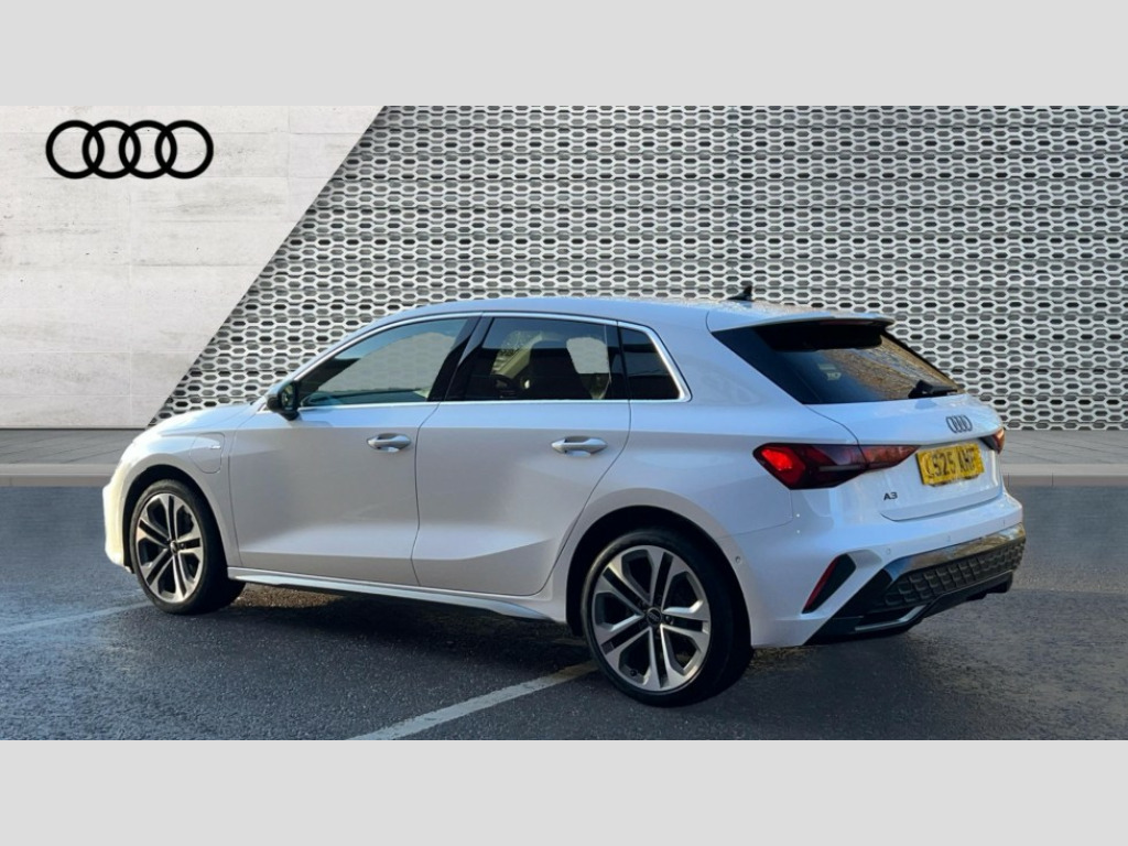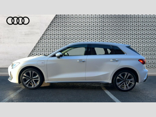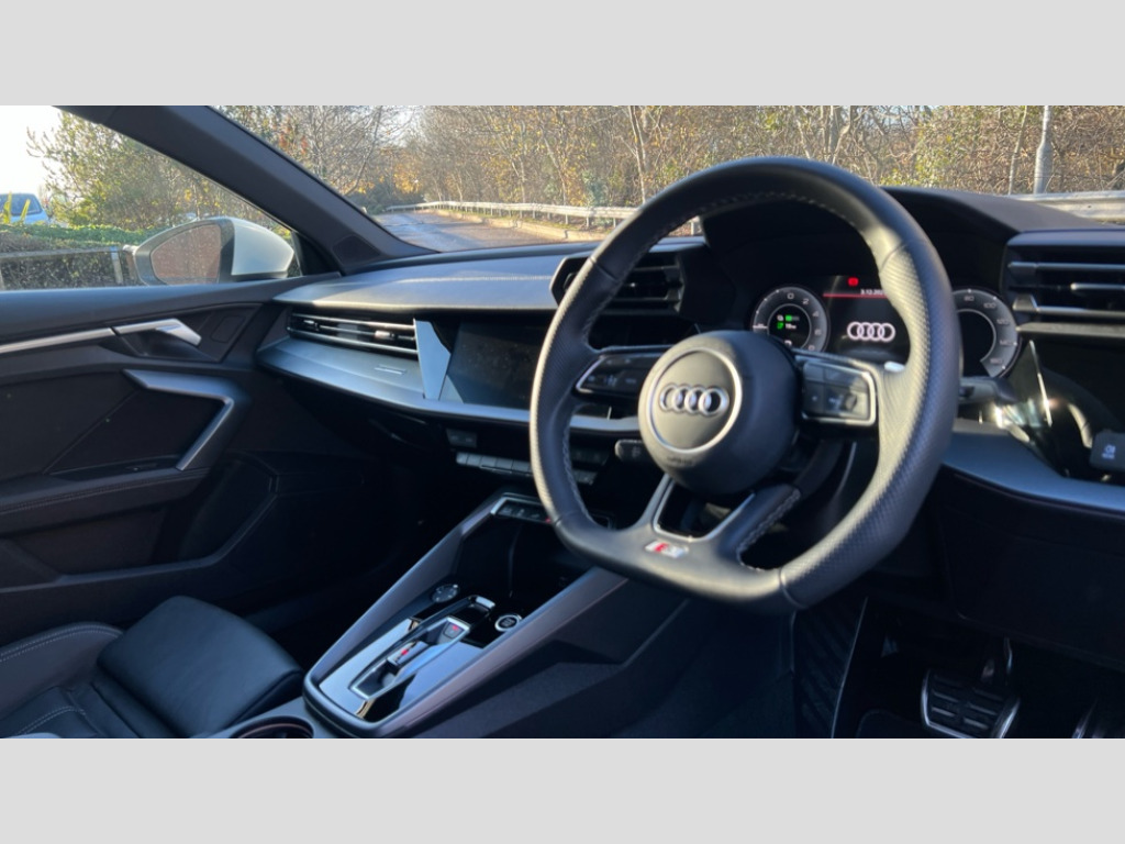 Audi A3 40 TFSI e S Line 5dr S Tronic Adjustable speed limiter, Audi drive select, Audi smartphone interface with app store includes wireless Apple carplay, Android auto and Amazon alexa integration, Audi virtual cockpit plus - 12.3" full HD resolution dynamic digital instrument cluster, Automatic start/stop system with recuperation, Bluetooth interface, Camera based traffic sign recognition, Collision avoidance assistant, Cruise control, Distraction and Fatigue warning, e-Call (emergency call), Electromechanical power speed sensitive steering, Lane departure warning system, MMI Navigation Plus with high resolution 10.1" colour touch screen display, Park Assist with parking system Plus, Service indicator, Trip computer, Voice control system with natural language interaction, 3 pin 10 amp domestic charging cable, CCS socket for DC charging, Charging cable for public charging, mode 3 (type 2), up to 22 kW (AC), Compact charging system, Industrial connector CEE 32 A, 230 V, length 1.6 m, Standard suspension, Type 2 socket for AC charging, Audi Phonebox light with wireless charging, Audi sound system - 10 loudspeakers including centre loudspeaker and subwoofer, DAB Digital radio, USB ports with charging function in the rear, Acoustic glass windscreen, Aluminium window trim, Auto dimming frameless rear view mirror, Body colour exterior mirrors, Chrome exhaust tailpipes, Electrically adjustable/heated/folding/auto dimming door mirrors with integrated LED indications + kerb view function for passenger side, Exterior model badging, Front and rear side air inlets in grained matt black with dark liquid chrome frame, Front electric windows, Front radiator grill in high gloss dark chrome, Heat insulating glass windscreen, Illuminated door sills with aluminium inserts at the front with S logo, LED 3rd brake light, LED daytime running lights, LED headlights with LED rear lights and dynamic rear indicators, Light and rain sensors, Privacy glass - dark tinted rear window, rear door and side windows, Rear diffuser and grill in grained matt black with inlay in dark liquid chrome, Rear electric windows, Rear side wing doors, Rear wiper, S line bumpers, S roof spoiler, Side S line emblems on front wings, Side sill trim in dark liquid chrome, 12V socket and storage compartment in front centre console, 3 seat bench in 2nd row, 3 spoke flat bottomed leather multifunction sport steering wheel with gear shift paddles, 3-zone deluxe automatic air conditioning, 4 way electrically adjustable lumbar support for driver and front passenger, 40/20/40 split folding rear seat bench, Black cloth headlining, Convenience auxiliary air conditioning, Front and rear centre armrest in artificial leather, Front and rear centre armrest in artificial leather with contrasting stitching on armrests and instrument panel, Front and rear headrests, Front/rear floor mats, Heated front seats, Height and reach adjustable steering wheel, Manual boot compartment lid, Manually adjustable front seats, Rear cup holders, S badging on the steering wheel, Seat side bolsters, Single front passenger seat, Stainless steel pedals and front footrest in black, Twin leather upholstery with front sports seats S embossed logo, Aluminium interior elements pack - A3 Sportback, Multi-coloured LED interior lighting package - A3, 3x3 point rear seat belts, Acoustic vehicle alerting system, Driver and front passenger airbag with passenger airbag deactivation, Electronic Stabilisation Control (ESC) including ABS, ASR and EDL, First aid kit with warning triangle and 2 safety vests, Front side airbags with head airbags and interaction airbag, Hill hold assist, Pre-sense front with pedestrian and cyclist detection, Seatbelt monitoring, Tyre pressure loss indicator, Anti theft alarm, Anti-theft wheel bolts, Electronically operated child locks, Immobiliser, Remote central locking with safelock, Dash & door Inlay in dark aluminium Spectrum, Tyre repair kit