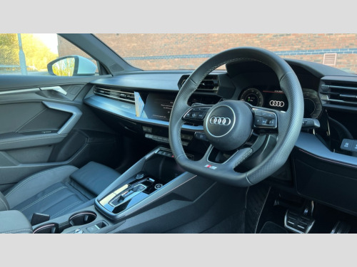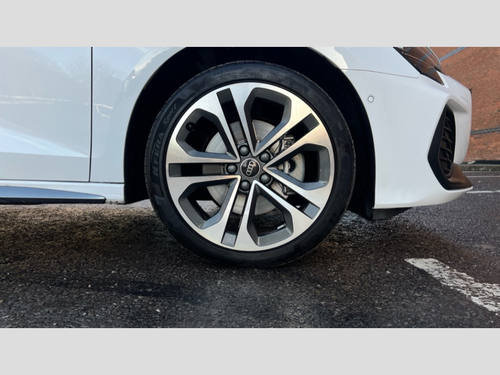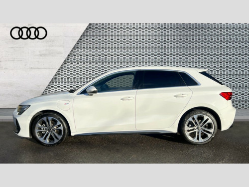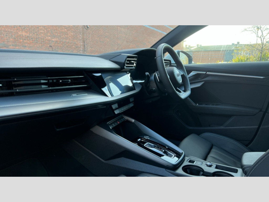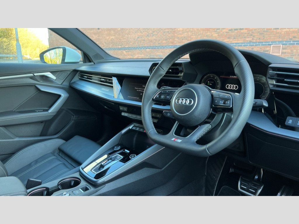 Audi A3 40 TFSI e S Line 5dr S Tronic Adjustable speed limiter, Audi drive select, Audi smartphone interface with app store includes wireless Apple carplay, Android auto and Amazon alexa integration, Audi virtual cockpit plus - 12.3" full HD resolution dynamic digital instrument cluster, Automatic start/stop system with recuperation, Bluetooth interface, Camera based traffic sign recognition, Collision avoidance assistant, Cruise control, Distraction and Fatigue warning, e-Call (emergency call), Electromechanical power speed sensitive steering, Emergency assist, Lane departure warning system, MMI Navigation Plus with high resolution 10.1" colour touch screen display, Park Assist with parking system Plus, Service indicator, Trip computer, Voice control system with natural language interaction, 3 pin 10 amp domestic charging cable, CCS socket for DC charging, Charging cable for public charging, mode 3 (type 2), 32 A, Compact charging system, Industrial connector CEE 32 A, 230 V, length 1.6 m, Standard suspension, Type 2 socket for AC charging, Audi Phonebox light with wireless charging, Audi sound system - 10 loudspeakers including centre loudspeaker and subwoofer, DAB Digital radio, USB ports with charging function in the rear, Acoustic glass windscreen, All weather light, Aluminium window trim, Auto dimming frameless rear view mirror, Automatic dynamic range control, Body colour exterior mirrors, Chrome exhaust tailpipes, Dipped beam, main beam, position light and turning light, Electrically adjustable/heated/folding/auto dimming door mirrors with integrated LED indications + kerb view function for passenger side, Exterior model badging, Front and rear side air inlets in grained matt black with dark liquid chrome frame, Front electric windows, Front radiator grill in high gloss dark chrome, Heat insulating glass windscreen, Illuminated door sills with aluminium inserts at the front with S logo, Intersection light, LED 3rd brake light, LED brake lights, LED daytime running x3, LED headlights with LED rear lights and dynamic rear indicators, LED rear number plate lights, LED reverse light, LED tail lights, Light and rain sensors, Manoeuvring light, Motorway light, Privacy glass - dark tinted rear window, rear door and side windows, Rear diffuser and grill in grained matt black with inlay in dark liquid chrome, Rear electric windows, Rear side wing doors, Rear wiper, S line bumpers, S roof spoiler, Side S line emblems on front wings, Side sill trim in dark liquid chrome, Static cornering light, 12V socket and storage compartment in front centre console, 3 seat bench in 2nd row, 3 spoke flat bottomed leather multifunction sport steering wheel with gear shift paddles, 3-zone deluxe automatic air conditioning, 4 way electrically adjustable lumbar support for driver and front passenger, 40/20/40 split folding rear seat bench, Black cloth headlining, Black front and rear floor mats, Convenience auxiliary air conditioning, Front and rear centre armrest in artificial leather with contrasting stitching on armrests and instrument panel, Front and rear headrests, Heated front seats, Height and reach adjustable steering wheel, Manual boot compartment lid, Manually adjustable front seats, Rear centre armrest with cupholder, S badging on the steering wheel, Seat side bolsters, Single front passenger seat, Stainless steel pedals and front footrest in black, Twin leather upholstery with front sports seats S embossed logo, Aluminium interior elements pack - A3, Multi-coloured LED interior lighting package with Multi-coloured contour lighting of instrument panel - A3, 3x3 point rear seat belts, Acoustic vehicle alerting system, Driver and front passenger airbag with passenger airbag deactivation, Electronic Stabilisation Control (ESC) including ABS, ASR and EDL, First aid kit with warning triangle and 2 safety vests, Front side airbags with head airbags and interaction airbag, Hill hold assist, Pre-sense front with pedestrian and cyclist detection, Seatbelt monitoring, Tyre pressure loss indicator, Anti theft alarm, Anti-theft wheel bolts, Electronically operated child locks, Immobiliser, Remote central locking with safelock, Black dashboard, Inlay in dark aluminium spectrum, Tyre repair kit