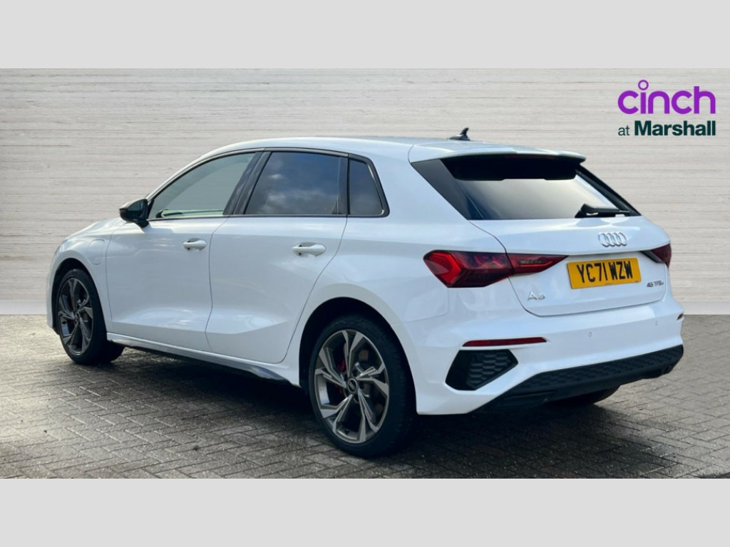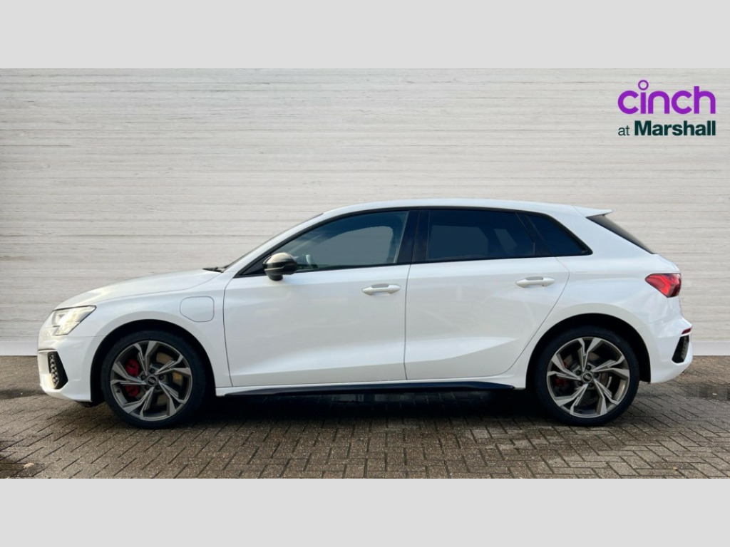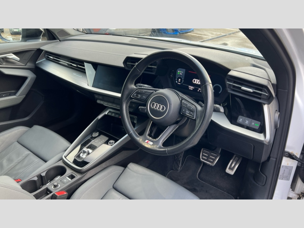 Audi A3 45 TFSI e S Line Competition 5dr S Tronic Audi connect emergency call and service, Audi drive select (Auto, Comfort, Dynamic, Efficiency and Individual), Audi smartphone interface, Audi Virtual Cockpit - 10.25" digital and colour instrument cluster, Automatic start/stop system with recuperation, Bluetooth interface, Collision avoidance assistant, Electromechanical power speed sensitive steering, Lane departure warning system, MMI Navigation Plus with high resolution 10.1" colour touch screen display, Service indicator, Trip computer, Voice control system with natural language interaction, 3 pin 10 amp domestic charging cable, Standard suspension, Type 2 mode 3 32 amp charging cable, Type 2 socket for AC charging, 2xUSB-C connection with data and charging functions, 6 passive loudspeakers, DAB Digital radio, 3rd brake light, Acoustic glass windscreen, Aluminium window trim, Auto dimming frameless rear view mirror, Electrically adjustable/heated/folding/auto dimming door mirrors with integrated LED indications + kerb view function for passenger side, Front electric windows, Illuminated aluminium inserts front door sills with S logo, LED daytime running lights, LED headlights with LED rear lights and dynamic rear indicators, Light and rain sensors, Privacy glass - dark tinted rear window, rear door and side windows, Rear electric windows, Rear side air outlets in grained matt black, Rear wiper, S line bumpers, S roof spoiler, 12V socket and storage compartment in front centre console, 40/20/40 split folding rear seat bench with cupholder, Black cloth headlining, Dual zone electronic climate control, Front and rear centre armrest in leather, Front and rear headrests, Front/rear floor mats, Height and reach adjustable steering wheel, Interior lighting - glove compartment light and right hand side, Luggage compartment floor covering, Manual boot compartment lid, Manually adjustable front seats, Seat side bolsters, Stainless steel pedals and front footrest, Twin leather upholstery with front sports seats S embossed logo, Aluminium interior elements pack - A3 Sportback, Black styling pack - A3 Sportback, S line styling pack - A3 Sportback, 3x3 point rear seat belts, Driver and front passenger airbag with passenger airbag deactivation, Electronic Stabilisation Control (ESC) including ABS, ASR and EDL, First aid kit with warning triangle and 2 safety vests, Front side airbags with head airbags and interaction airbag, Hill hold assist, Pre-sense front with pedestrian and cyclist detection, Red brake calipers, Seatbelt monitoring, Tyre pressure loss indicator, Anti theft alarm, Anti-theft wheel bolts, Electronically operated child lock, Immobiliser, Remote control central locking, Accent surfaces in the dashboard and centre console in platinum grey silk effect paint finish, Dark spectrum aluminium inlays, Tool kit, Tyre repair kit